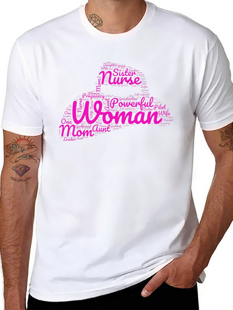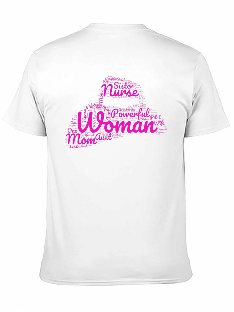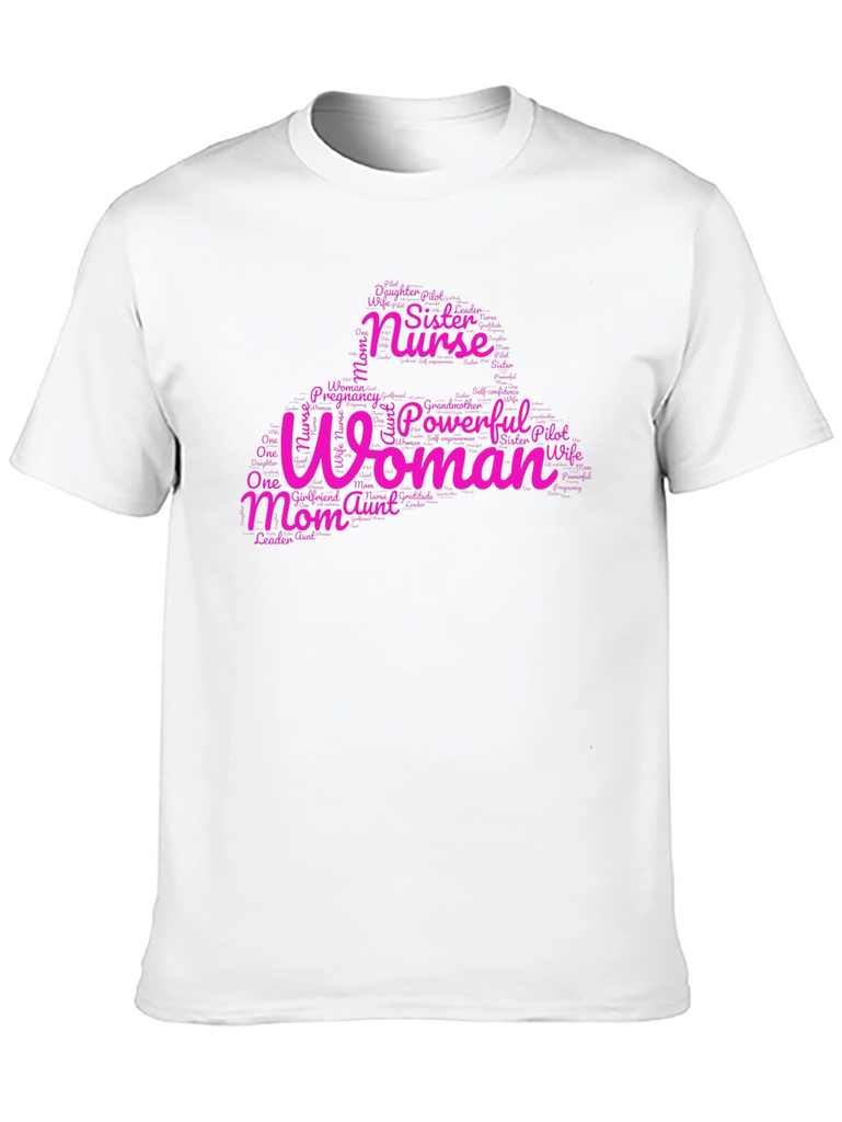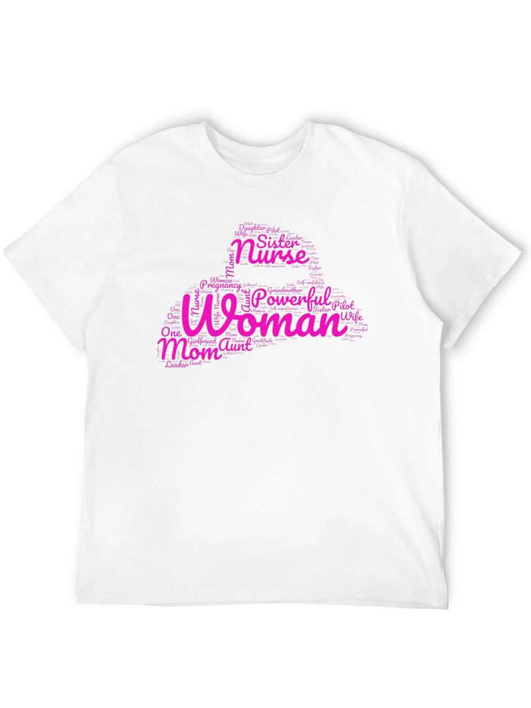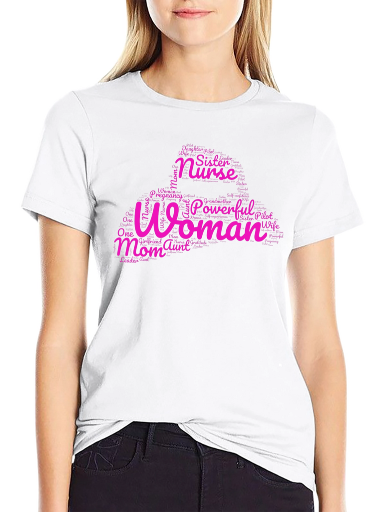 Celebrate the amazing women in your life with this unique graphic t-shirt! Featuring a creative word art design in vibrant pink against a classic black backdrop, this tee spells out powerful words like "Woman", "Nurse", "Sister", and "Mom". The words are arranged in a stylish, eye-catching silhouette. Made from a comfortable and durable fabric blend, this t-shirt is perfect for everyday wear. Show your appreciation for the strong and inspiring women who make a difference. This t-shirt makes a thoughtful gift for birthdays, Mother's Day, graduations, or any special occasion. Wear it with pride and let your shirt do the talking! Available in various sizes.