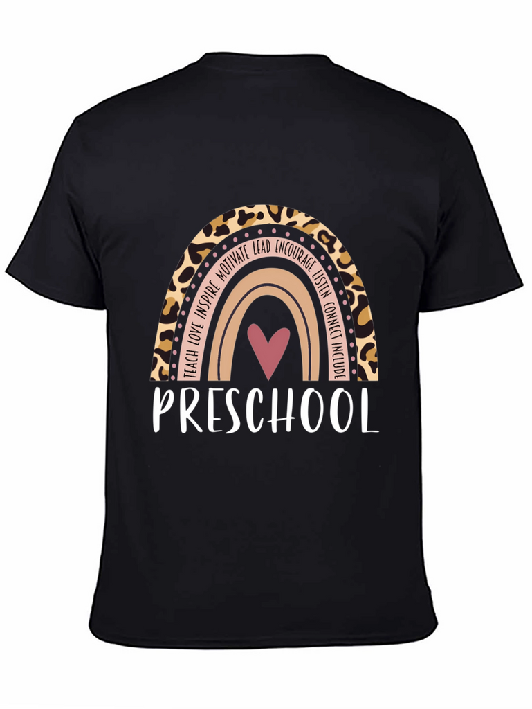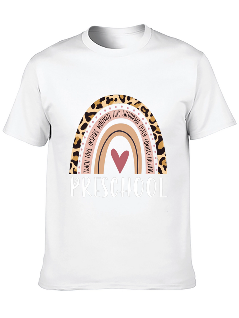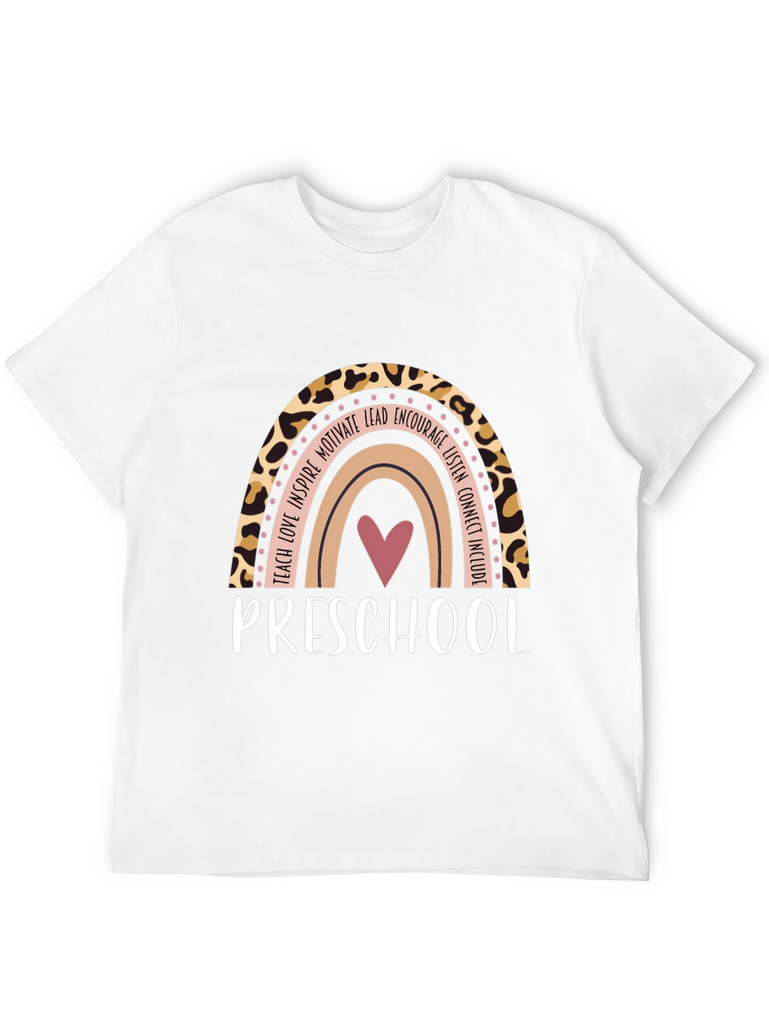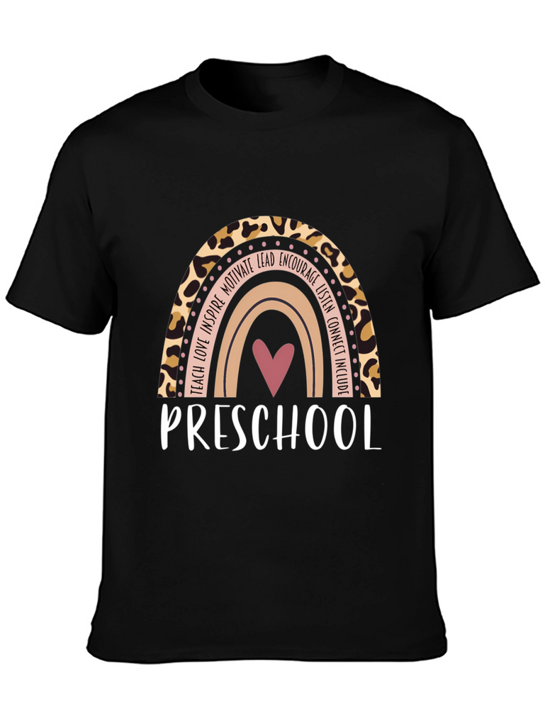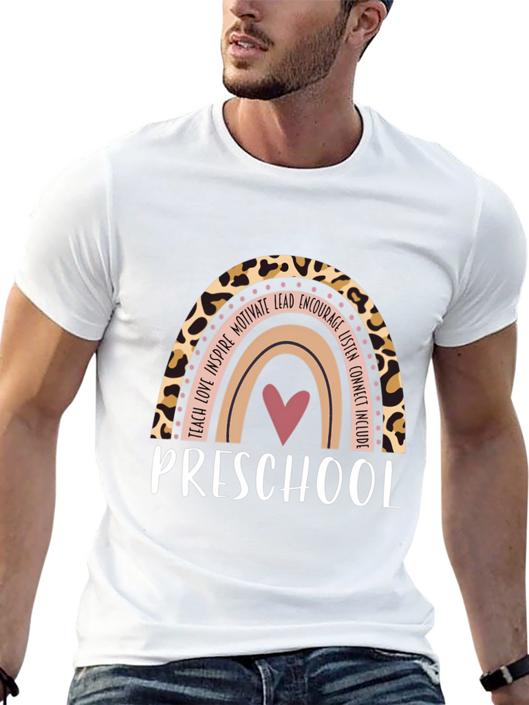 Show your love for early childhood education with this stylish preschool teacher t-shirt. This tee features a unique rainbow design with a leopard print top and motivational words. A heart accents the rainbow and 'PRESCHOOL' is printed below. Perfect for educators who inspire, lead, and encourage their students. Wear it to school, casual outings, or teacher appreciation events. Made from a comfortable fabric, this t-shirt is both fashionable and functional. Grab yours today and make a statement!