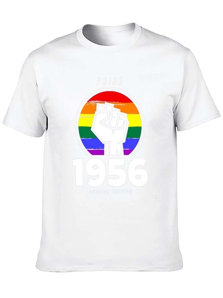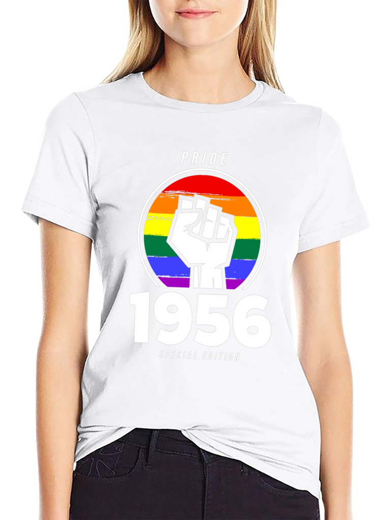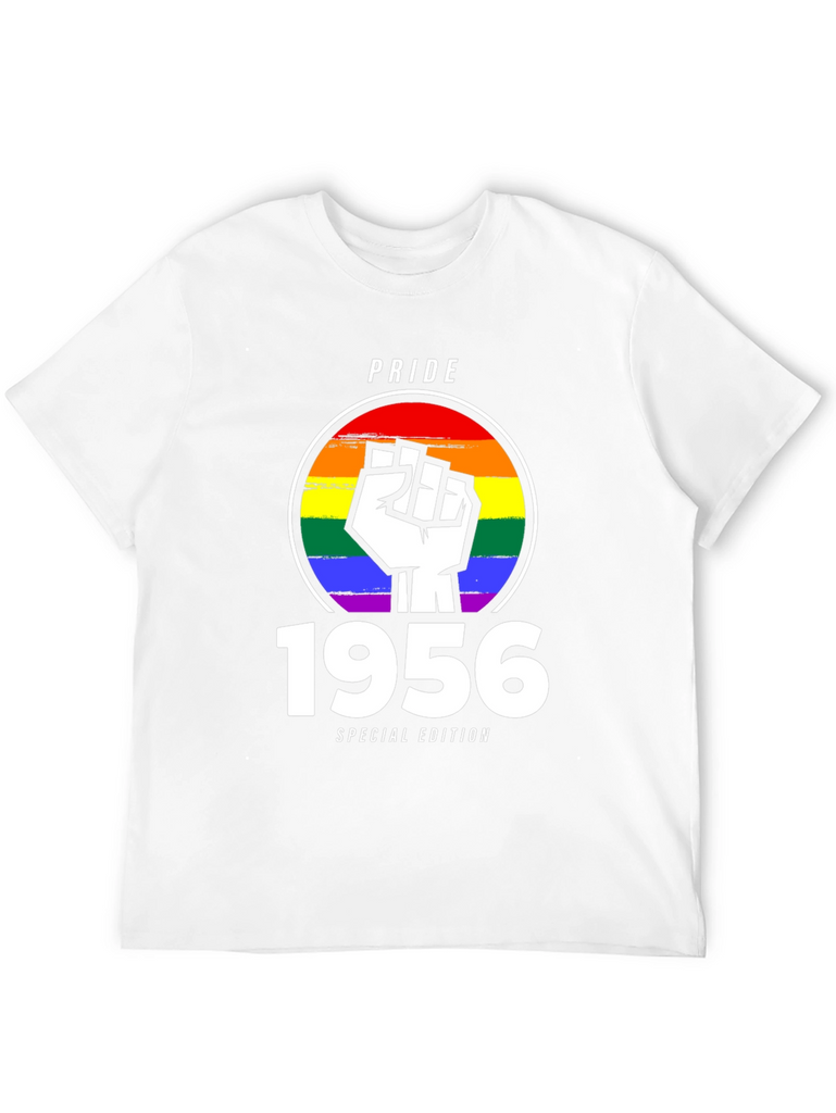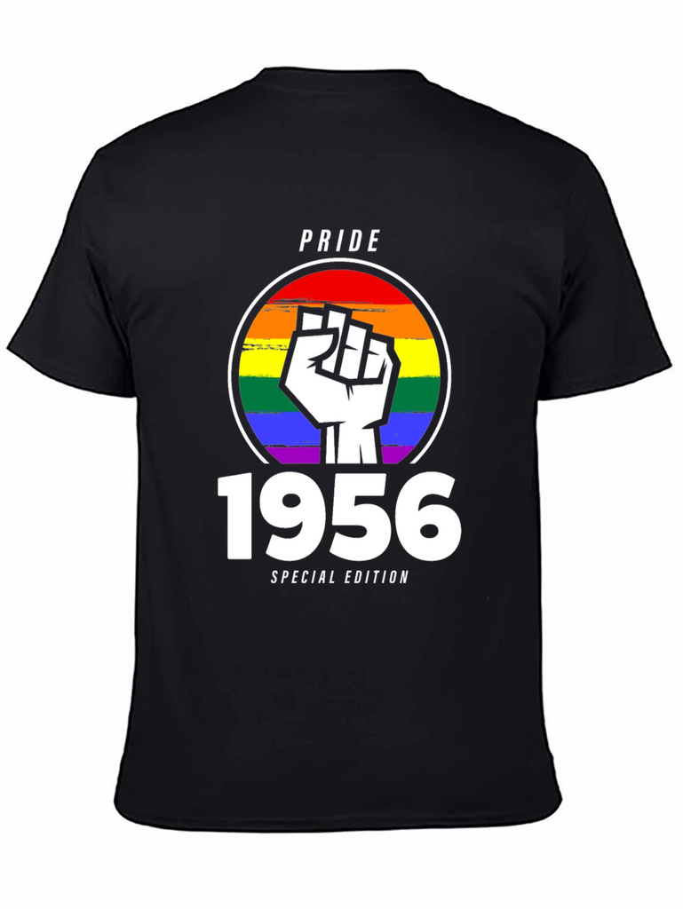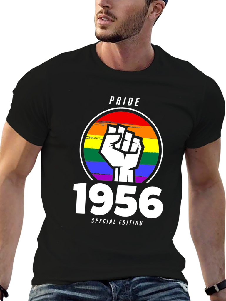 Celebrate Pride with this unique 1956 Special Edition t-shirt. The design features a bold, white fist emblem superimposed over a vibrant rainbow circle, symbolizing solidarity and support for the LGBTQ+ community. Above the design is "PRIDE" text. Below the design is the year "1956" and "SPECIAL EDITION" text. Made from comfortable, breathable black fabric, this tee is perfect for everyday wear or for making a statement at Pride events and rallies. Show your support and wear your pride with this eye-catching and meaningful shirt. A perfect gift for those celebrating a 1956 milestone, or for anyone wanting to show support for LGBTQ+.