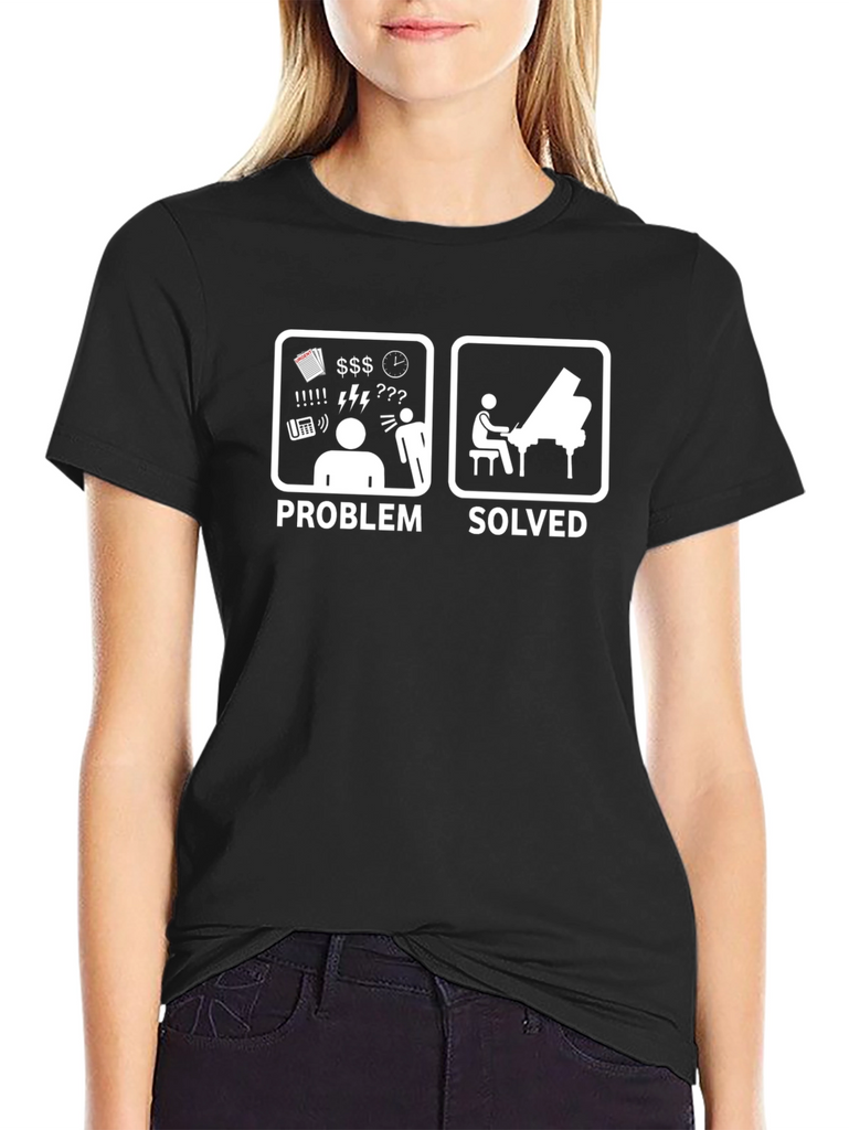 This stylish black t-shirt features a humorous graphic that illustrates the power of music to solve problems. On one side, a square depicts a person surrounded by work-related stress symbols, labeled "PROBLEM." On the other side, another square shows a person playing a piano, labeled "SOLVED." This shirt is perfect for musicians, music lovers, or anyone who finds solace and stress relief through playing or listening to music. Made from comfortable fabric, this tee is ideal for casual wear, concerts, rehearsals, or as a thoughtful gift for the pianist in your life. Show off your love for music and your sense of humor with this unique and eye-catching t-shirt.