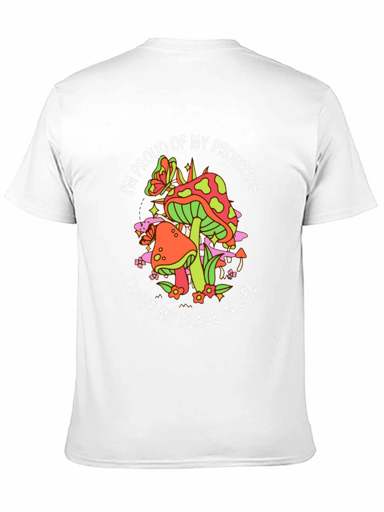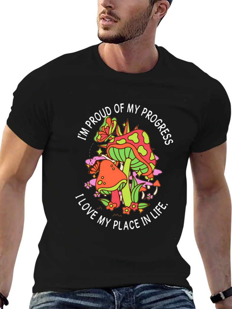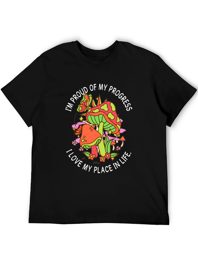 Show off your positive vibes with this stylish black t-shirt! It features a vibrant graphic of whimsical mushrooms and a butterfly, surrounded by a message of self-love and progress. Made from a comfortable fabric blend, this tee is perfect for everyday wear. The retro-inspired design adds a unique touch to any outfit. Wear it while exploring the outdoors, hanging out with friends, or just relaxing at home. Let this cheerful shirt be a reminder to appreciate your journey in life. It’s sure to be a conversation starter!