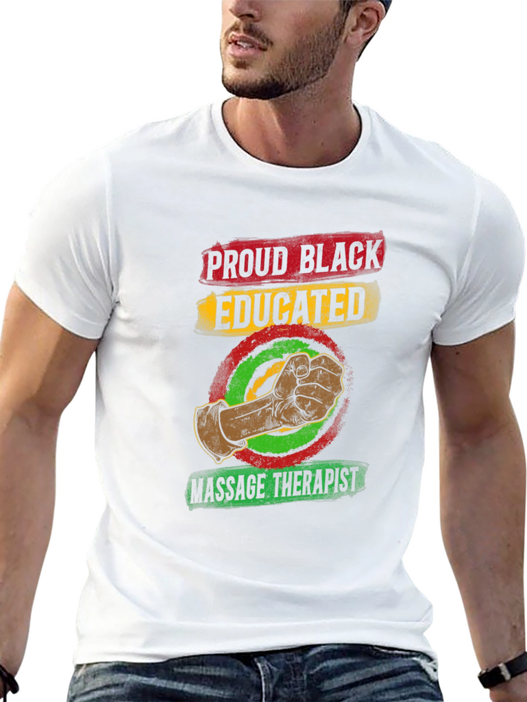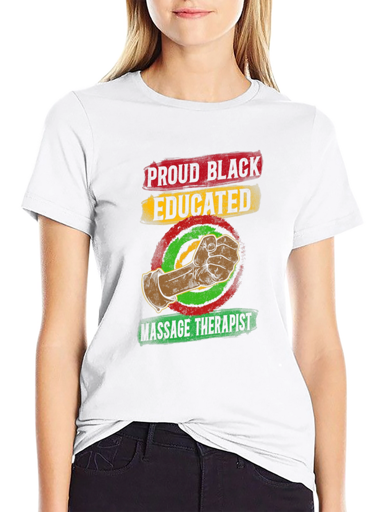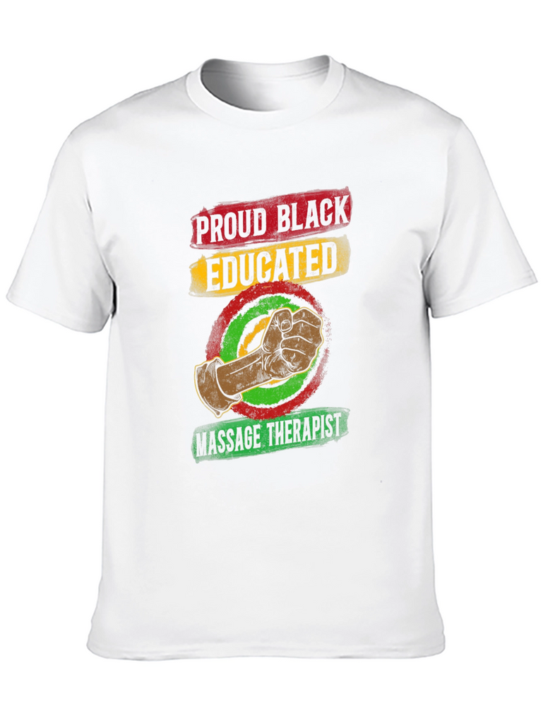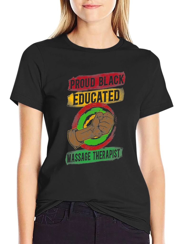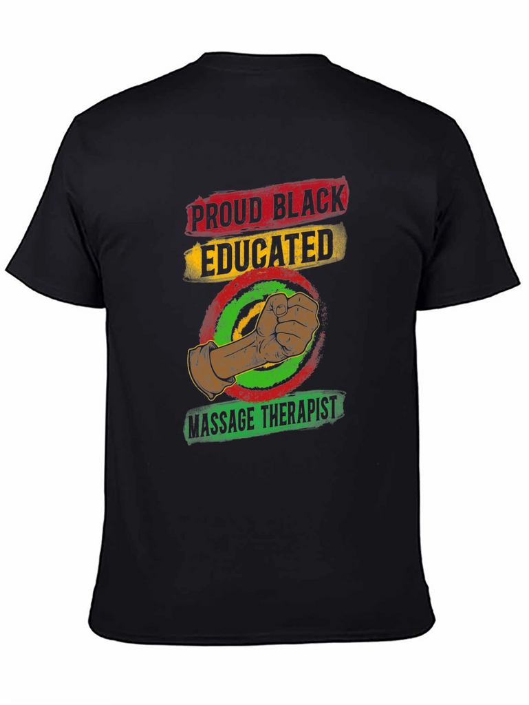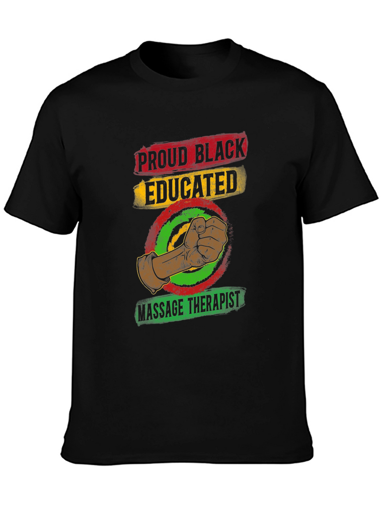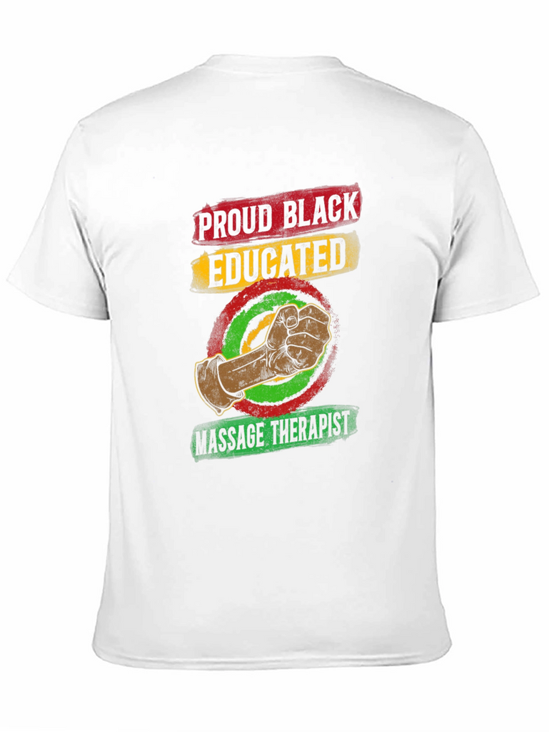 Show your pride with this unique graphic t-shirt. The design features the words "Proud Black Educated Massage Therapist" with a raised fist symbol and Pan-African colors. The shirt is made from a soft and comfortable fabric, perfect for everyday wear. Ideal for massage therapists who want to express their heritage and professional pride. Makes a thoughtful gift for graduations, birthdays, or any occasion to celebrate black excellence in the field of massage therapy. Wear it to work, community events, or casual outings to make a statement of empowerment and solidarity.