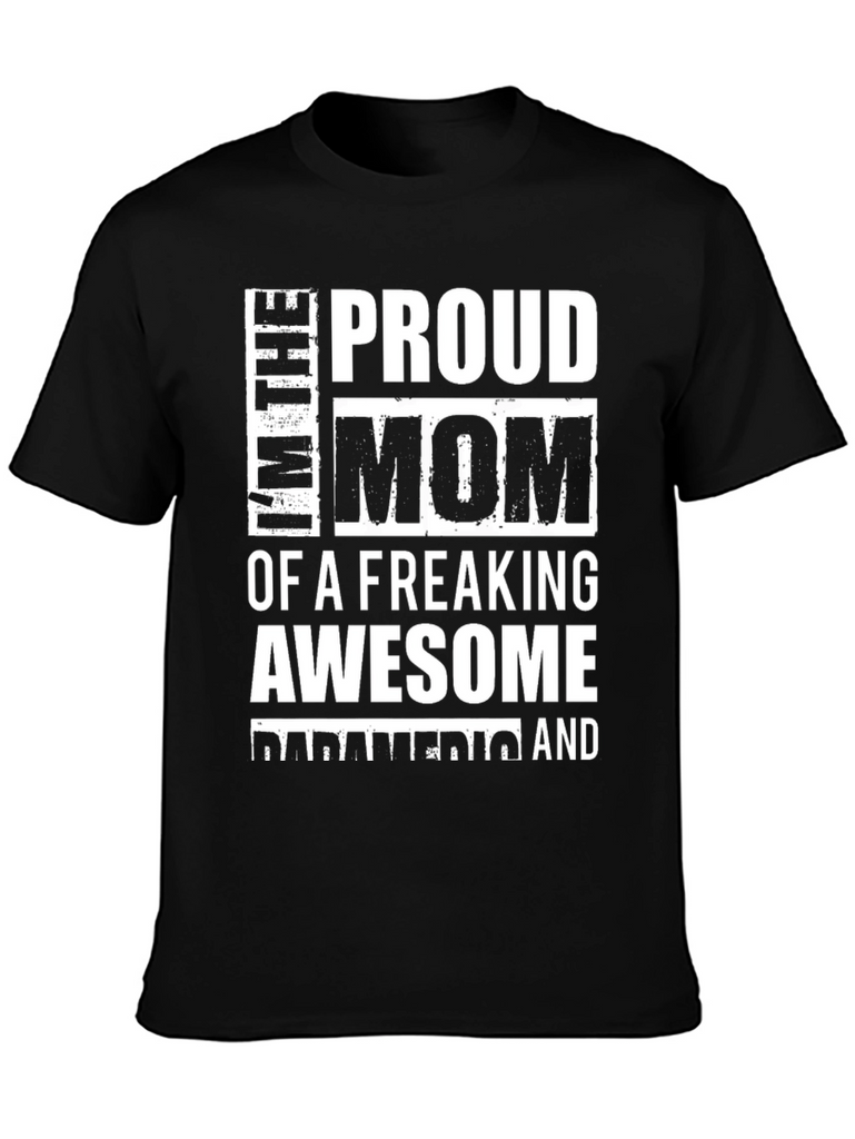 Show your pride with this bold black t-shirt featuring a statement design. The shirt reads "I'm the PROUD MOM of a FREAKING AWESOME PARAMEDIC AND", making it a perfect gift for any proud mother. Crafted from a comfortable-looking fabric, this short-sleeved tee is ideal for everyday wear. The striking white block letters are sure to catch attention and spark conversations. Whether you're running errands or attending a family event, this t-shirt lets you display your pride in style and comfort. Get yours today and wear your heart on your sleeve!