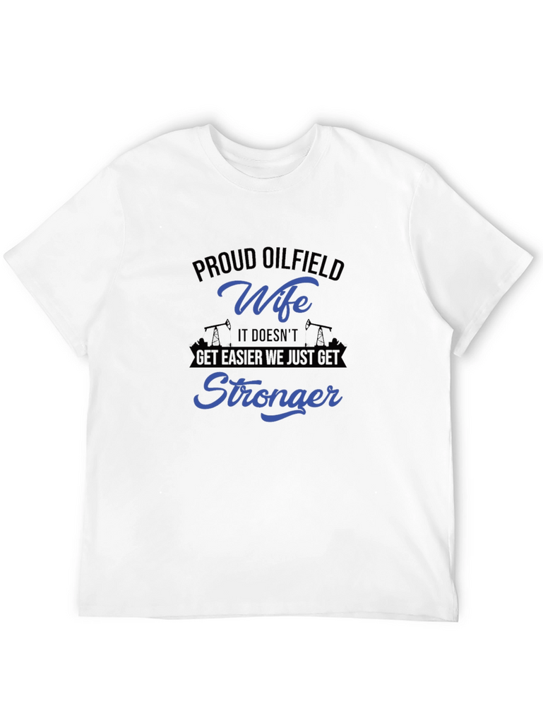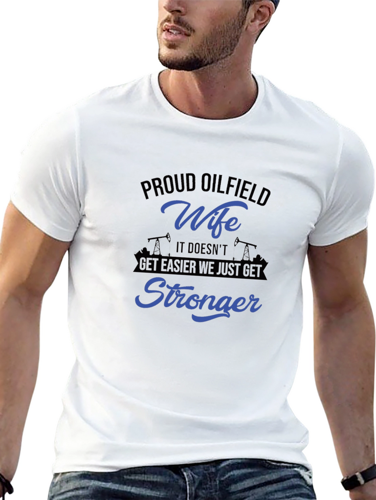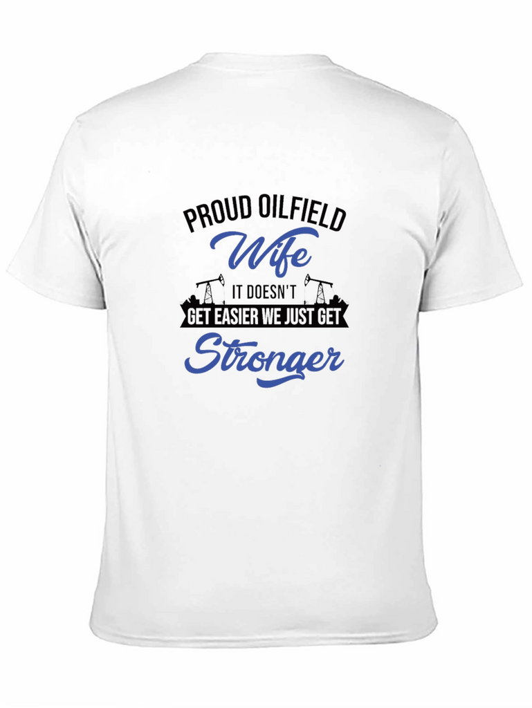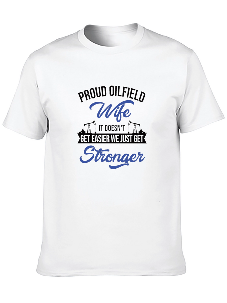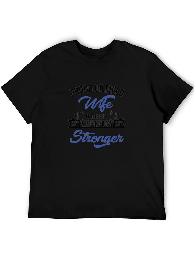 Show your support with this black t-shirt featuring the phrase "Proud Oilfield Wife. It doesn't get easier, we just get stronger" in a stylish blue font. This comfortable tee is perfect for everyday wear and makes a great gift for the resilient oilfield wife in your life. The design includes oil rig graphics, adding a touch of industry pride. Wear it to show your support, casual outings, or family events.