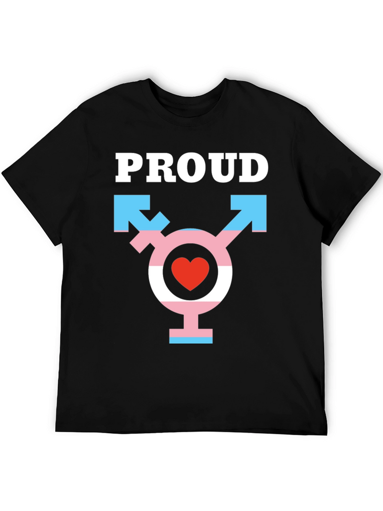 Show your pride with this bold black t-shirt. It features the word "PROUD" in crisp white lettering above a prominent transgender symbol. The symbol incorporates light blue arrows, a pink horizontal bar, a white center stripe with a red heart, and another light blue horizontal bar at the base. Made from a comfortable-looking fabric, this tee is ideal for everyday wear, pride events, or simply expressing yourself. Get yours today and wear your pride with confidence!