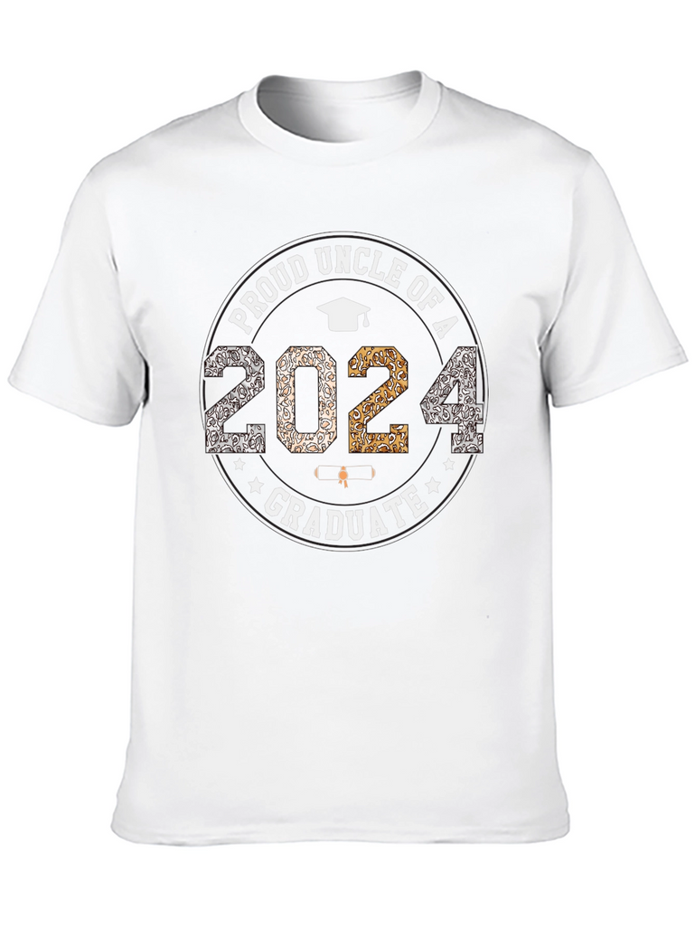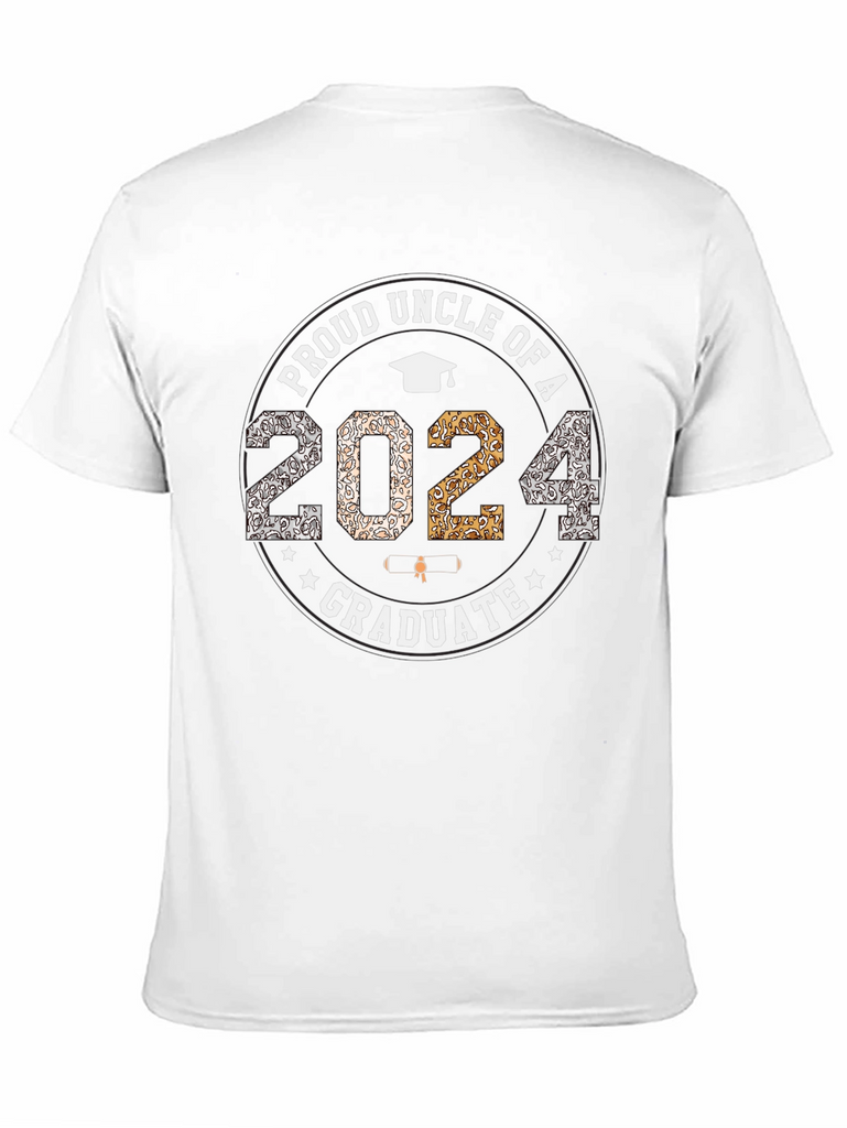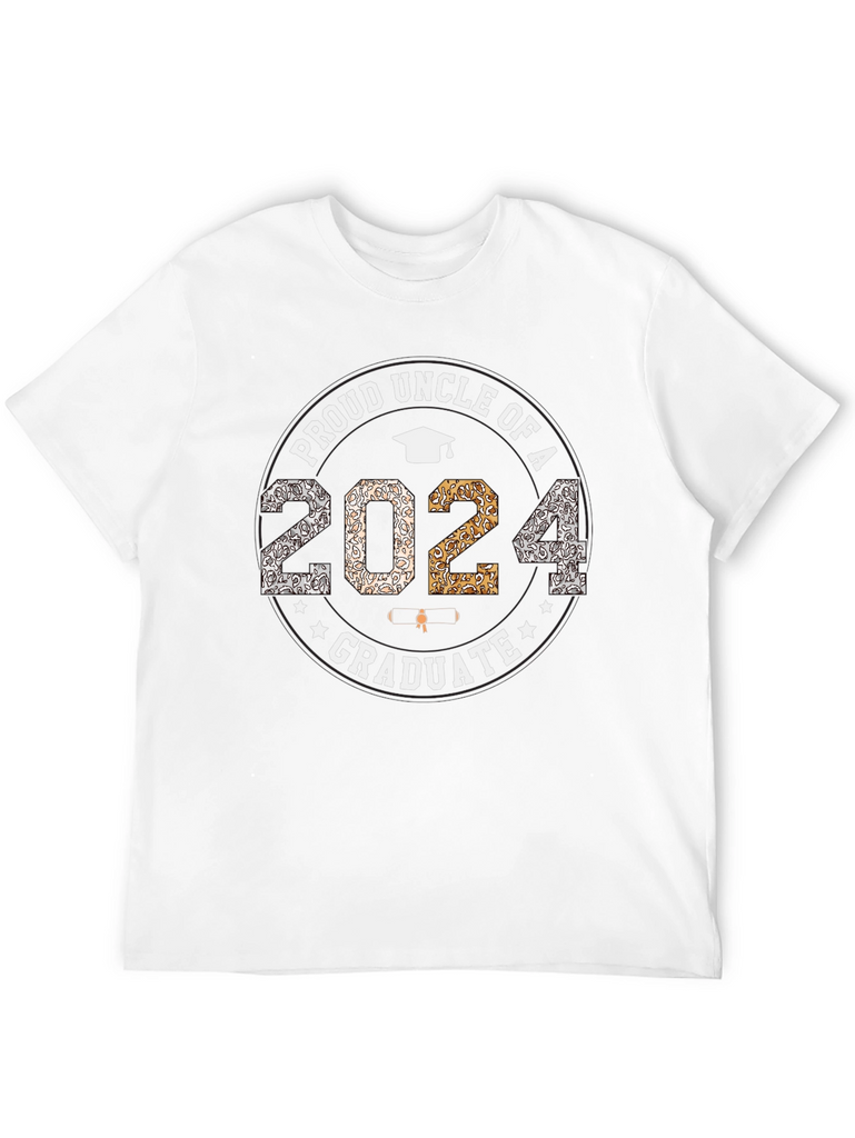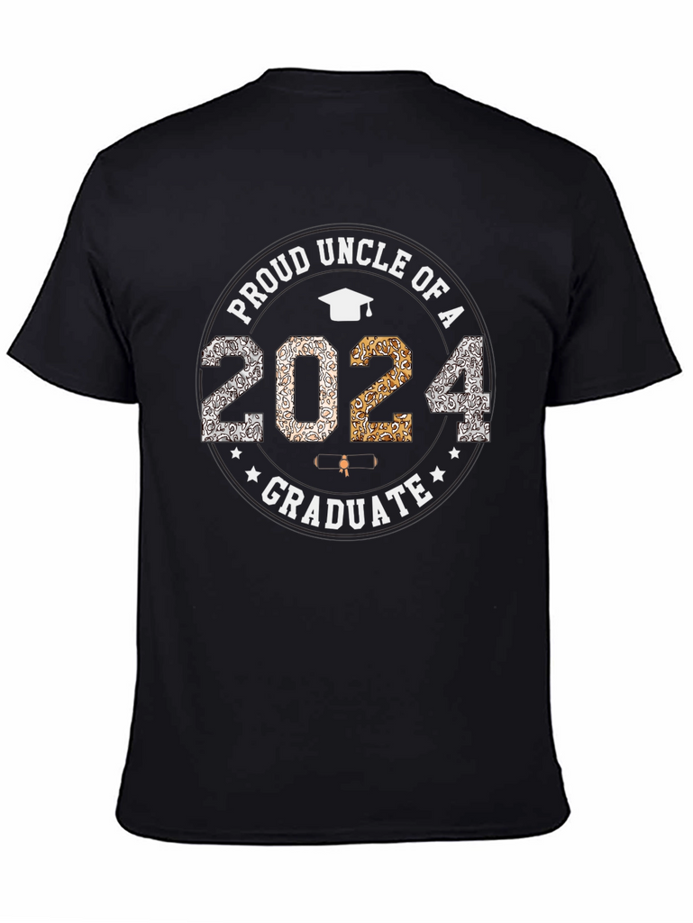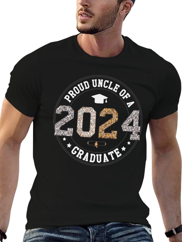 Celebrate your loved one's graduation with this stylish and commemorative t-shirt. This black t-shirt proudly displays "Proud Uncle of a 2024 Graduate" in a circular design. The year "2024" is prominently featured with mixed patterned fill. The graphic also includes a graduation cap and stars, adding to the celebratory theme. The shirt appears to be made of a comfortable cotton blend, perfect for everyday wear or graduation events. Show your pride and support for your graduate with this unique and eye-catching tee!