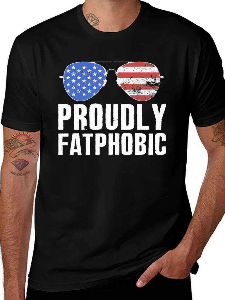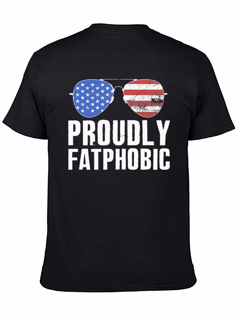 Express your views with this unique black t-shirt. Featuring a bold statement, "Proudly Fatphobic," emblazoned in white, the design incorporates aviator-style sunglasses with lenses depicting the American flag—stars on one side and stripes on the other. The shirt is made from a comfortable-looking material, perfect for casual wear and making a statement. Ideal for rallies, gatherings, or everyday expression, this shirt is sure to turn heads and spark conversations.