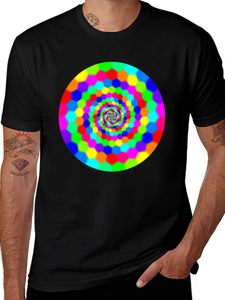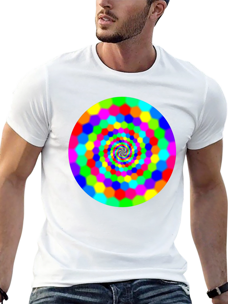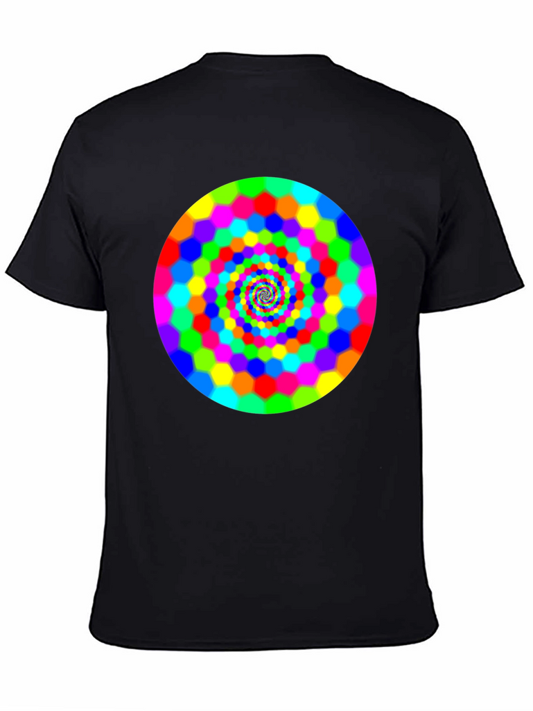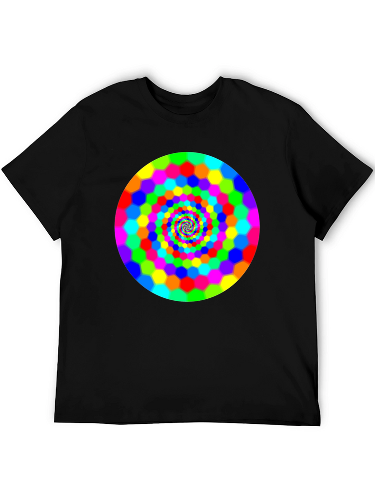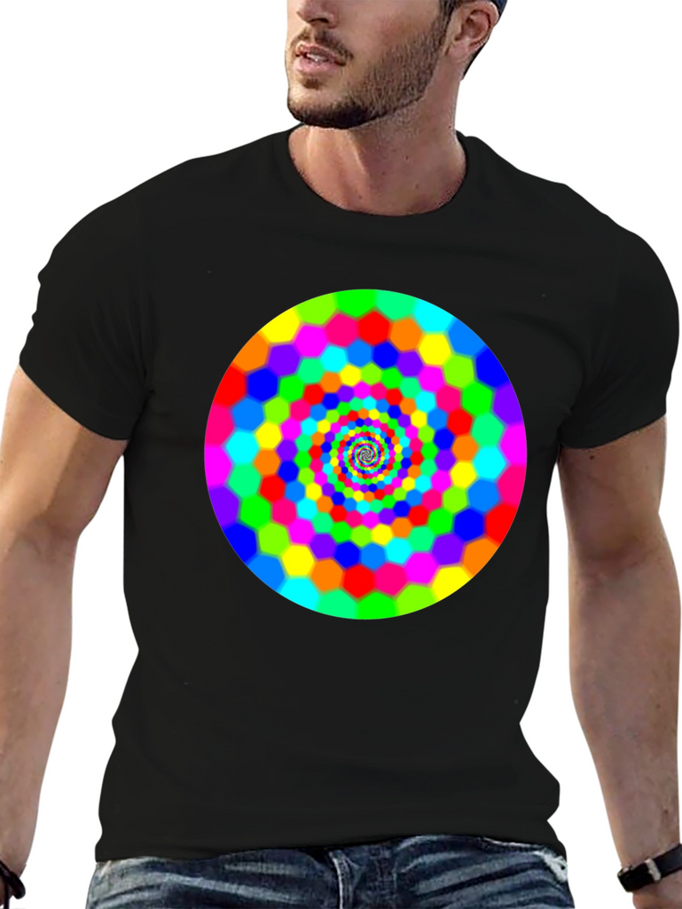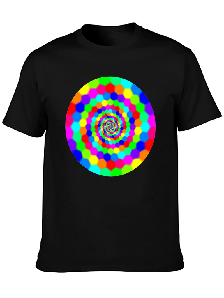 Make a bold statement with this eye-catching black t-shirt featuring a vibrant, swirling hexagon spiral design. The bright rainbow colors pop against the dark background, creating a mesmerizing optical effect. This comfortable and stylish tee is perfect for casual wear, concerts, or festivals. It is a great way to express your unique personality and love for psychedelic art. Grab yours today and turn heads wherever you go!