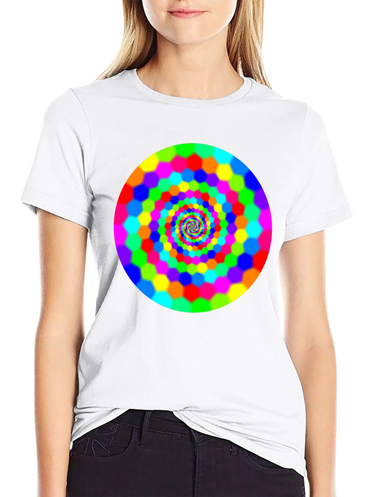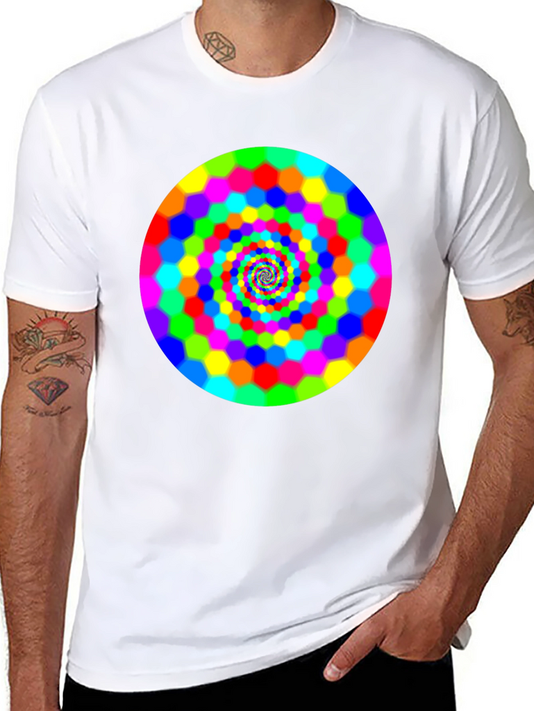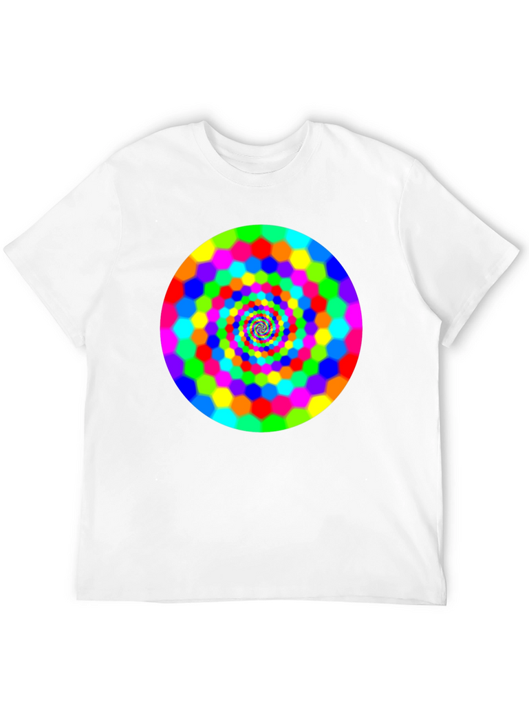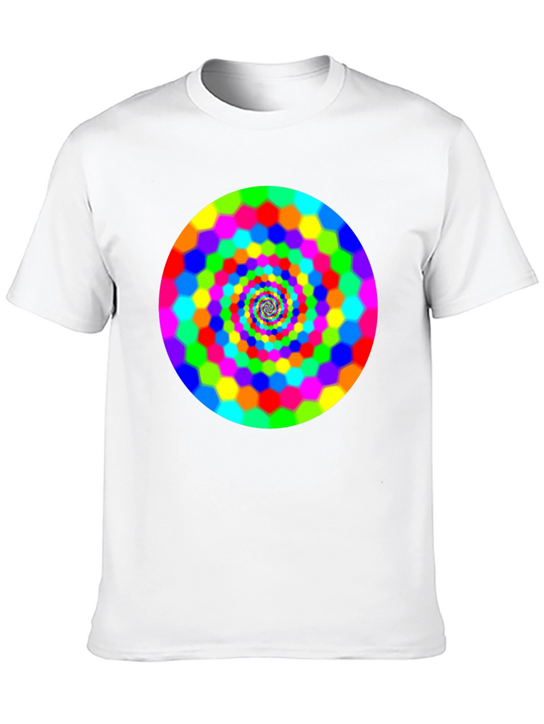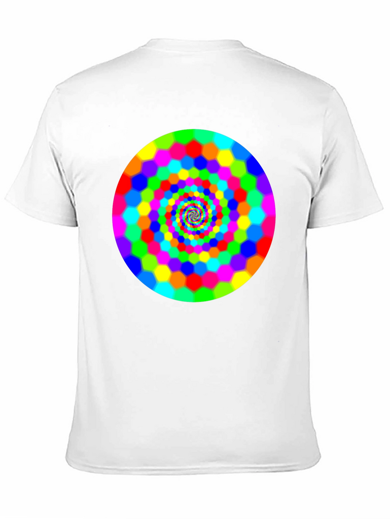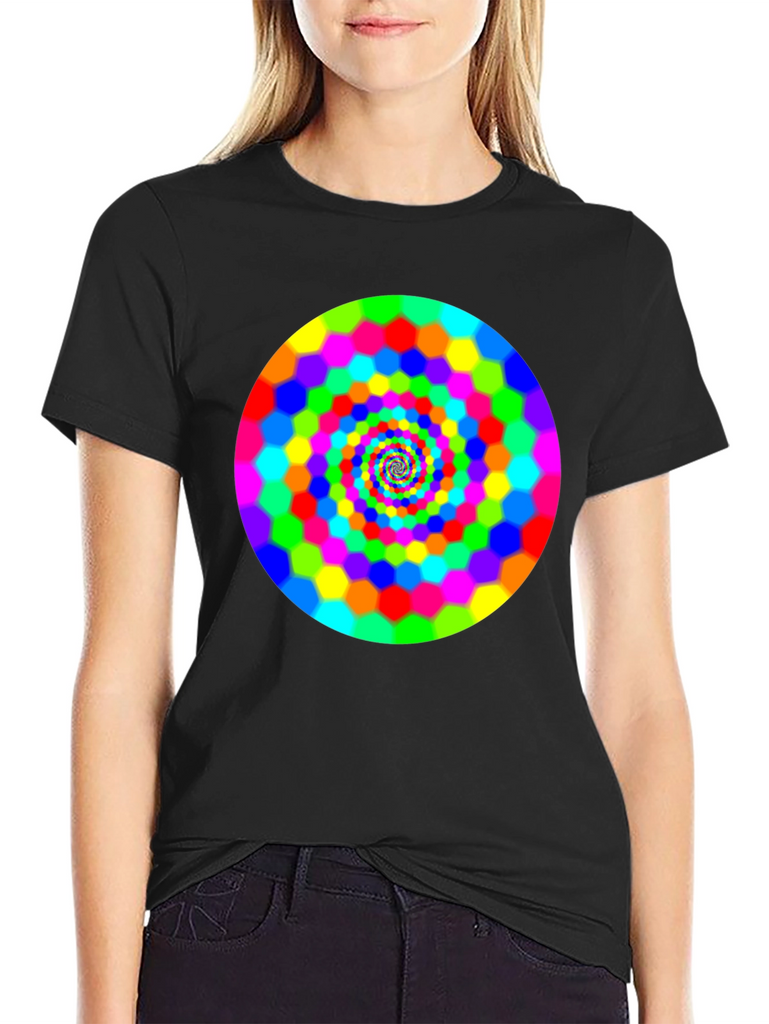 Make a bold statement with this eye-catching black t-shirt featuring a vibrant, swirling hexagon spiral design. The bright rainbow colors pop against the dark background, creating a mesmerizing optical effect. This comfortable and stylish tee is perfect for casual wear, concerts, or festivals. It is a great way to express your unique personality and love for psychedelic art. Grab yours today and turn heads wherever you go!