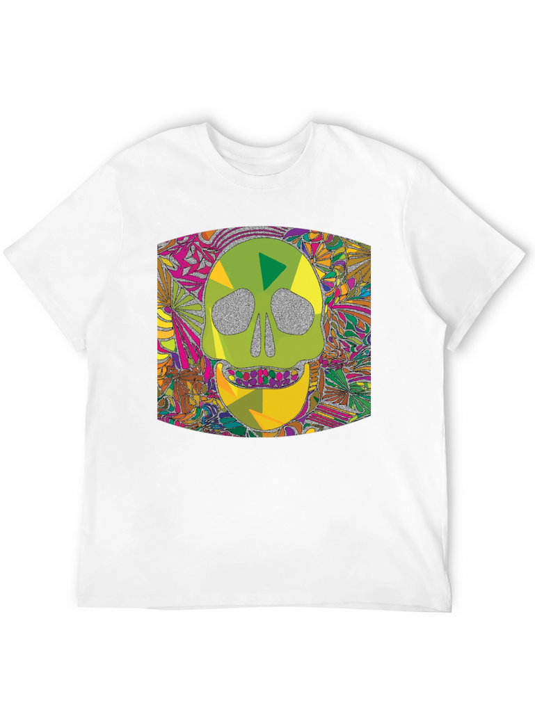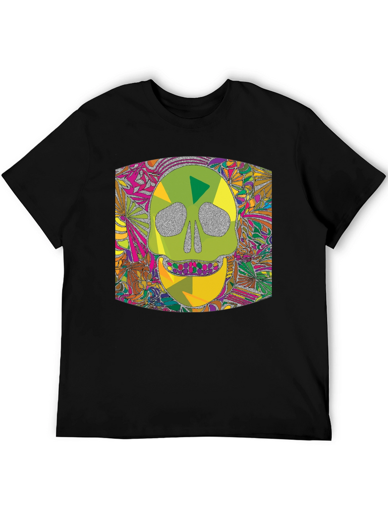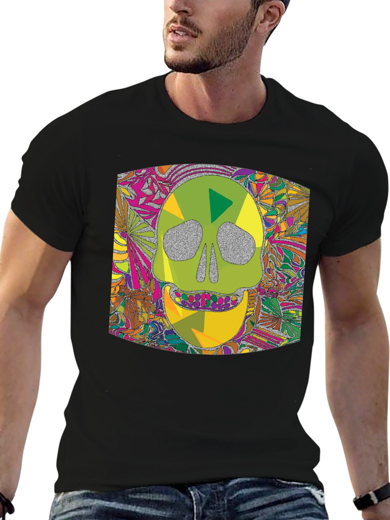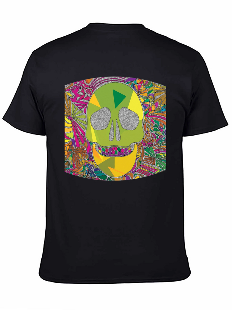 Rock this eye-catching men's black t-shirt featuring a bold, psychedelic skull graphic. The design showcases a vibrant, colorful skull composed of geometric shapes and patterns, rendered in shades of green, yellow, and purple. The tee is crafted from a soft-looking fabric, promising all-day comfort and durability. This standout tee is perfect for making a statement and expressing your unique style. Ideal for casual outings, concerts, or adding an edgy twist to your everyday look. Turn heads and unleash your inner rebel with this must-have graphic tee!