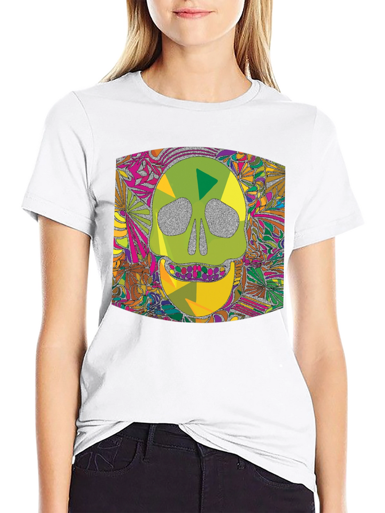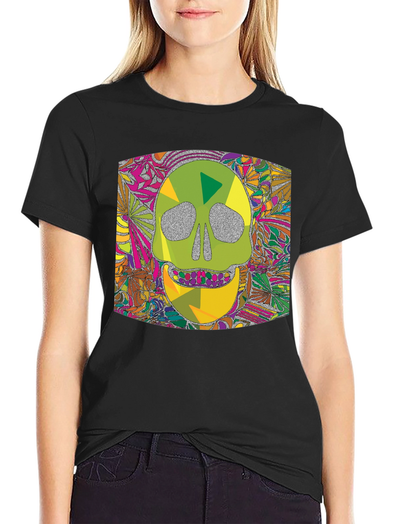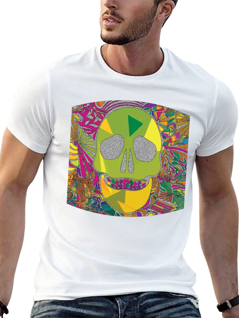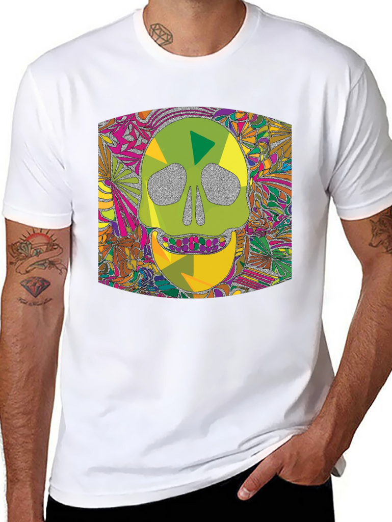 Rock this eye-catching men's black t-shirt featuring a bold, psychedelic skull graphic. The design showcases a vibrant, colorful skull composed of geometric shapes and patterns, rendered in shades of green, yellow, and purple. The tee is crafted from a soft-looking fabric, promising all-day comfort and durability. This standout tee is perfect for making a statement and expressing your unique style. Ideal for casual outings, concerts, or adding an edgy twist to your everyday look. Turn heads and unleash your inner rebel with this must-have graphic tee!