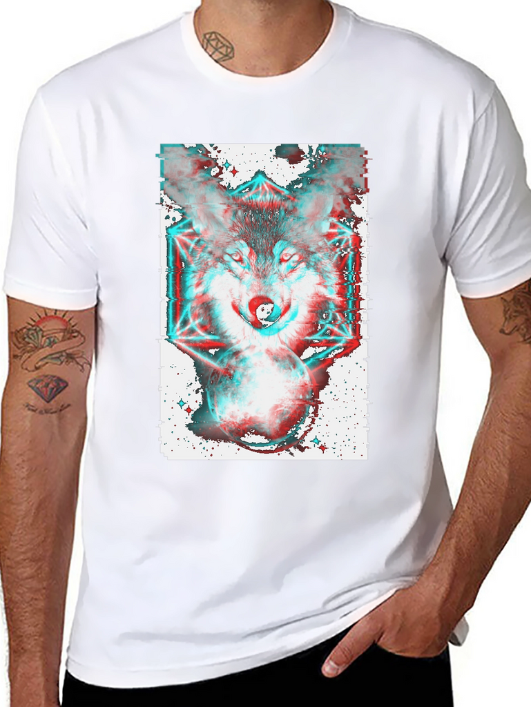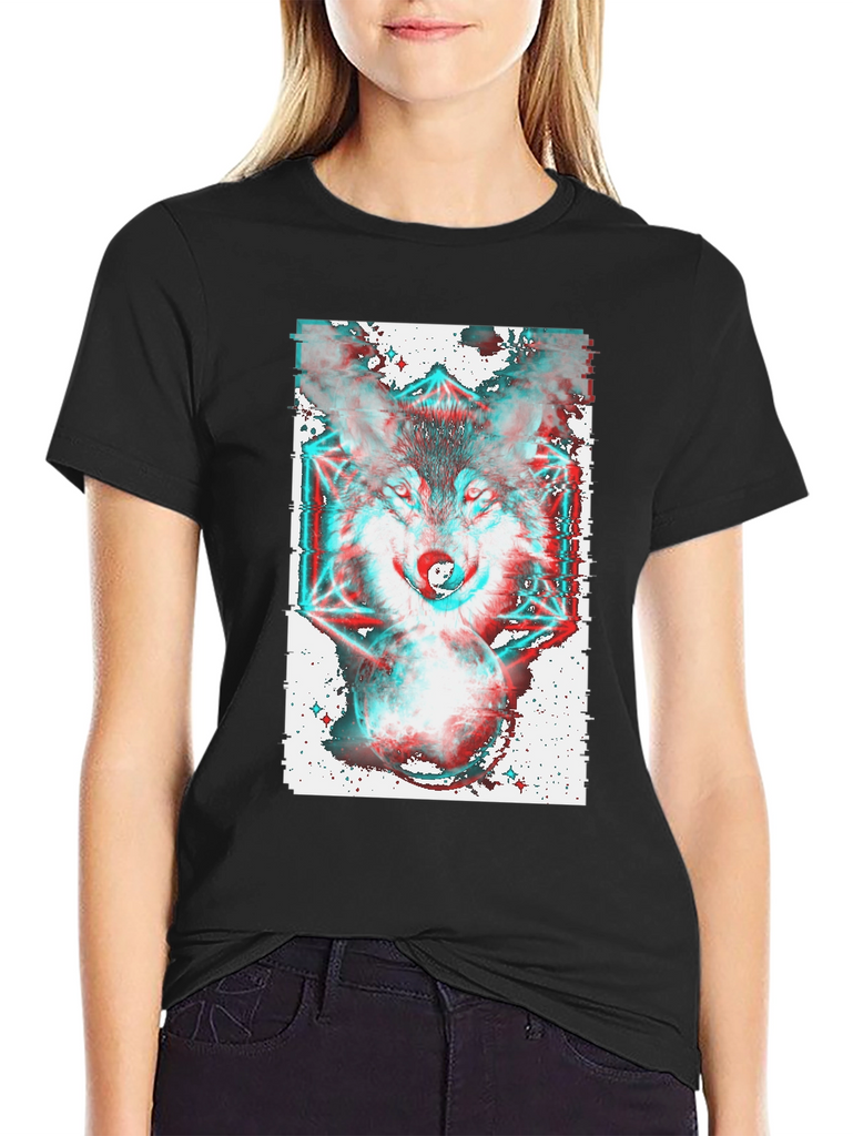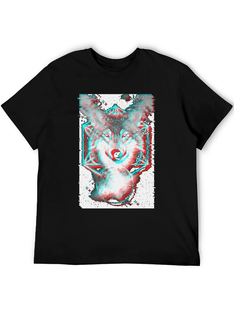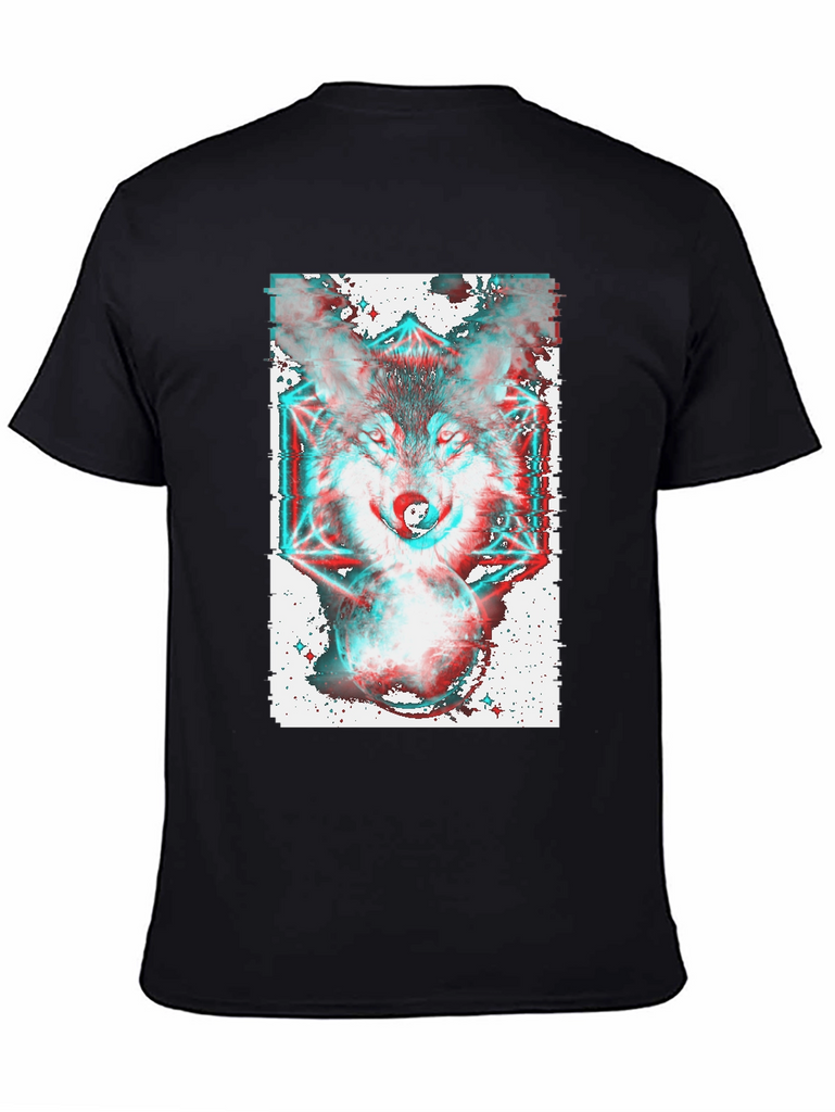Showcase your unique style with this eye-catching black t-shirt featuring a bold, psychedelic wolf graphic. The design incorporates a vibrant red and blue anaglyph effect, creating a mesmerizing, three-dimensional illusion. The wolf is framed by a geometric pattern, adding a touch of mystique. Made from comfortable, breathable fabric, this tee is perfect for everyday wear or making a statement at concerts, festivals, or casual outings. Let your personality shine with this one-of-a-kind tee that blends comfort, style, and artistic flair.