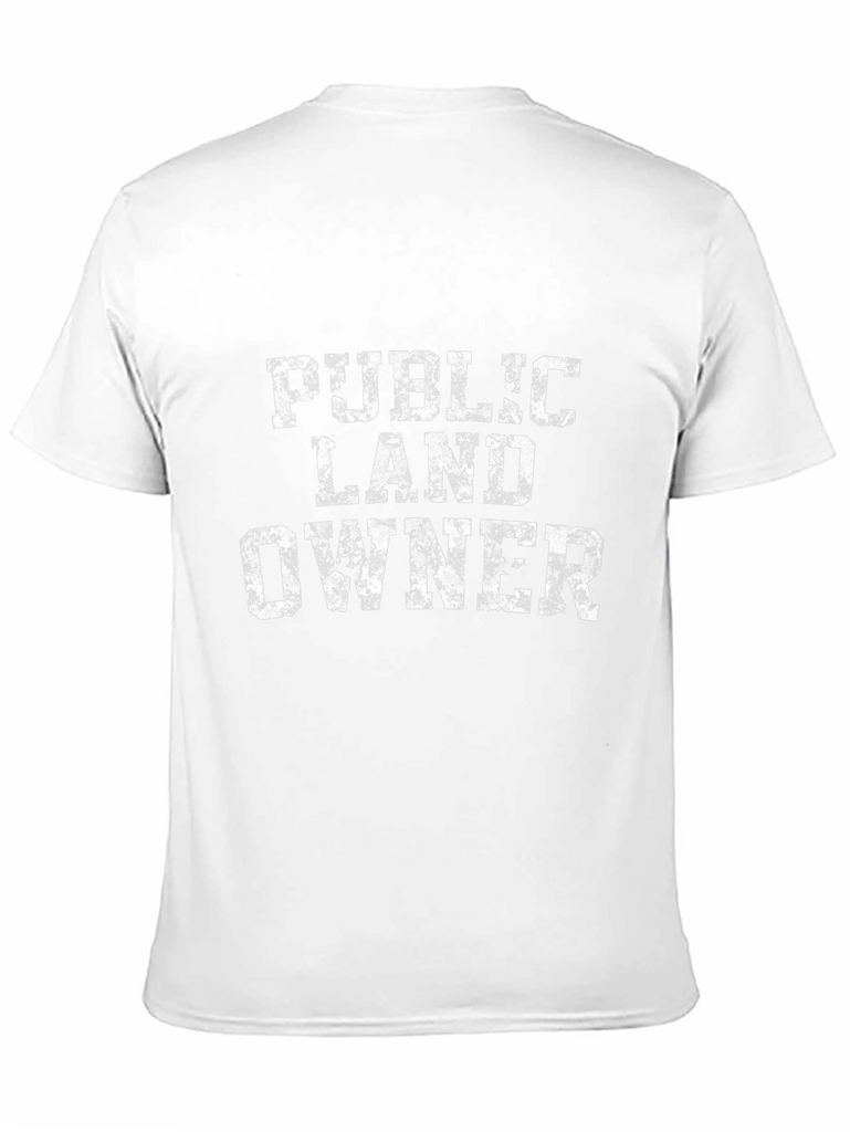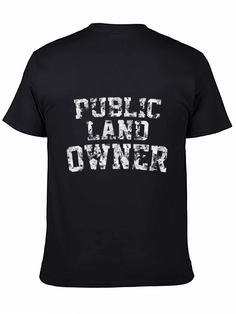 Show your support for public lands with this stylish black graphic tee. The shirt features a distressed white print that reads "Public Land Owner" in a bold, blocky font. Made from what appears to be a comfortable cotton blend, this tee is perfect for outdoor adventures or casual everyday wear. The classic fit and short sleeves make it a versatile addition to any wardrobe. It is a great way to express your passion for conservation and responsible land use.