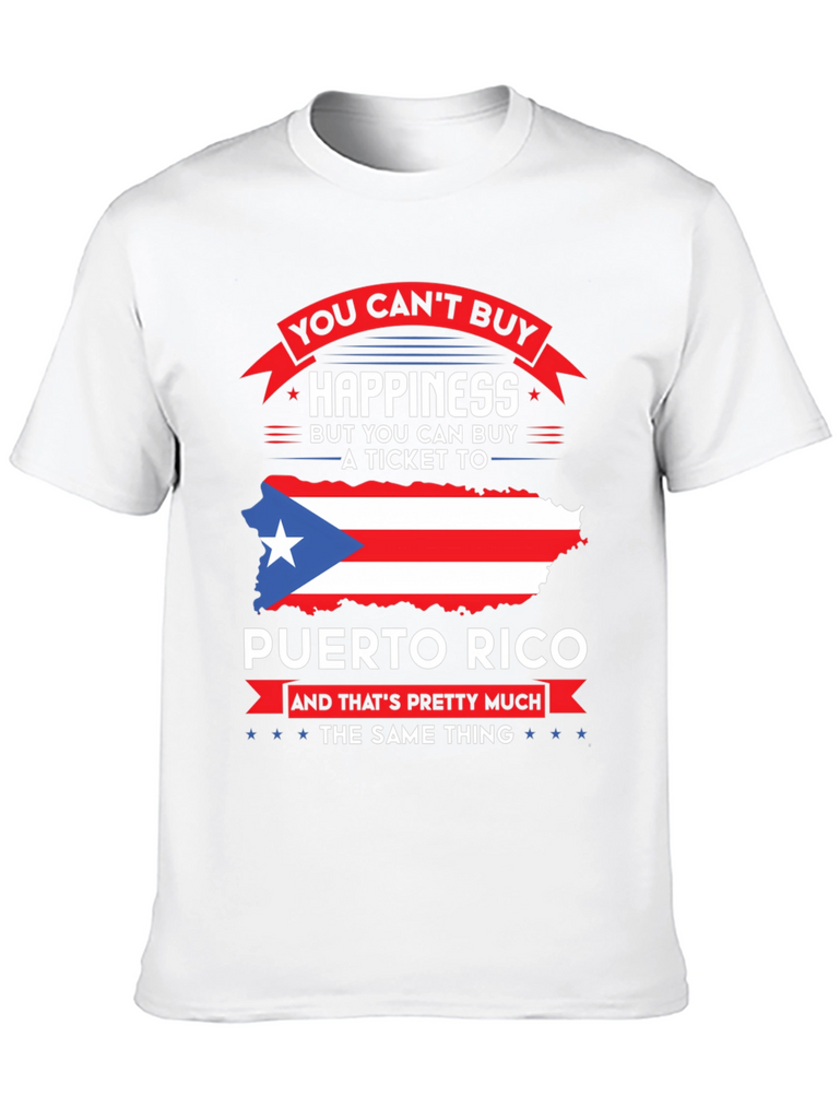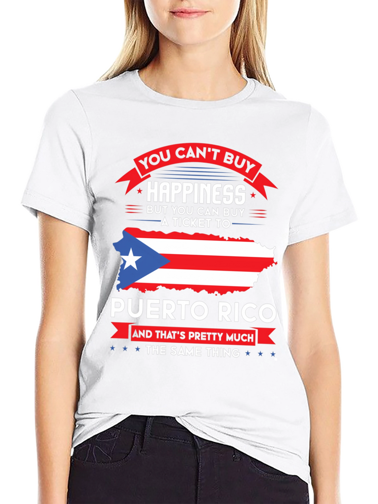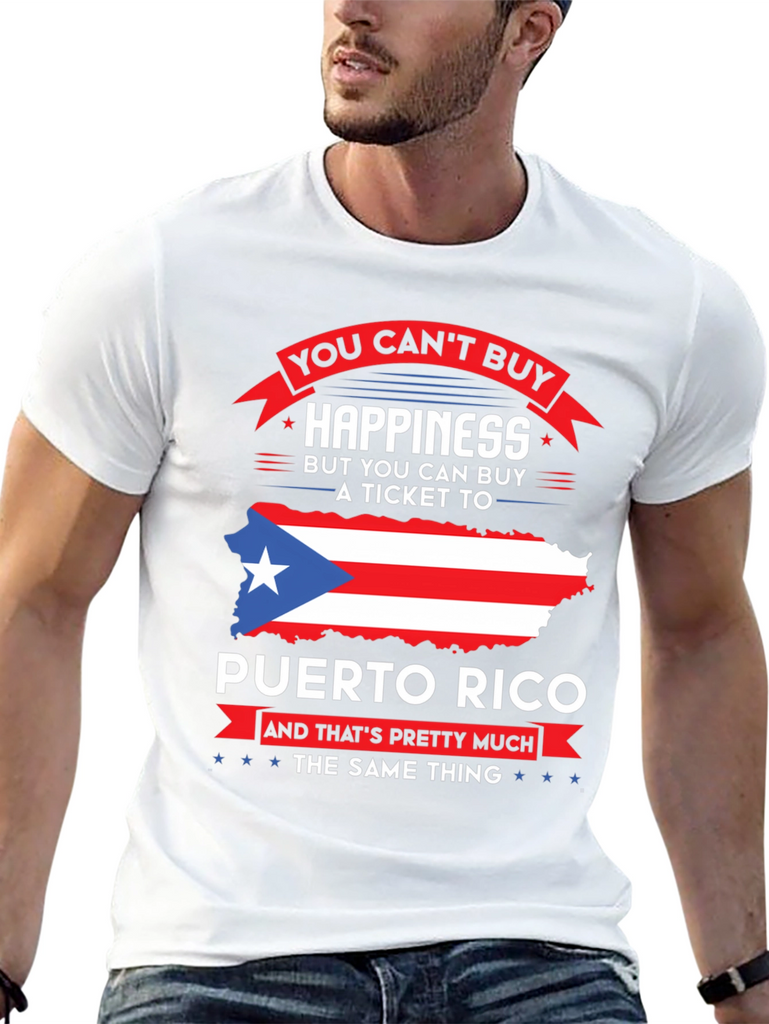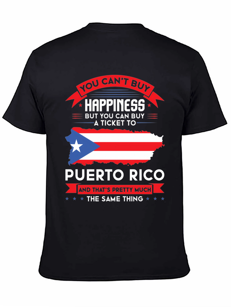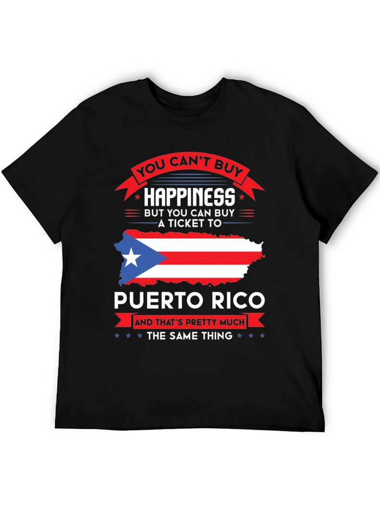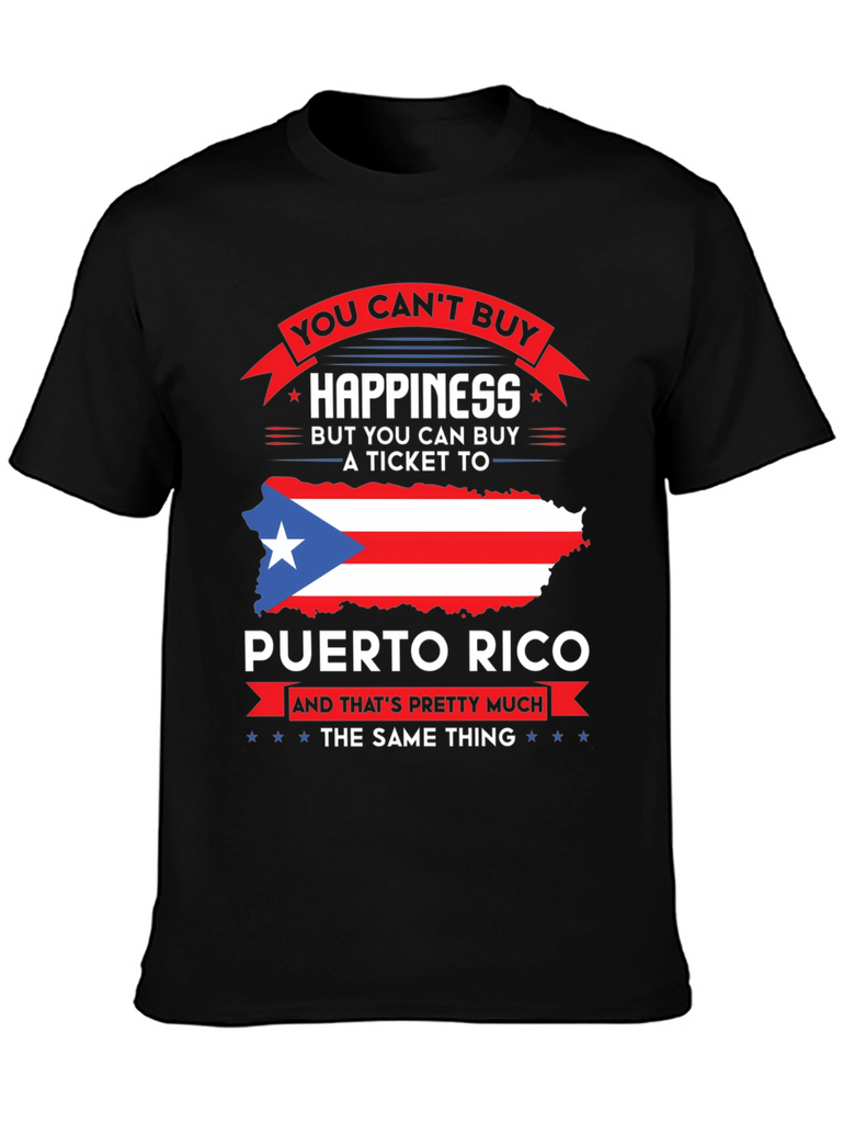 Show your love for Puerto Rico with this stylish black t-shirt. Featuring a unique design with the Puerto Rican flag in the shape of the island, this shirt proudly proclaims, "You Can't Buy Happiness, But You Can Buy a Ticket to Puerto Rico, and That's Pretty Much the Same Thing." Crafted from a comfortable fabric, this tee is perfect for everyday wear, vacations, or as a gift for someone who adores Puerto Rico. Make a statement and let everyone know where your heart belongs!