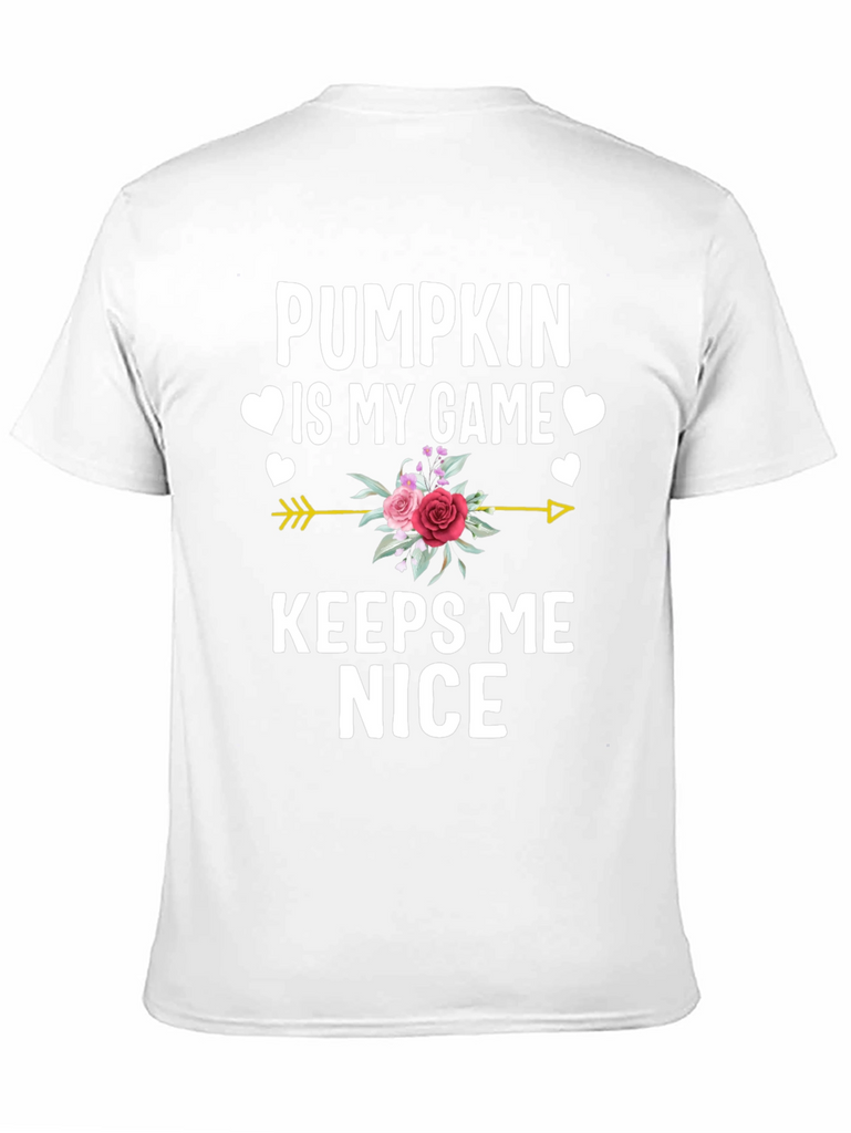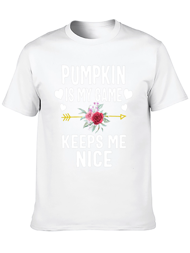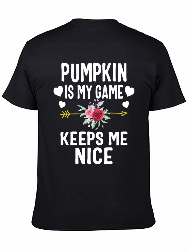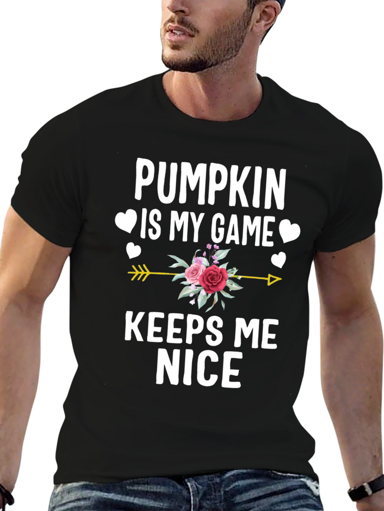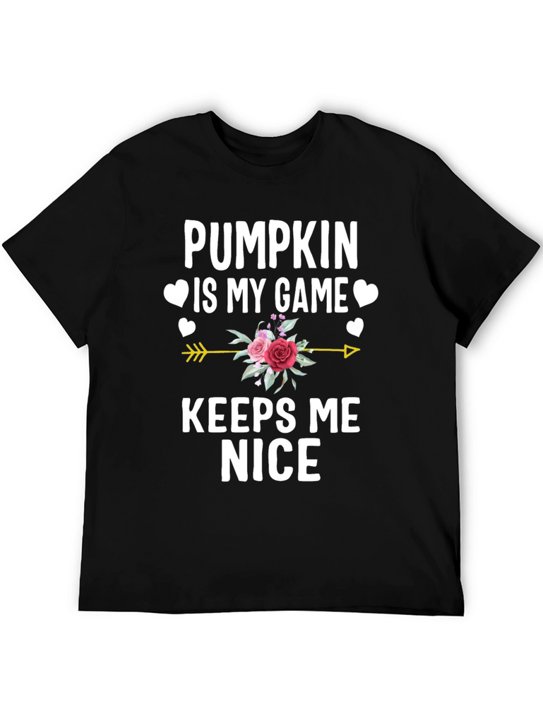 Embrace the autumn spirit with this stylish black t-shirt. Featuring a charming graphic print that reads "Pumpkin Is My Game Keeps Me Nice," adorned with decorative hearts, a floral arrow design, and roses. The comfortable, relaxed fit makes it perfect for everyday wear during the fall season, casual outings, or pumpkin patch visits. Show off your love for pumpkins and all things autumn with this trendy and cozy graphic tee. Made from comfortable materials, this shirt will make you the best-dressed person at any fall festival!