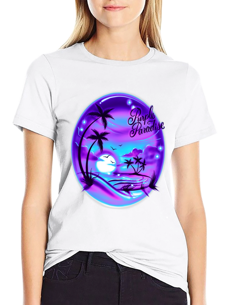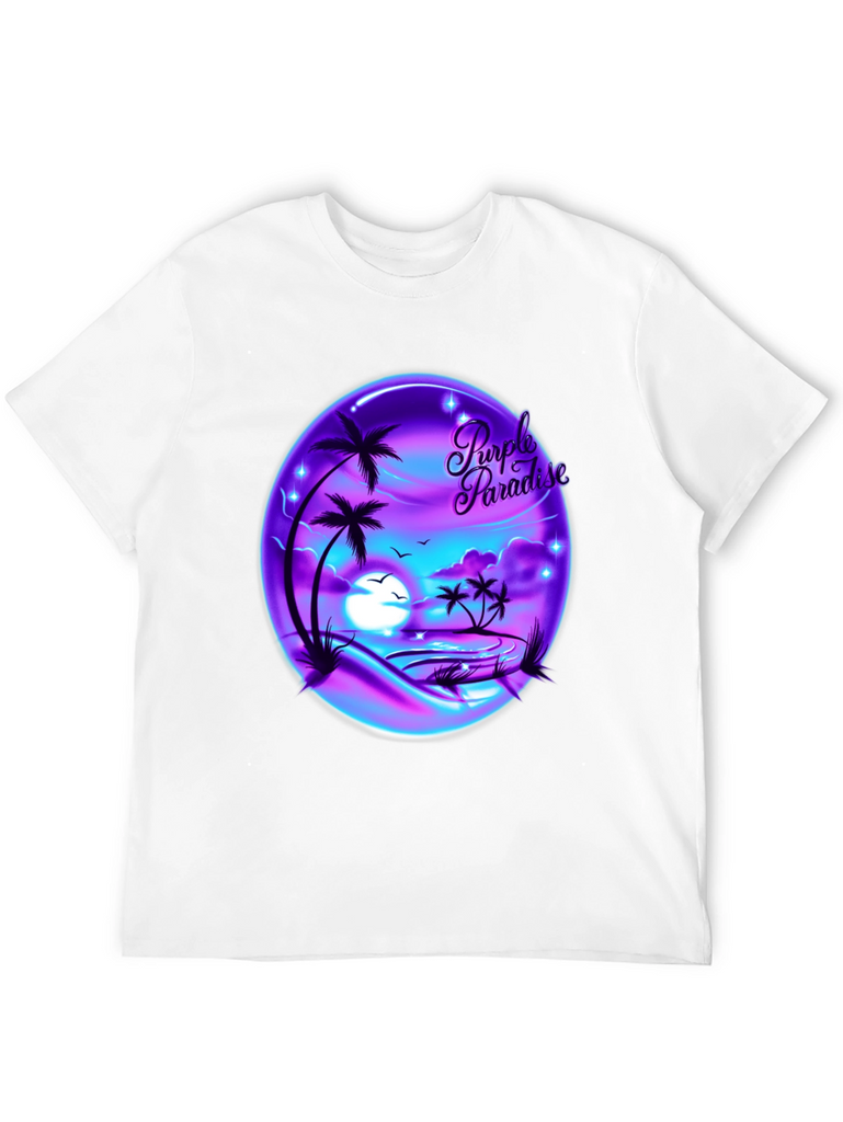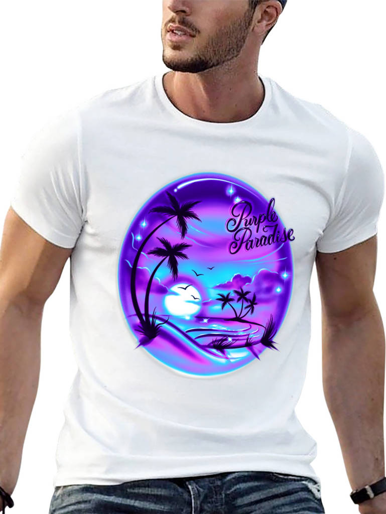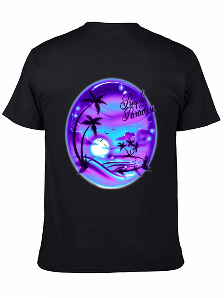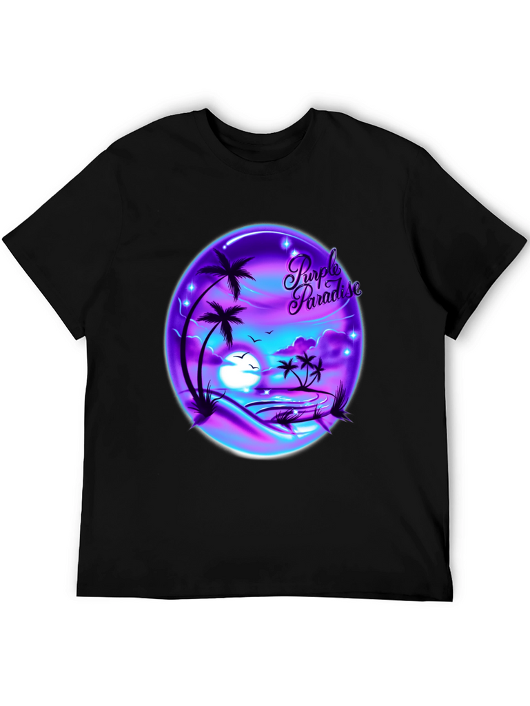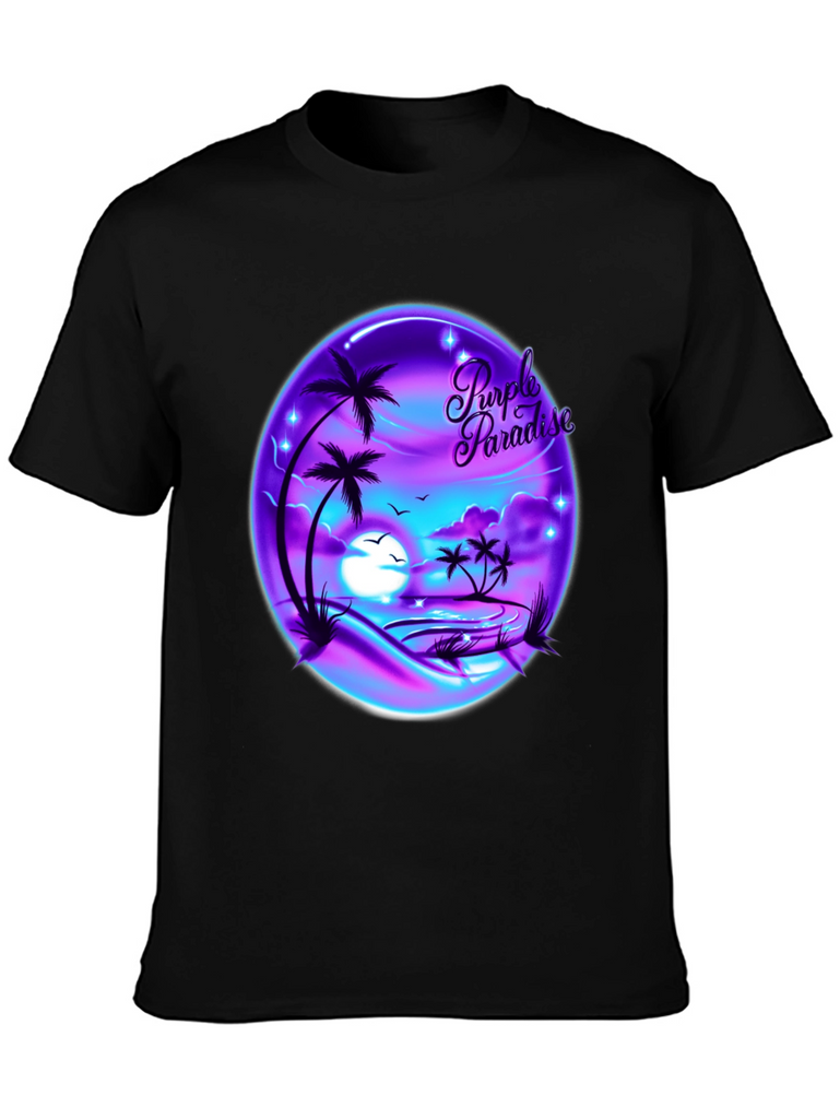Embrace a tropical vibe with this unique graphic t-shirt. This black tee features a vibrant design of a 'Purple Paradise' beach scene encapsulated in a glowing orb. Palm trees, a bright moon, and a serene seascape create a relaxing, dreamlike quality. The design pops with purple, turquoise, and white hues against the black fabric, making it a standout piece. Crafted from a soft, breathable fabric, this shirt offers both comfort and style. Ideal for casual outings, beach days, or adding a touch of paradise to your everyday wear. Make a statement and transport yourself to 'Purple Paradise' with this eye-catching tee!