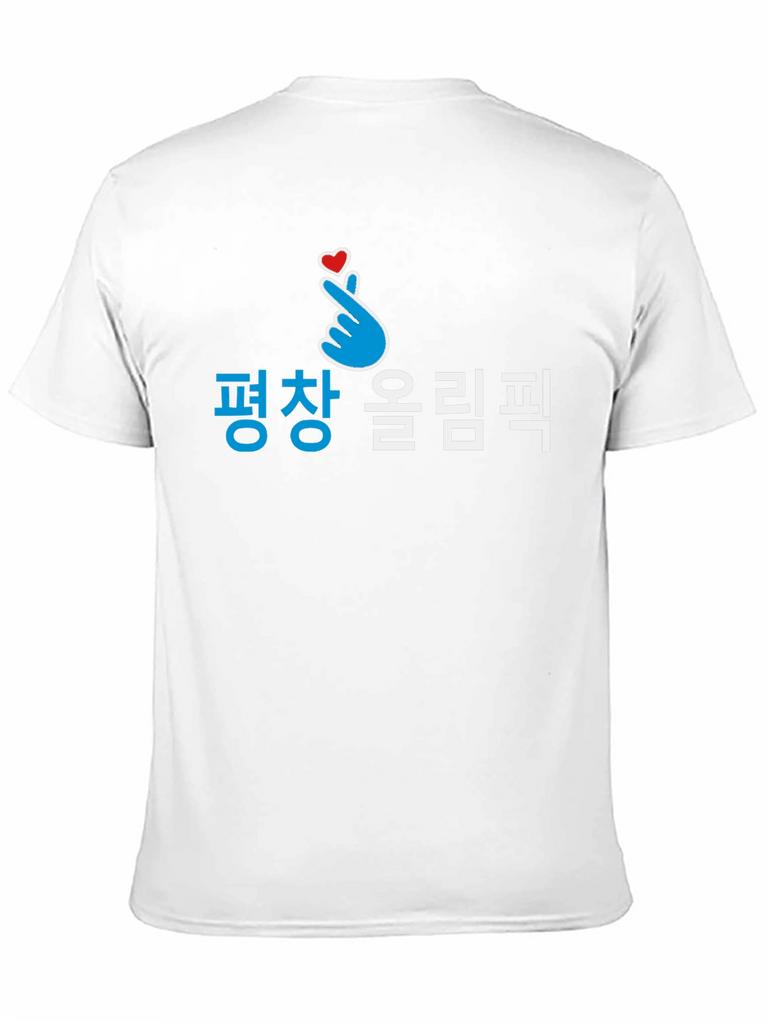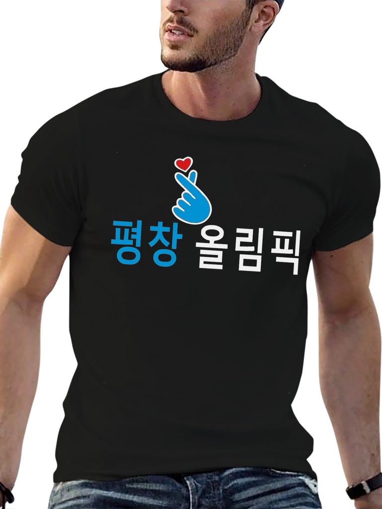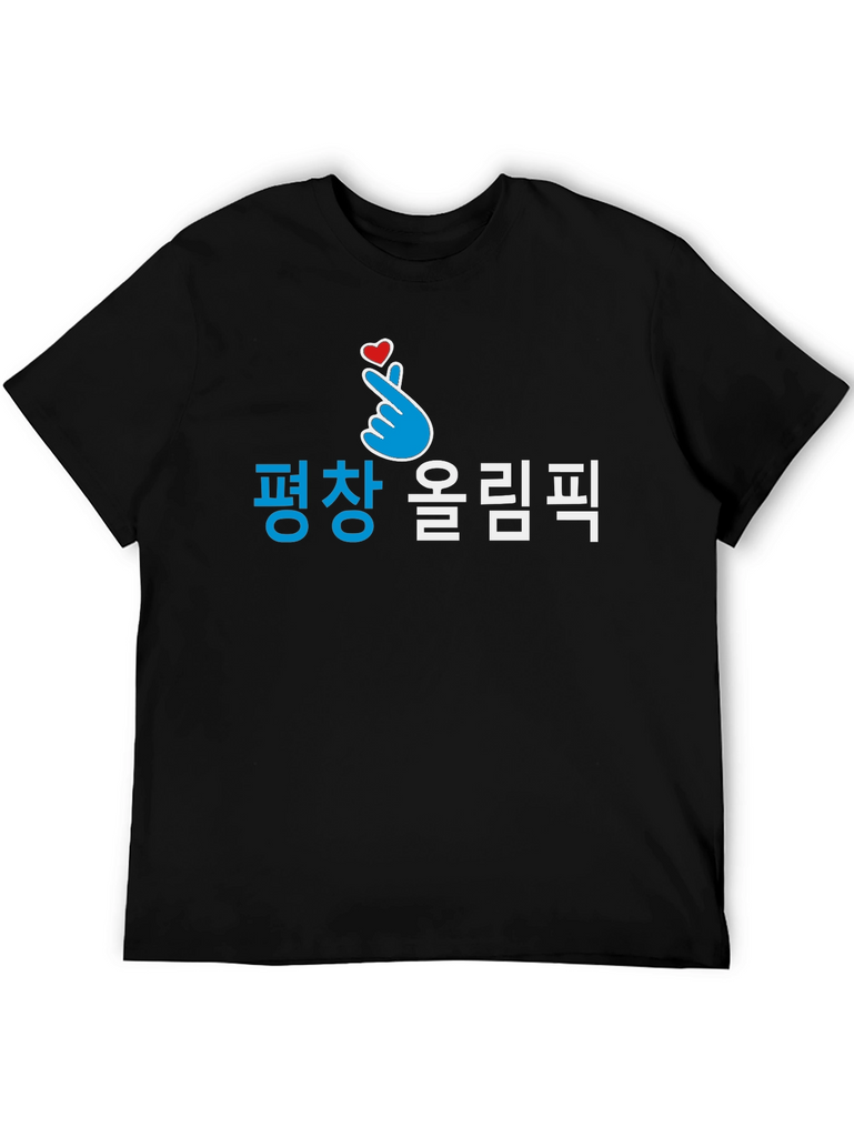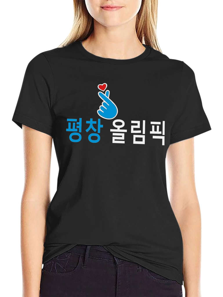 Show your love for the Pyeongchang Olympics with this stylish black T-shirt. The shirt features a unique graphic of a finger making a heart shape above Korean text, blending cultural appreciation with athletic enthusiasm. Made from a comfortable, breathable fabric, this tee is perfect for everyday wear or showing your support at Olympic-themed events. The design is eye-catching and sure to spark conversation. A great addition to any fan's wardrobe, combining fashion with a passion for global sports. Get yours today and wear your Olympic pride!
