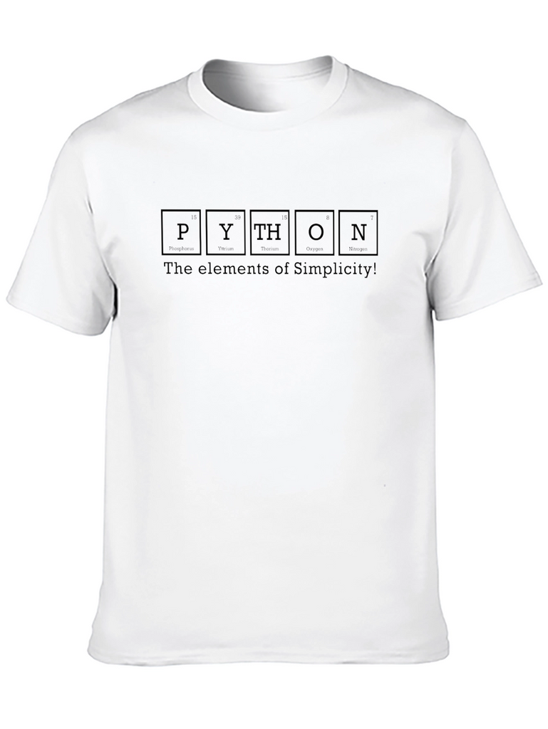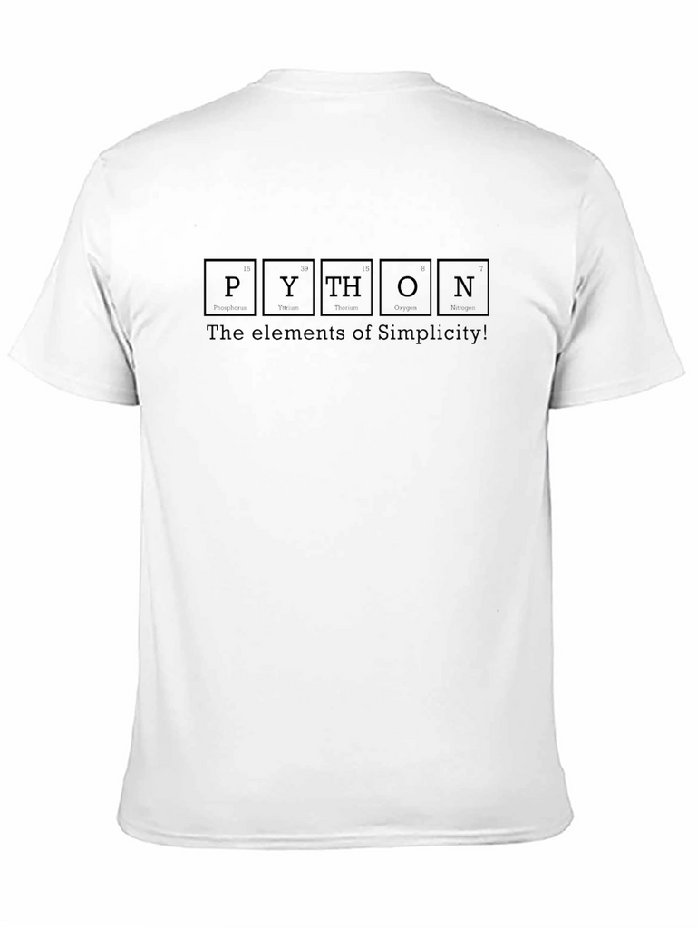 Show your love for programming with this unique black t-shirt. Featuring a creative design that spells out "PYTHON" using elements similar to a periodic table, underscored by the phrase "The elements of Simplicity!", this shirt is perfect for programmers, students, and anyone who appreciates coding humor. The dark print on the black cotton material ensures that the design stands out subtly yet effectively. Its classic fit makes it a comfortable and stylish choice for everyday wear, coding sessions, tech meetups, or casual outings. Make a statement and share your passion for Python with this one-of-a-kind tee.