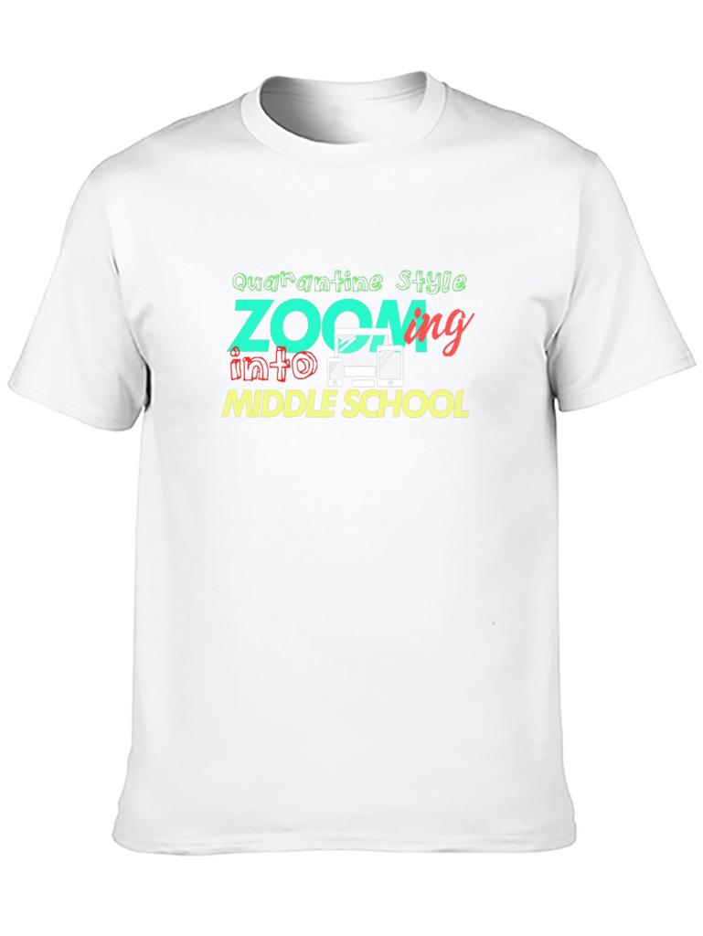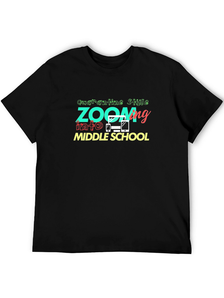 Show your style while zooming into middle school with this unique T-shirt! Featuring a playful design with the words "Quarantine Style Zoom into Middle School", this shirt is perfect for students attending virtual classes. The design also includes fun graphics of electronic devices, adding a touch of tech-savviness. Made from comfortable, breathable fabric, this T-shirt is ideal for everyday wear while learning from home. Grab this shirt and make a statement as you navigate the world of online education!