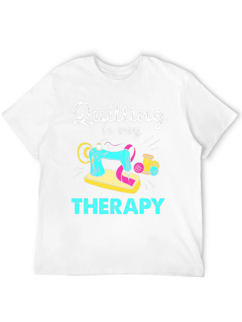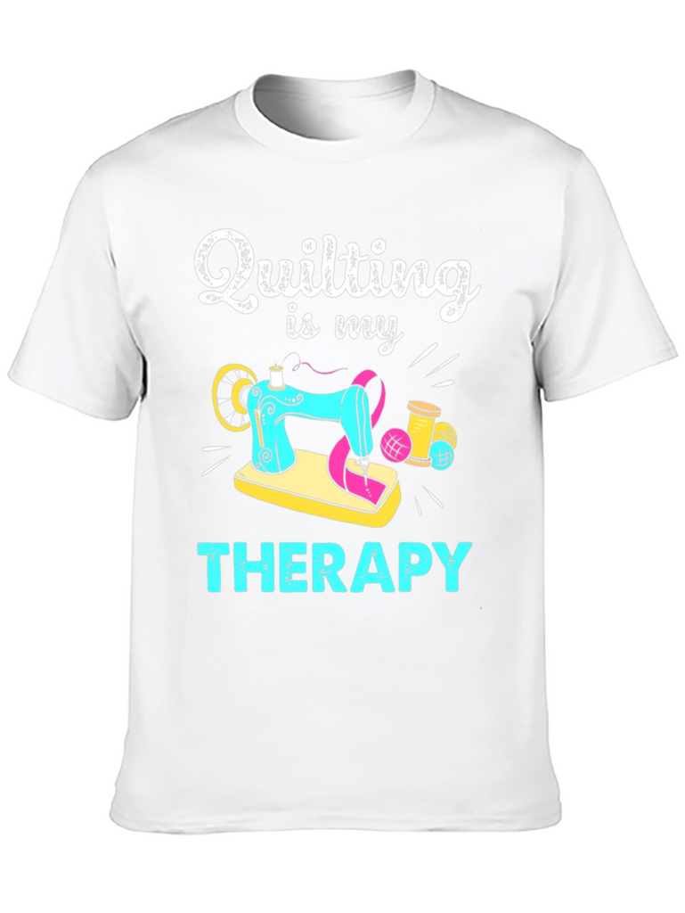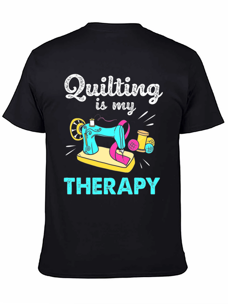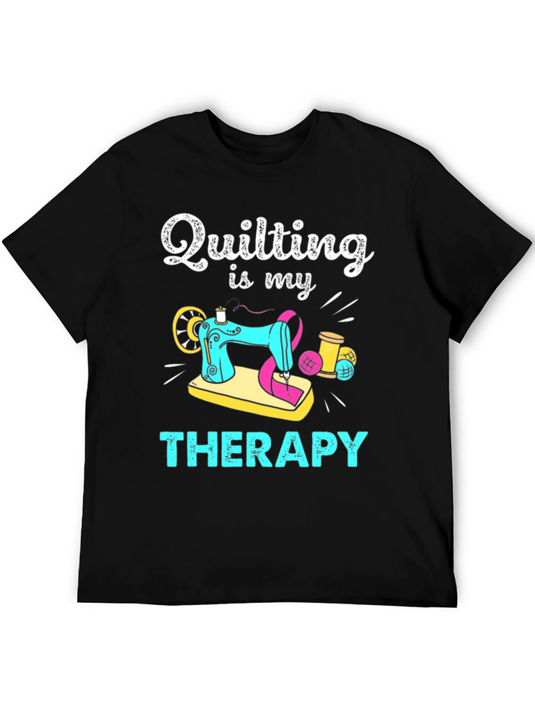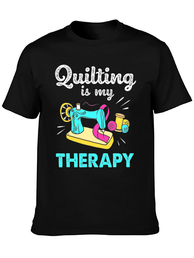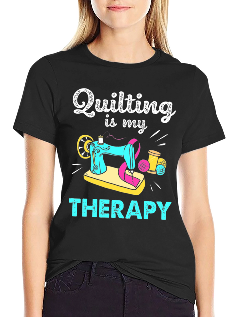 This classic black t-shirt features a charming graphic design for quilting enthusiasts. The design showcases a vintage-style sewing machine surrounded by quilting essentials like yarn spools. The words "Quilting is my THERAPY" are playfully arranged above and below the graphic. Made from a comfortable-looking fabric, this shirt offers a relaxed fit and is perfect for casual wear, quilting meetups, or as a thoughtful gift for the crafter in your life. Show off your love for quilting with this unique and stylish tee!