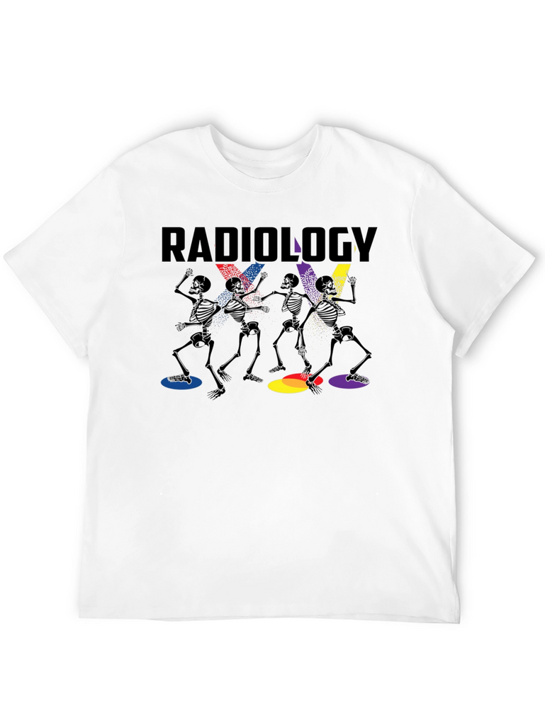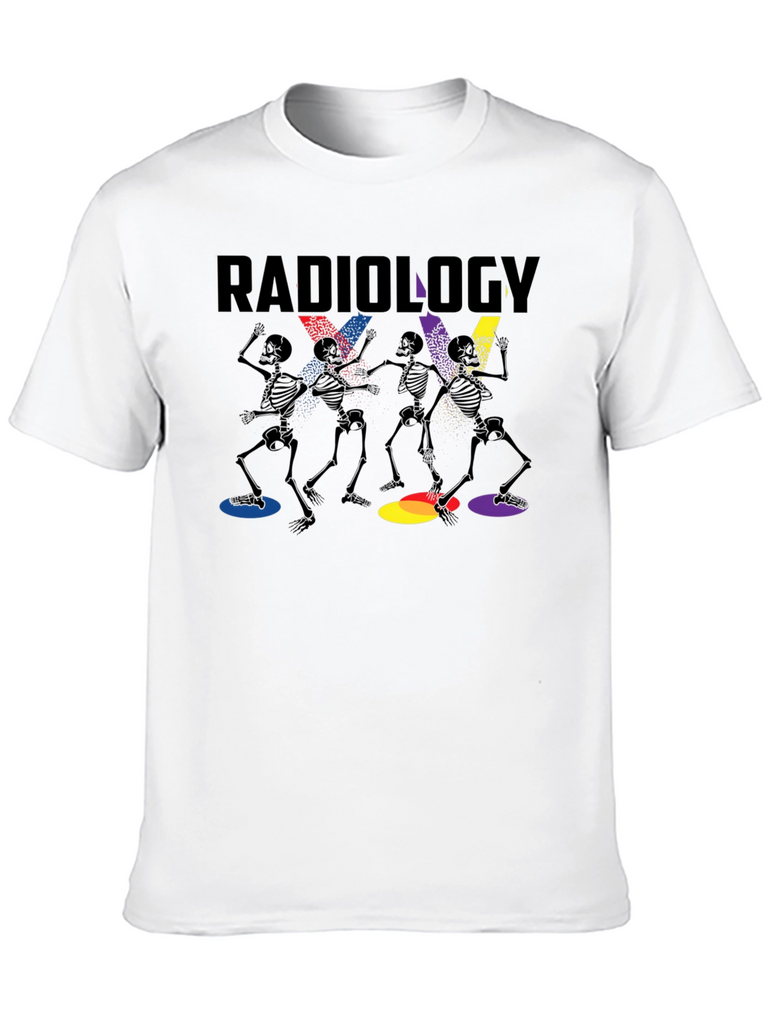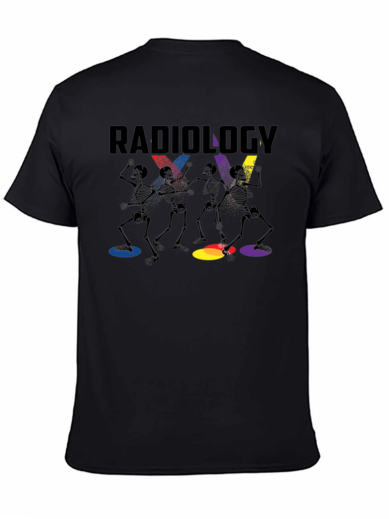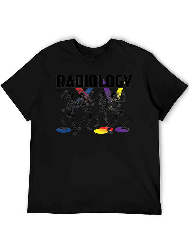 This black t-shirt features a bold graphic design that's perfect for radiology professionals or anyone with a love for science and humor. The shirt showcases the word "RADIOLOGY" in a blocky, shadowed font above four dancing skeletons. Each skeleton is illuminated by a vibrant, colorful spotlight, creating a fun and eye-catching visual effect. The shirt appears to be made from a soft, comfortable material, ideal for everyday wear. Show off your passion with this unique and playful t-shirt.