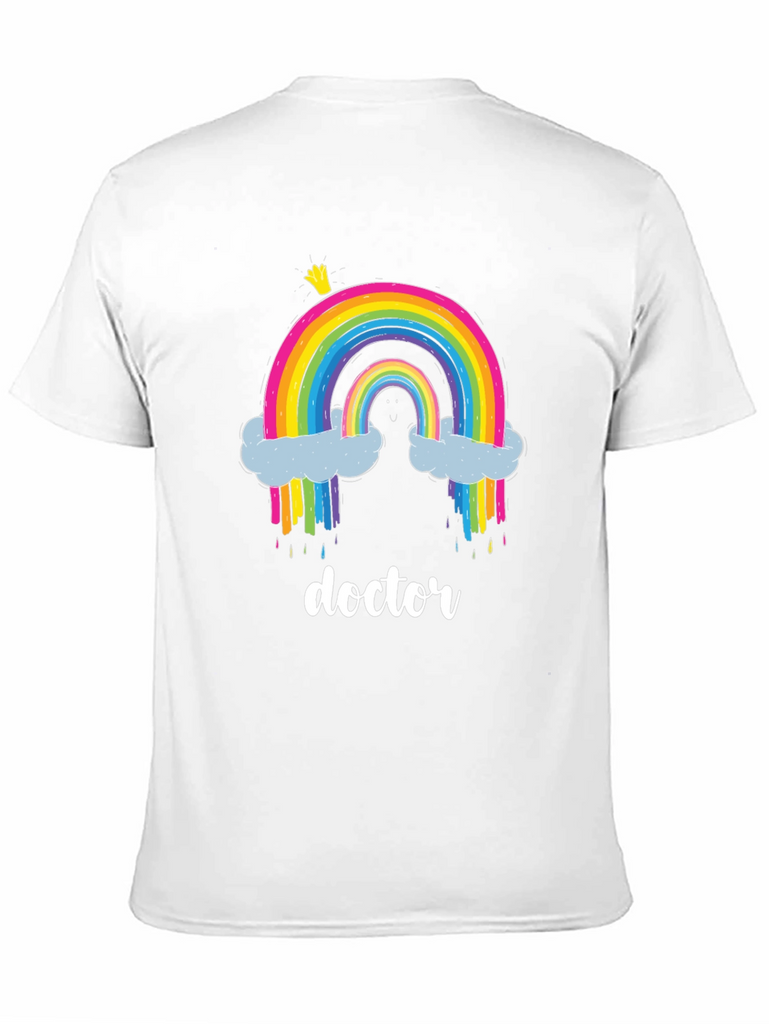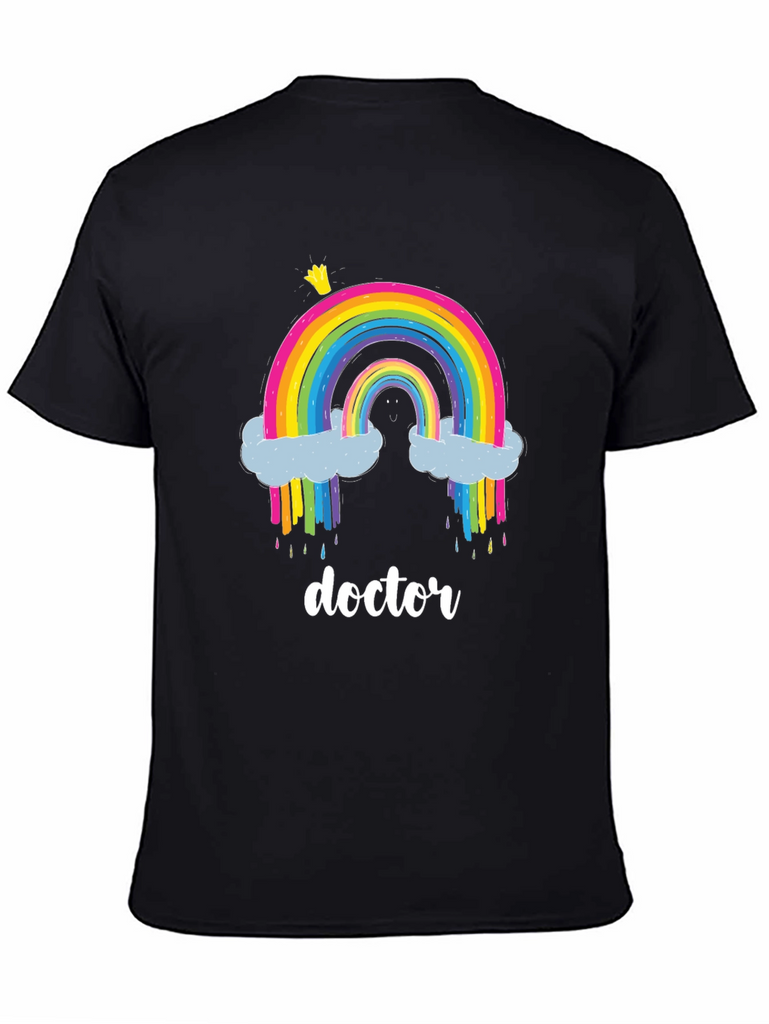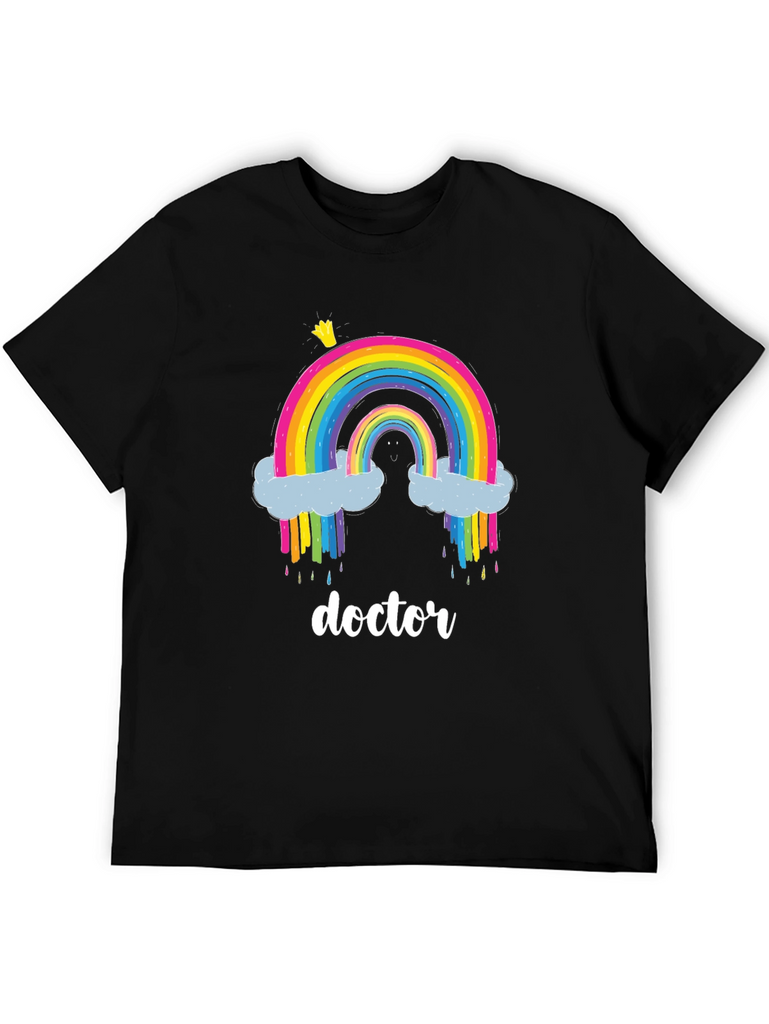 Show your appreciation for doctors with this cheerful black t-shirt. It features a vibrant rainbow graphic with a small crown on top and a smaller inner rainbow character, both set upon fluffy clouds, and a colorful drip effect. The word "doctor" is written underneath in a clean, white font. Made from a soft, breathable fabric, this tee combines comfort and style, perfect for everyday wear or to gift to a healthcare hero. Add a touch of whimsy to your wardrobe with this playful design!
