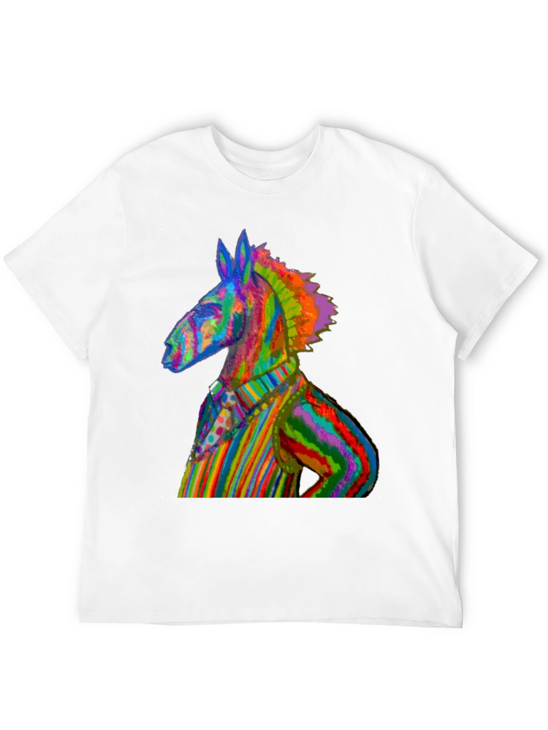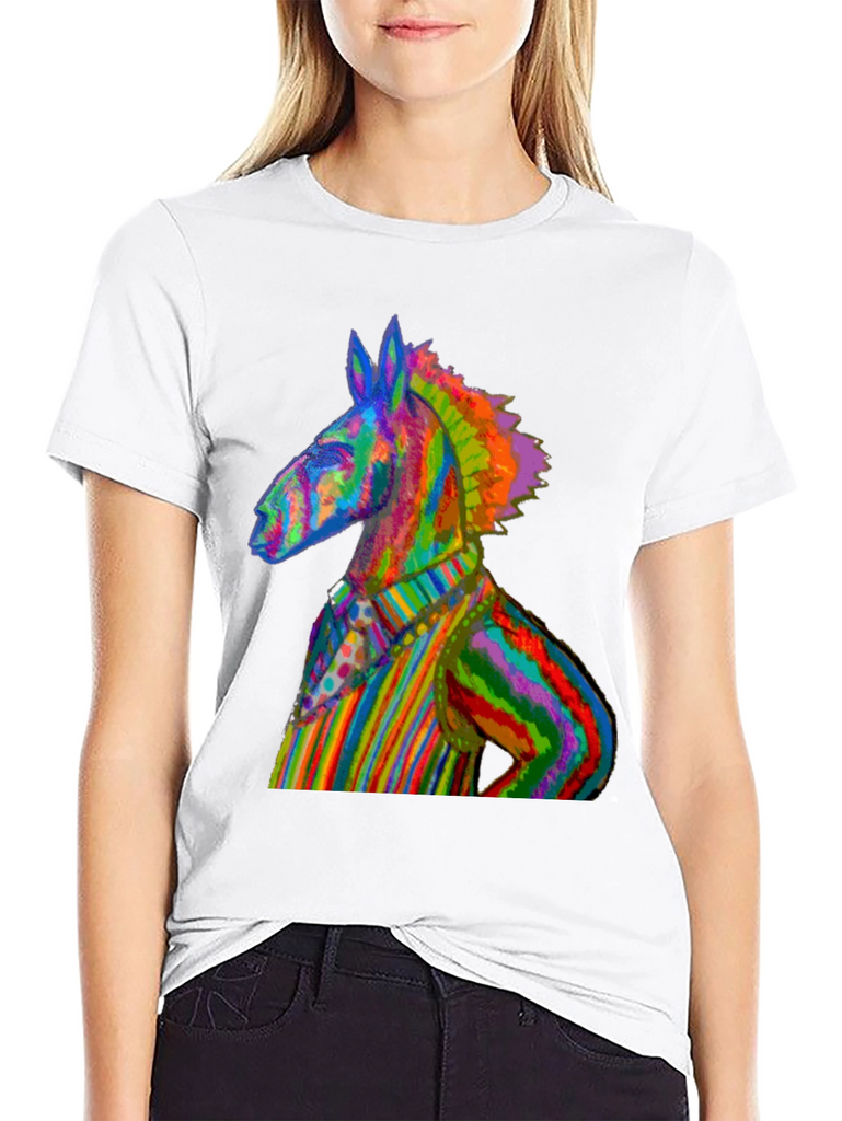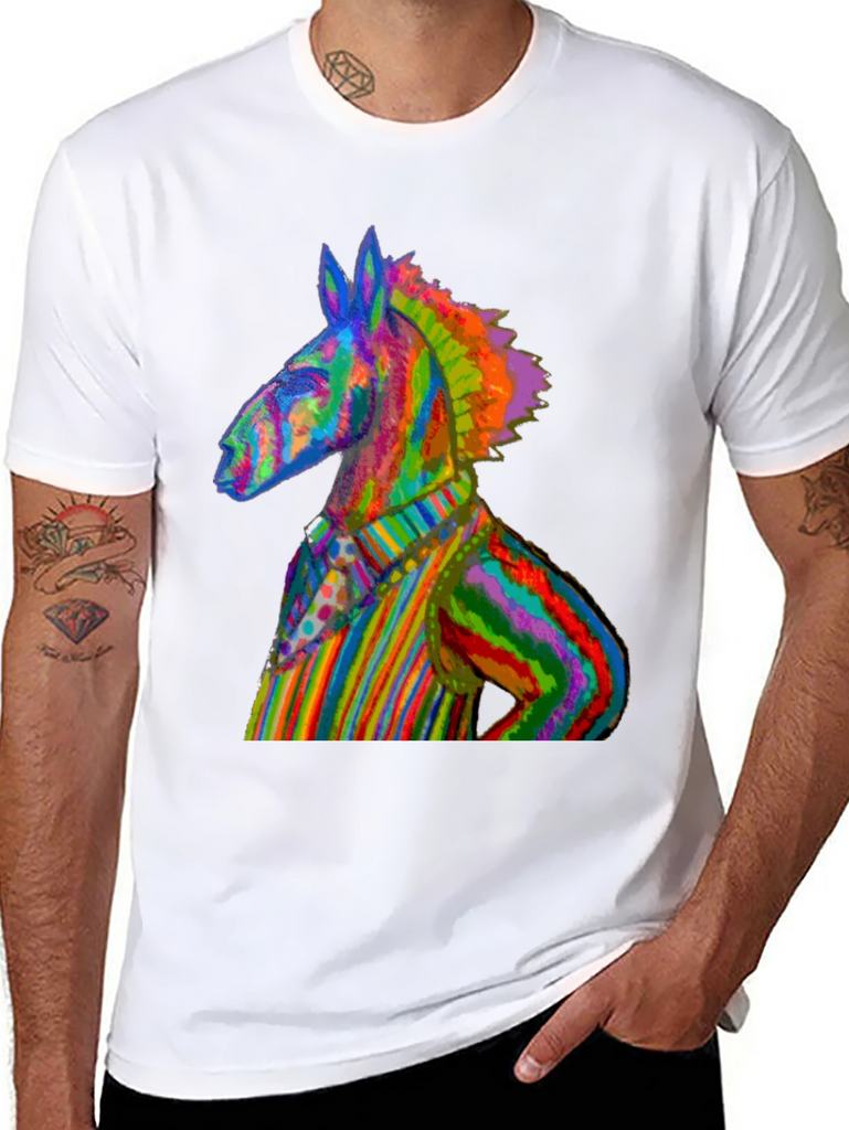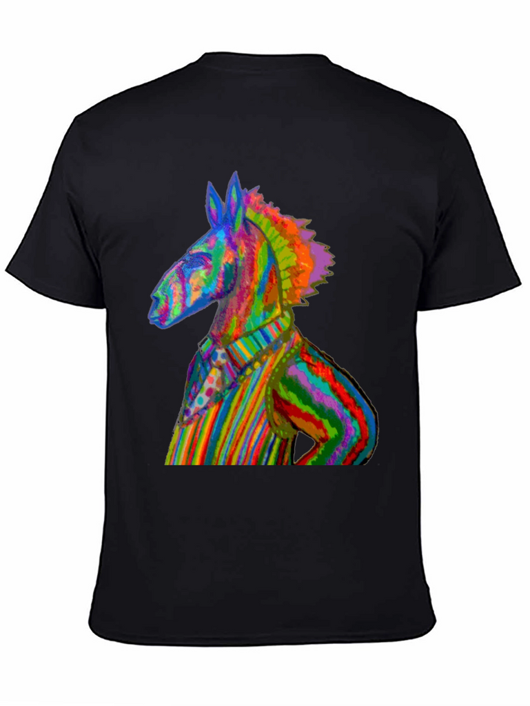 Make a vibrant statement with this eye-catching black t-shirt featuring a rainbow-striped donkey graphic. The unique design showcases a donkey dressed in a colorful striped outfit, creating a playful and artistic look. Made from comfortable, breathable fabric, this tee is perfect for everyday wear. This t-shirt is a conversation starter, ideal for expressing your individuality and love for quirky art. Whether you're heading to a casual hangout, a music festival, or simply want to add a pop of color to your wardrobe, this Rainbow Donkey Tee is a perfect choice. Show off your unique sense of style with this standout piece!