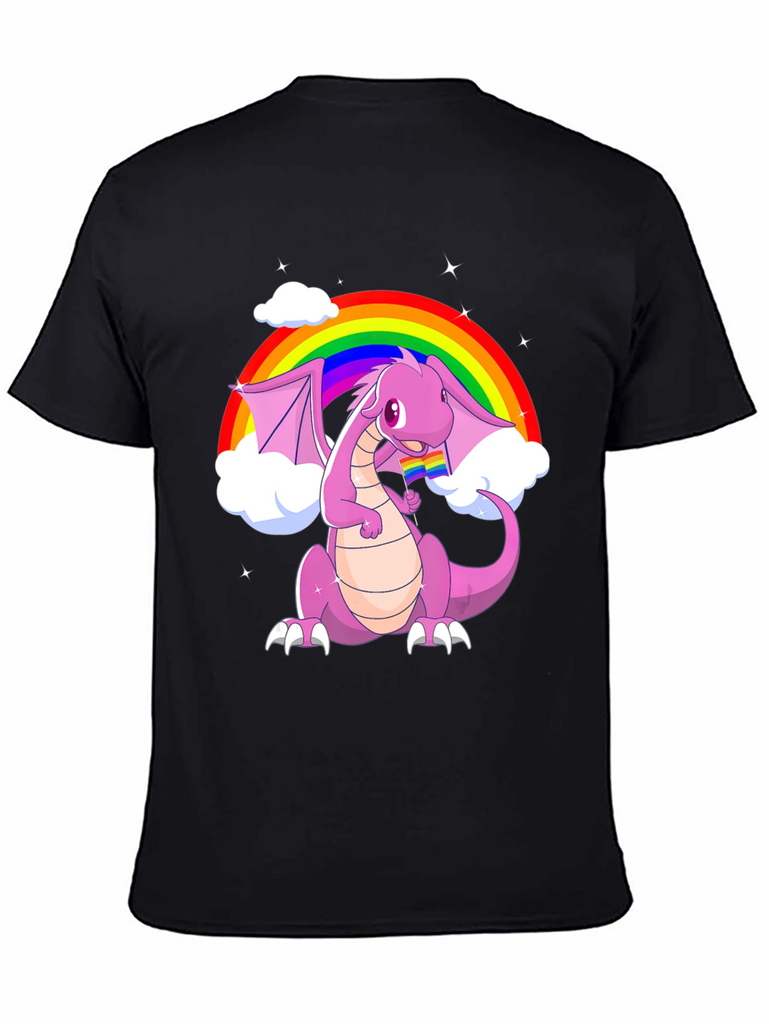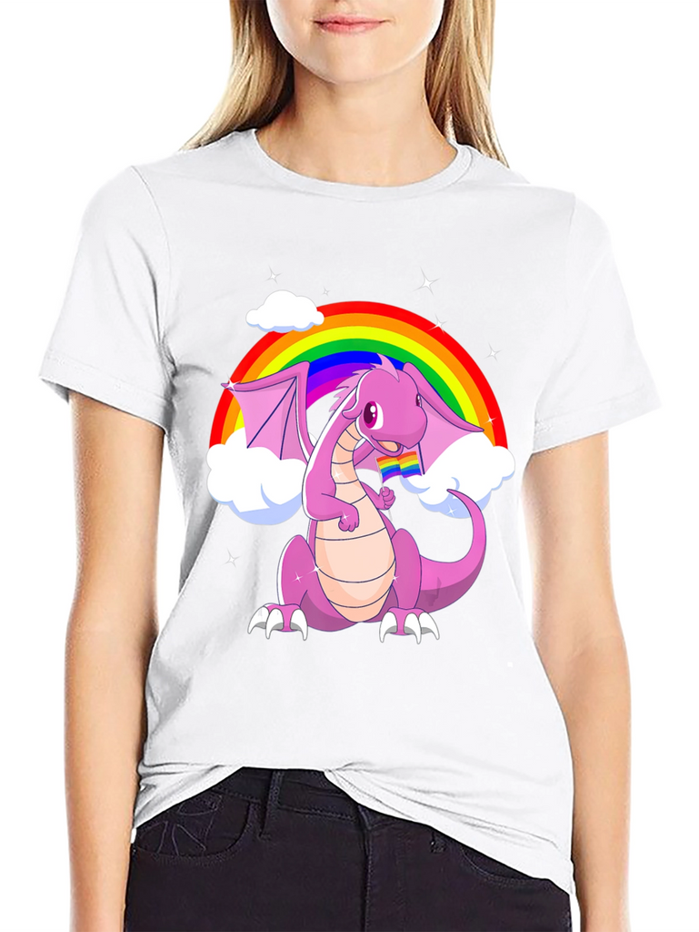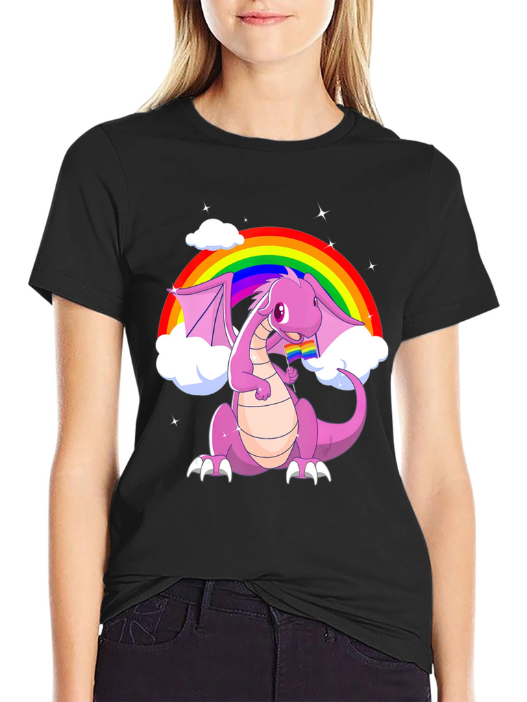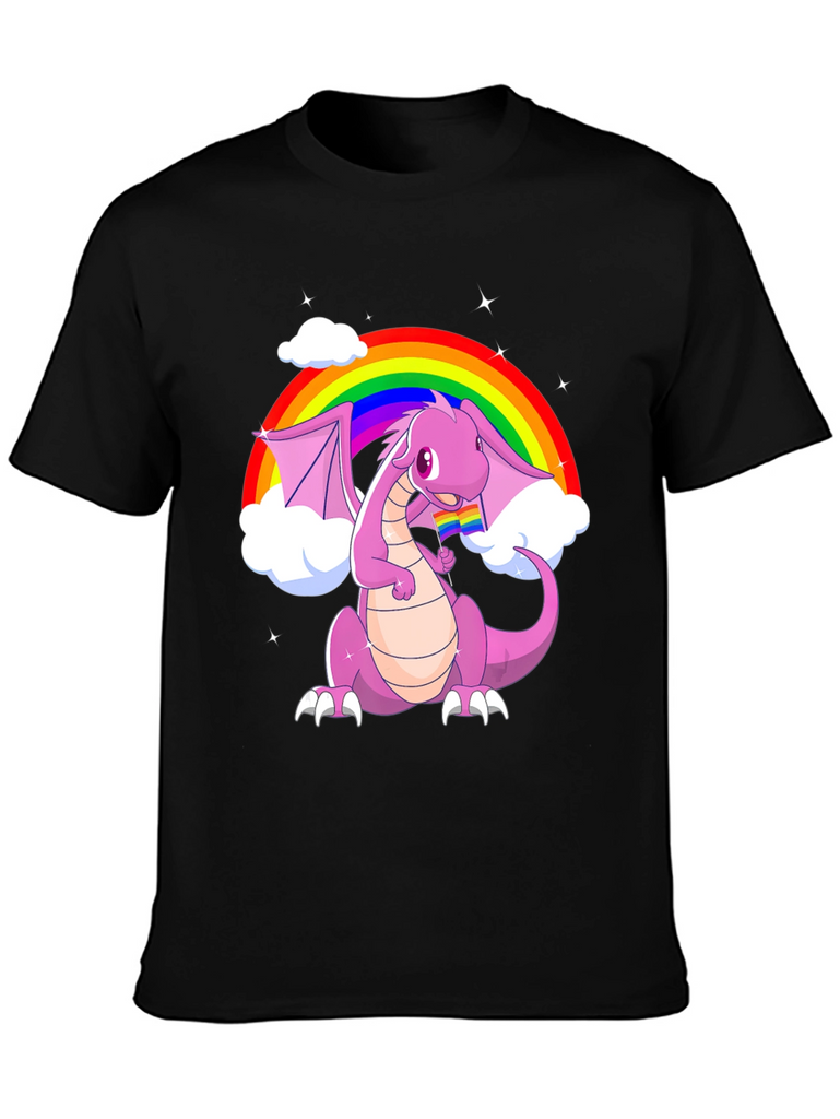 Show your pride with this eye-catching t-shirt featuring a charming pink dragon. The dragon holds a pride flag against a vibrant rainbow and cloud backdrop, complete with sparkling stars. This soft, black t-shirt offers a comfortable fit, ideal for everyday wear or special events. Perfect for expressing your identity and adding a playful touch to your wardrobe, this shirt is sure to turn heads and spark conversations. Wear it to parades, parties, or casual outings to spread positivity and celebrate diversity. Makes a thoughtful and stylish gift!