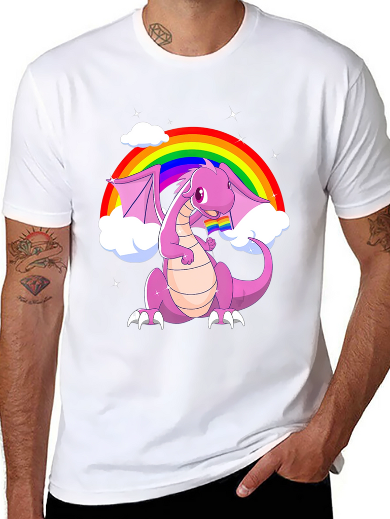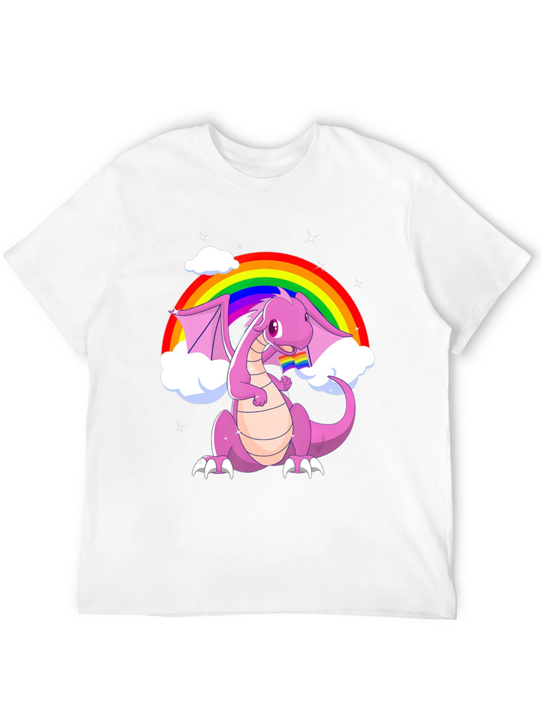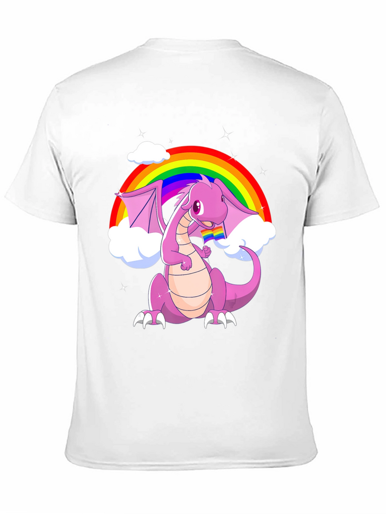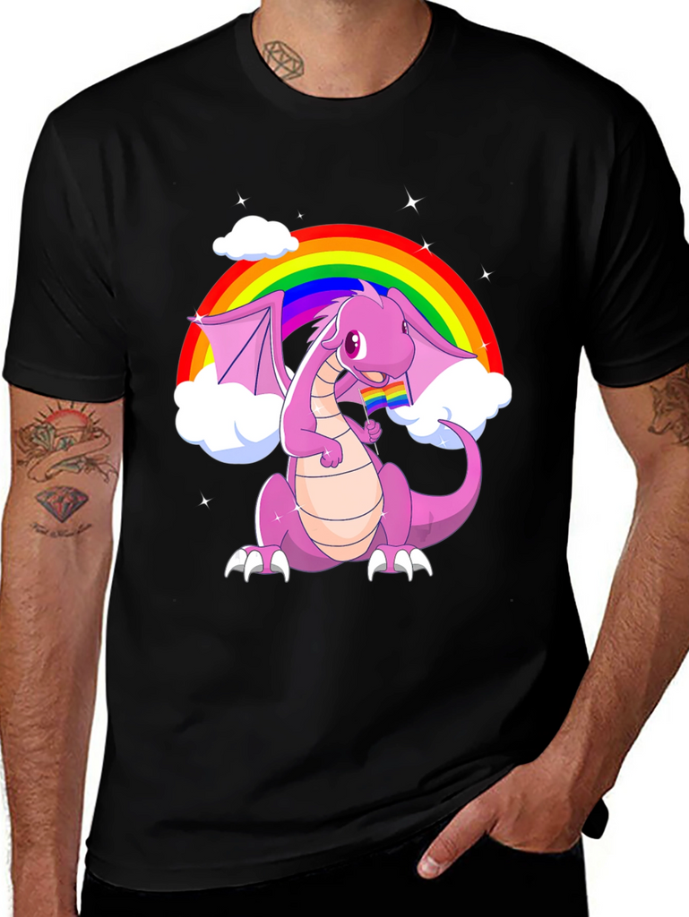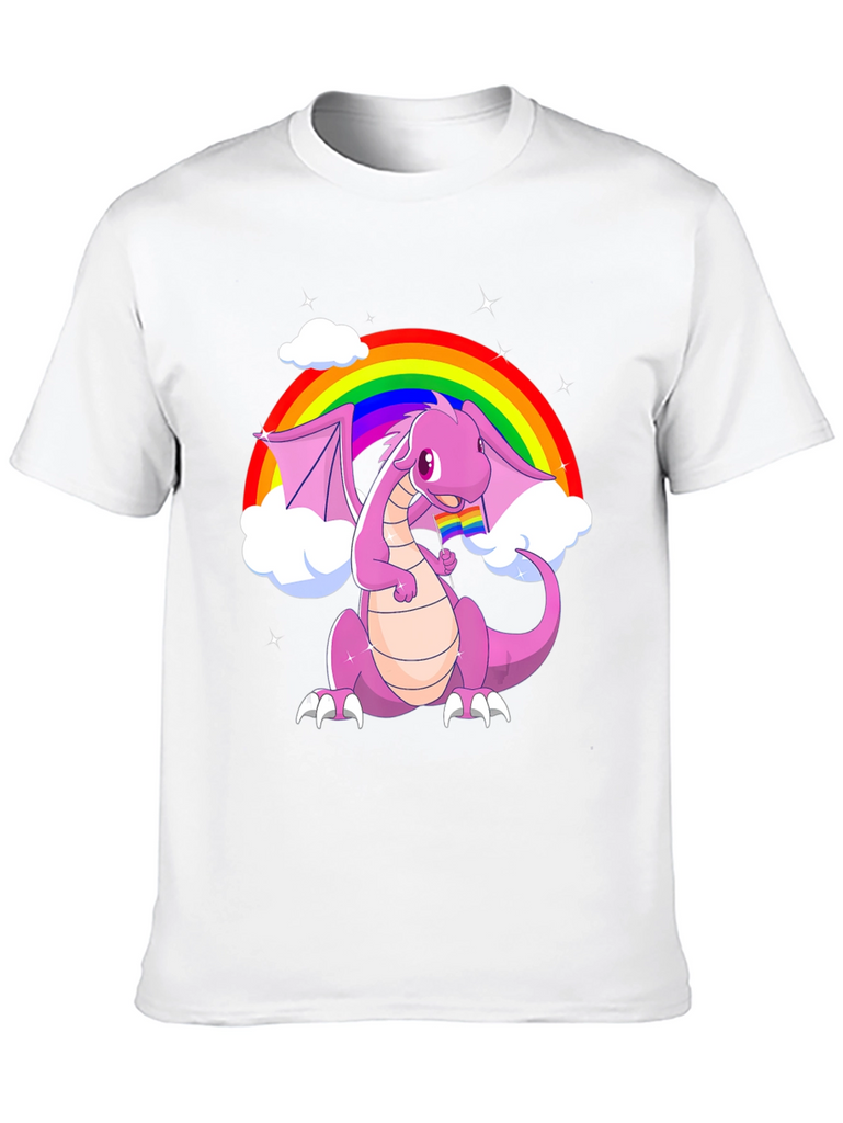 Show your pride with this eye-catching t-shirt featuring a charming pink dragon. The dragon holds a pride flag against a vibrant rainbow and cloud backdrop, complete with sparkling stars. This soft, black t-shirt offers a comfortable fit, ideal for everyday wear or special events. Perfect for expressing your identity and adding a playful touch to your wardrobe, this shirt is sure to turn heads and spark conversations. Wear it to parades, parties, or casual outings to spread positivity and celebrate diversity. Makes a thoughtful and stylish gift!