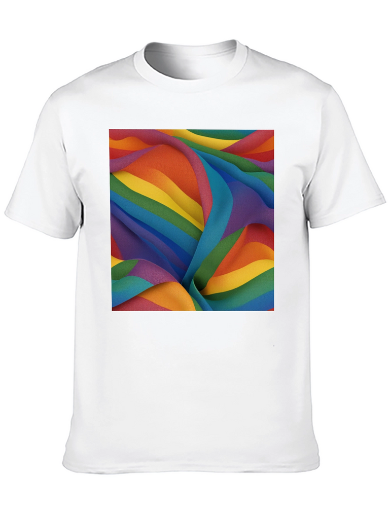 Show your pride with this vibrant black t-shirt featuring a colorful rainbow fabric pattern. The design showcases a beautifully draped material with interwoven shades of red, orange, yellow, green, blue, and purple, creating a mesmerizing visual effect. Made from a comfortable material, this tee is ideal for casual wear, pride events, or making a statement. It is versatile enough to pair with jeans, shorts, or even dress pants. The bold graphic print and classic fit make it a standout piece in any wardrobe. Get yours now!