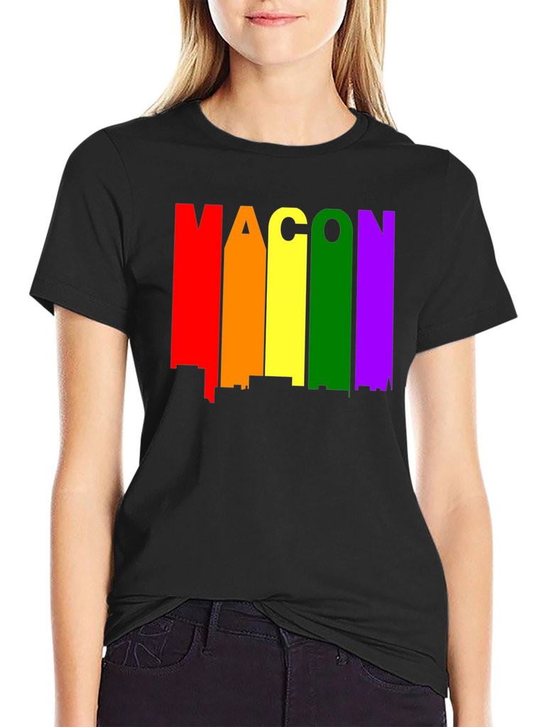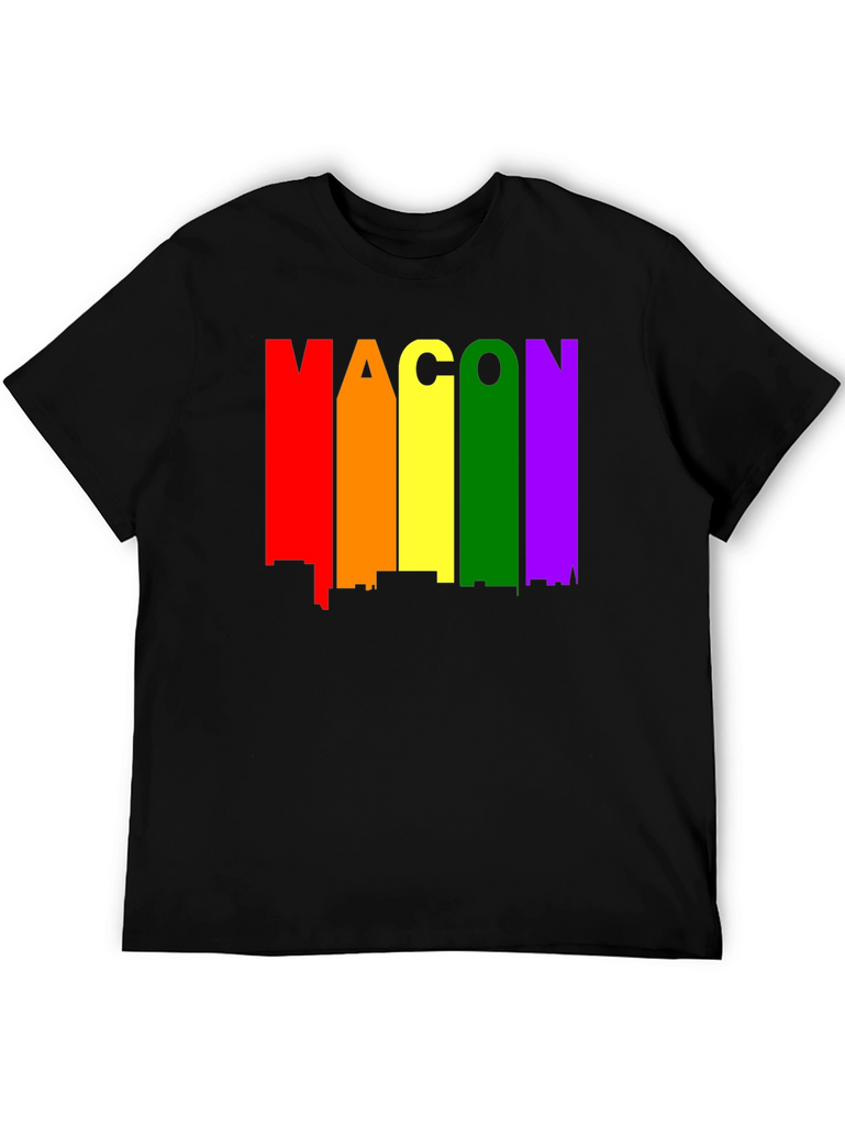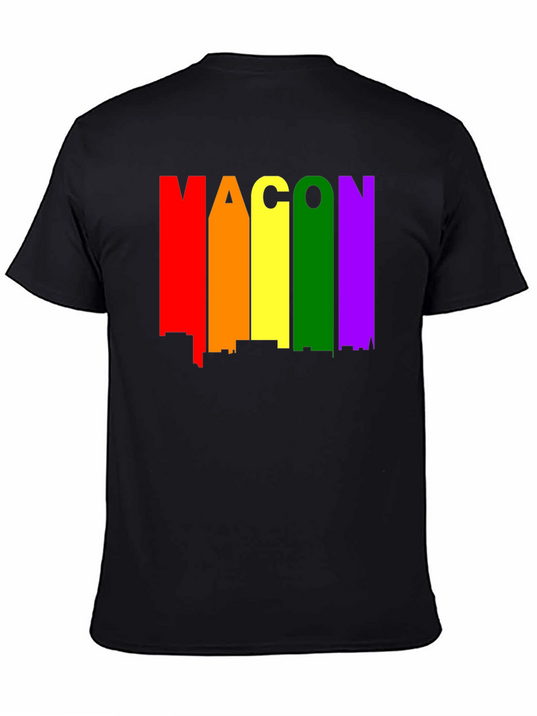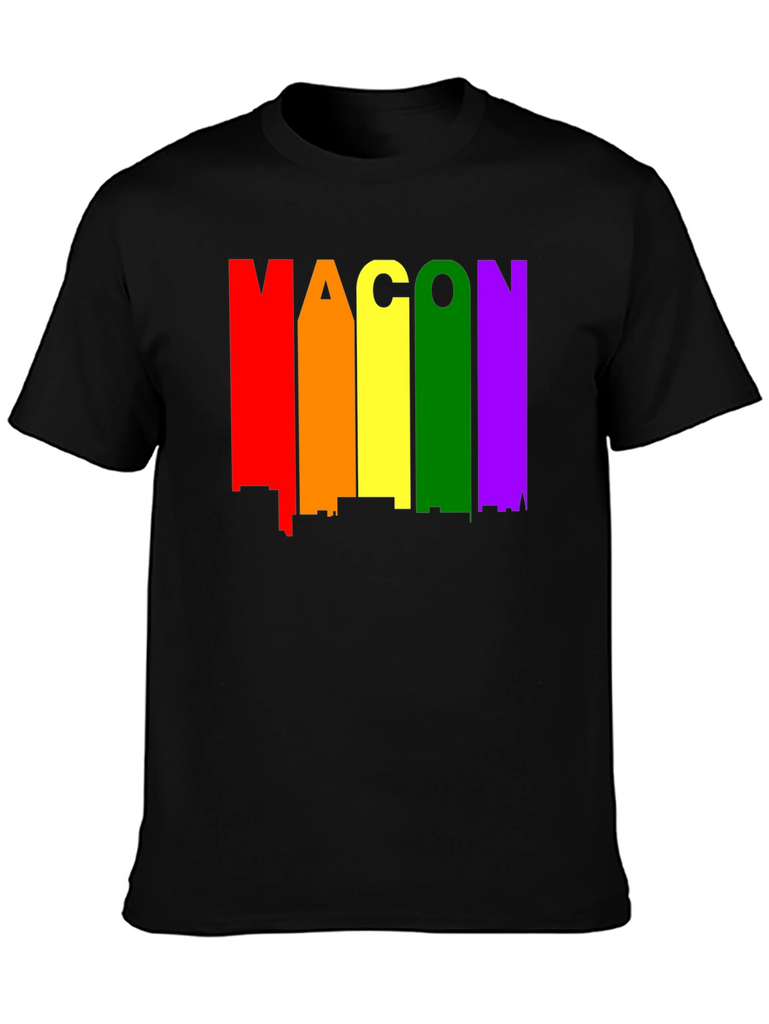 Show your pride with this stylish black t-shirt featuring a colorful rainbow Macon skyline design. The graphic includes the word "MACON" in vibrant rainbow colors with the silhouette of the city skyline below. Made from a comfortable material, this shirt is perfect for casual wear. Whether you're exploring the city or attending a pride event, this shirt is a great way to express yourself and show your support for the community.