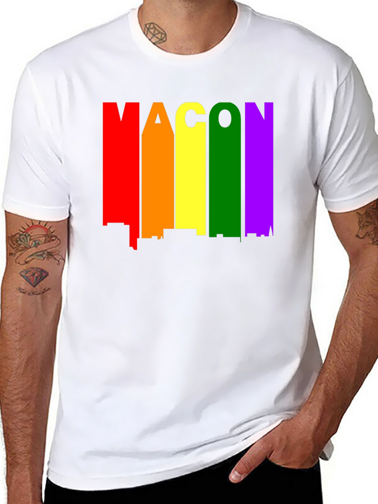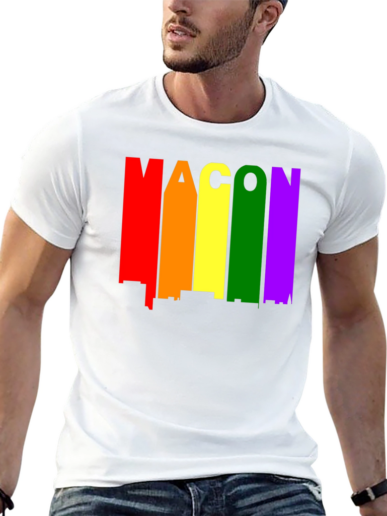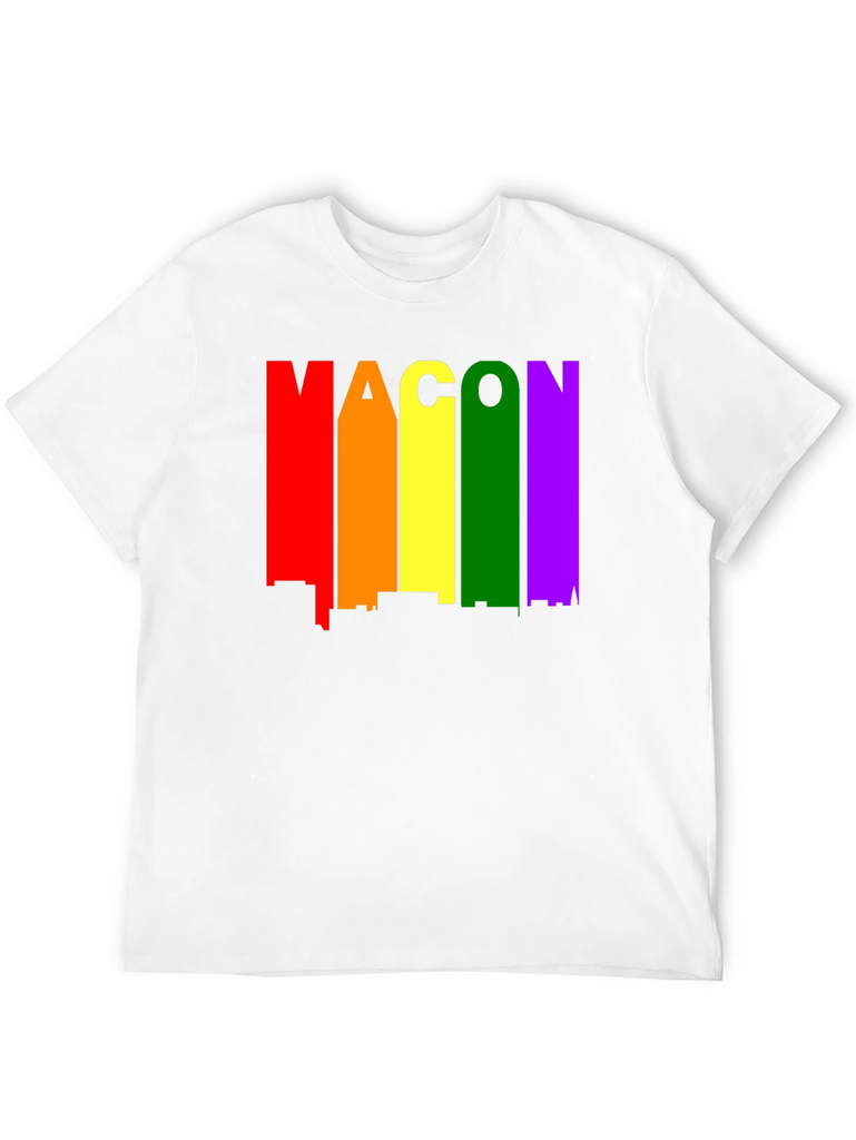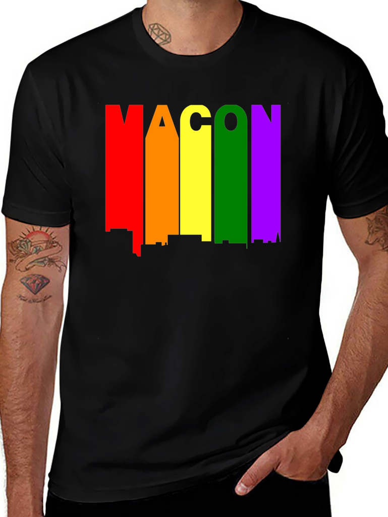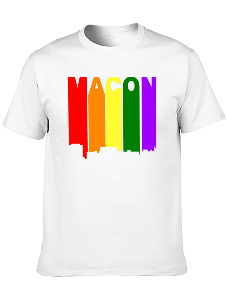 Show your pride with this stylish black t-shirt featuring a colorful rainbow Macon skyline design. The graphic includes the word "MACON" in vibrant rainbow colors with the silhouette of the city skyline below. Made from a comfortable material, this shirt is perfect for casual wear. Whether you're exploring the city or attending a pride event, this shirt is a great way to express yourself and show your support for the community.