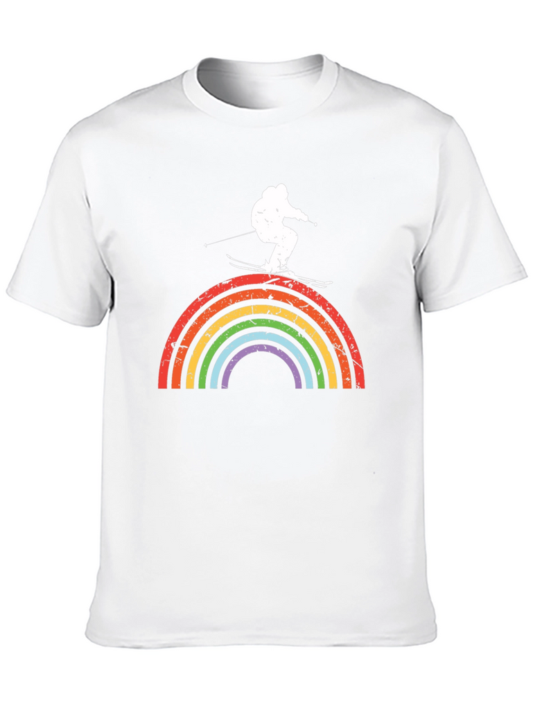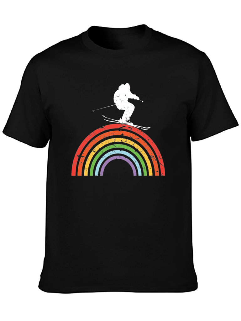 This stylish black t-shirt features a unique graphic design: a silhouette of a skier riding a rainbow! The rainbow, depicted in vibrant red, orange, yellow, green, blue, and purple stripes, curves elegantly to create a visually striking and playful effect. Made from what appears to be a soft and comfortable cotton blend, this tee is perfect for everyday wear or as a statement piece for ski enthusiasts. Show off your love for the slopes and add a splash of color to your wardrobe with this eye-catching and fun tee. It's ideal for casual outings, ski trips, or simply lounging around.