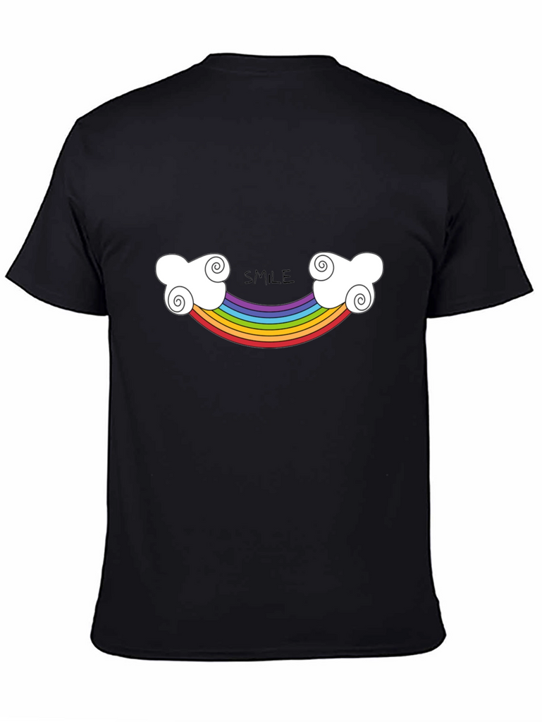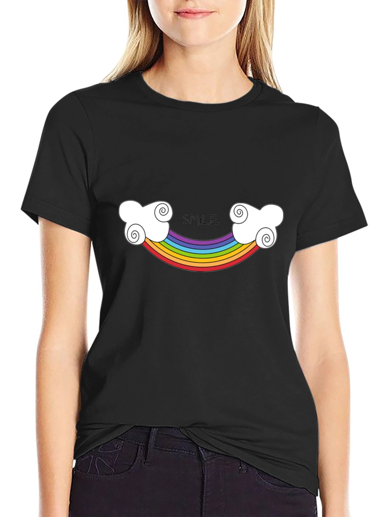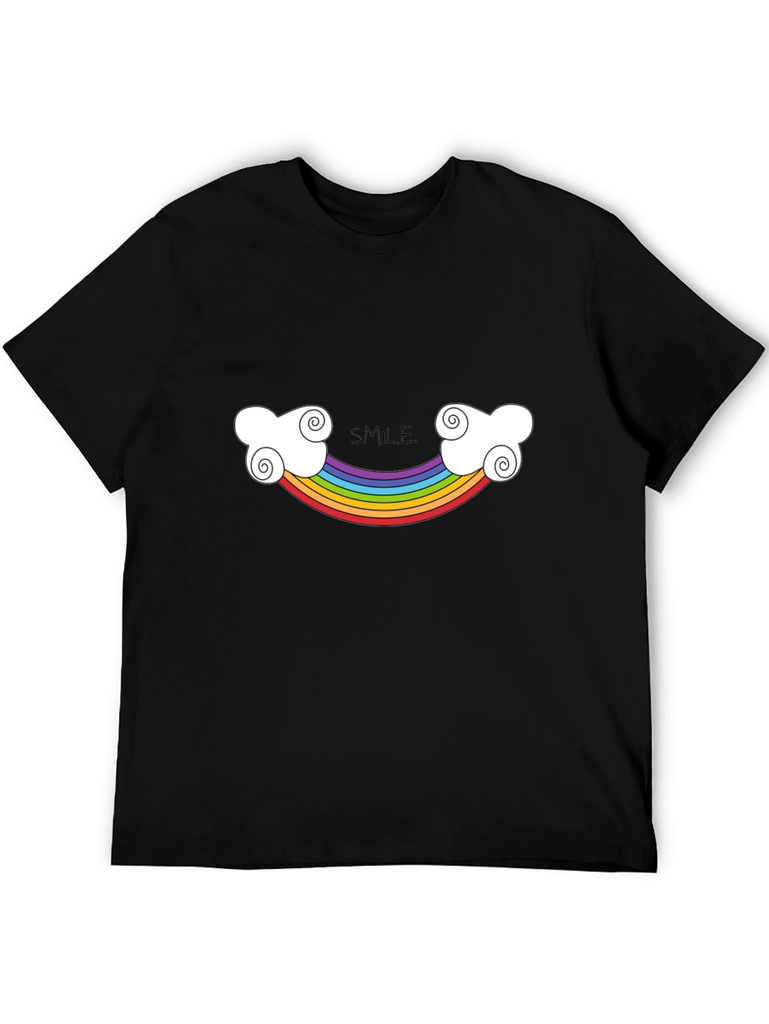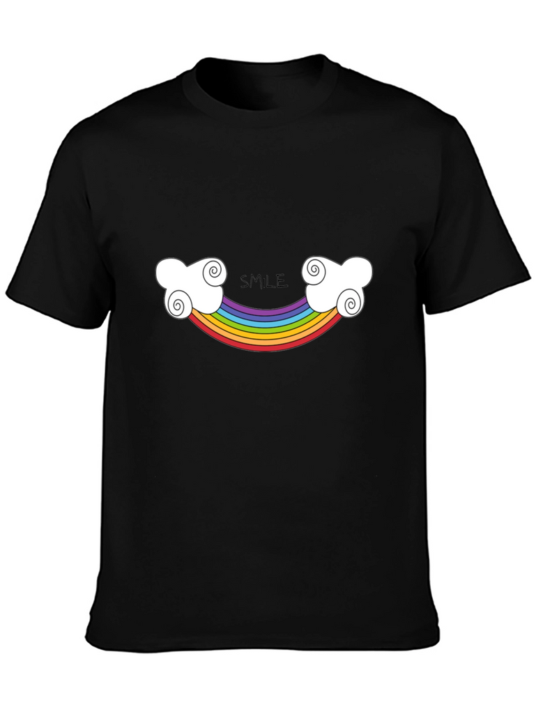 Brighten your day with this stylish black T-shirt featuring a whimsical rainbow graphic. The rainbow arcs between two fluffy white clouds, complete with playful spiral details. Above the rainbow, the word "SMILE" is subtly printed, adding to the cheerful vibe. Made from a soft and comfortable material, this tee is perfect for casual wear. Show off your fun-loving side, pair with jeans or shorts, and spread the joy! Ideal for everyday wear or as a unique gift.