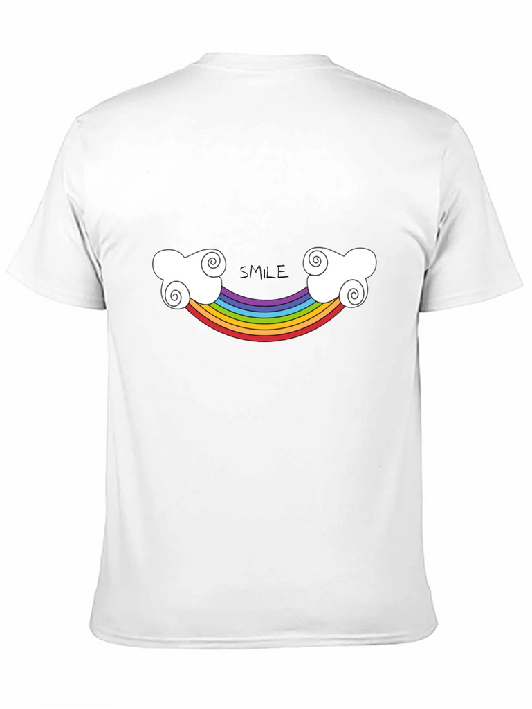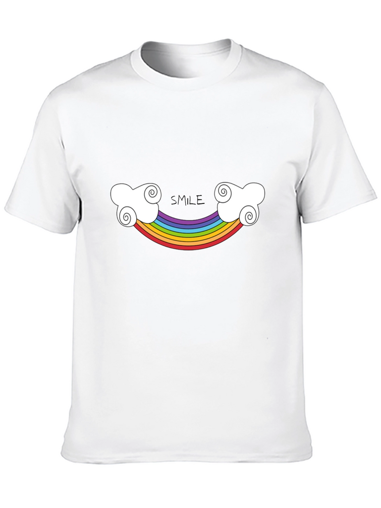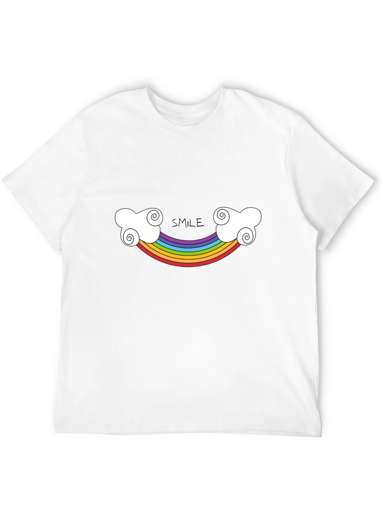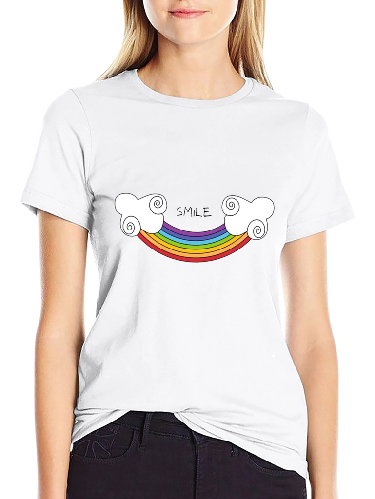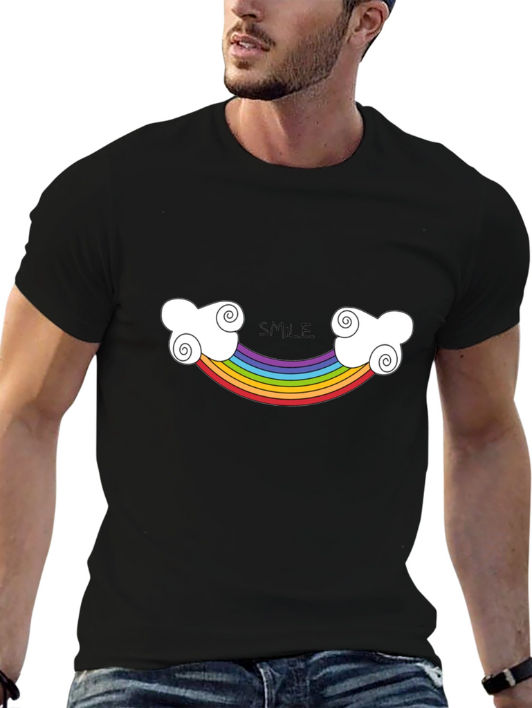 Brighten your day with this stylish black T-shirt featuring a whimsical rainbow graphic. The rainbow arcs between two fluffy white clouds, complete with playful spiral details. Above the rainbow, the word "SMILE" is subtly printed, adding to the cheerful vibe. Made from a soft and comfortable material, this tee is perfect for casual wear. Show off your fun-loving side, pair with jeans or shorts, and spread the joy! Ideal for everyday wear or as a unique gift.