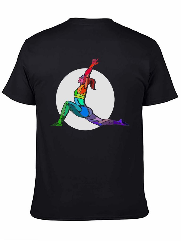Show off your passion for yoga and vibrant style with this unique graphic t-shirt. The shirt features a striking rainbow-colored illustration of a woman in a yoga pose, set against a contrasting background. Made from a soft, comfortable fabric, this tee is perfect for everyday wear, workouts, or yoga sessions. The bold graphic adds a pop of color and personality to any outfit. Whether you're a dedicated yogi or simply appreciate eye-catching designs, this t-shirt is a must-have addition to your wardrobe. Embrace comfort and express your love for yoga with this stylish and meaningful tee.