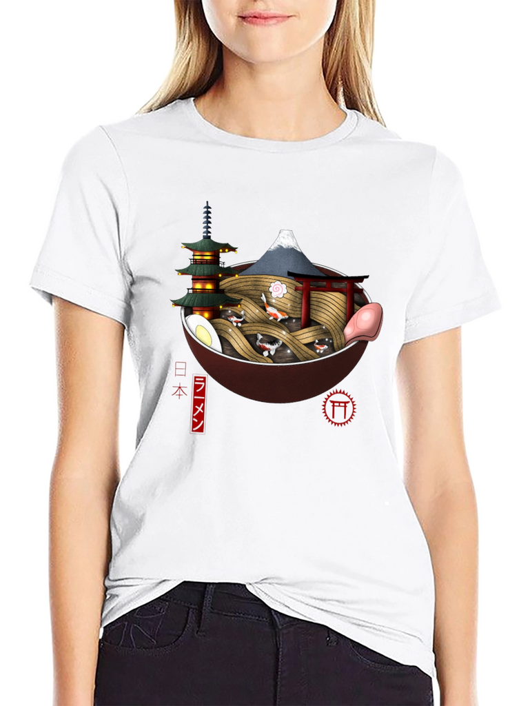 This eye-catching black t-shirt features a unique graphic design. The design showcases a detailed illustration of a ramen bowl filled with elements of Japan. It features a traditional Japanese building, Mount Fuji, fish, and a Torii gate. The design also includes Japanese lettering, adding an authentic touch. The t-shirt is made of a comfortable fabric. Great for casual wear, this tee is perfect for Japanophiles and ramen lovers alike. It's a great way to express your interests.