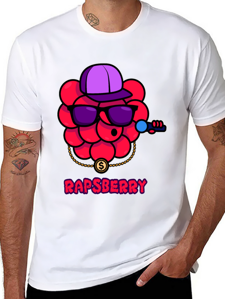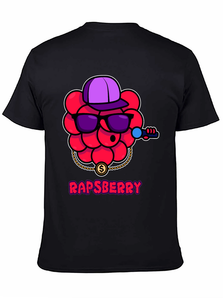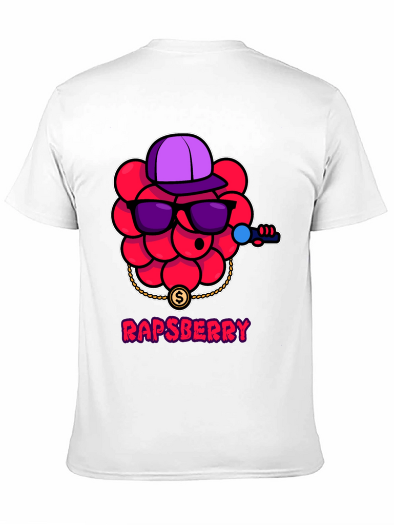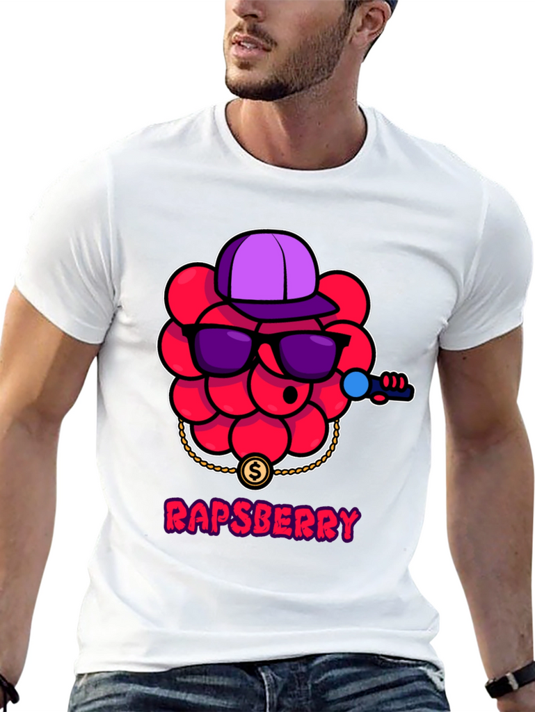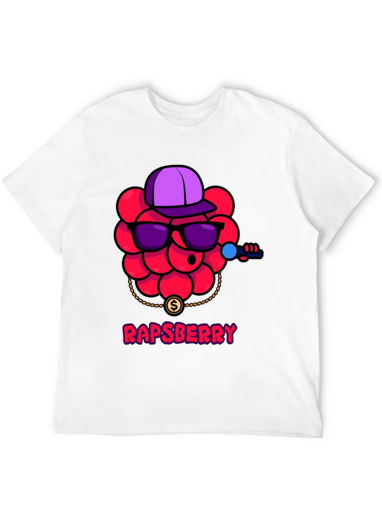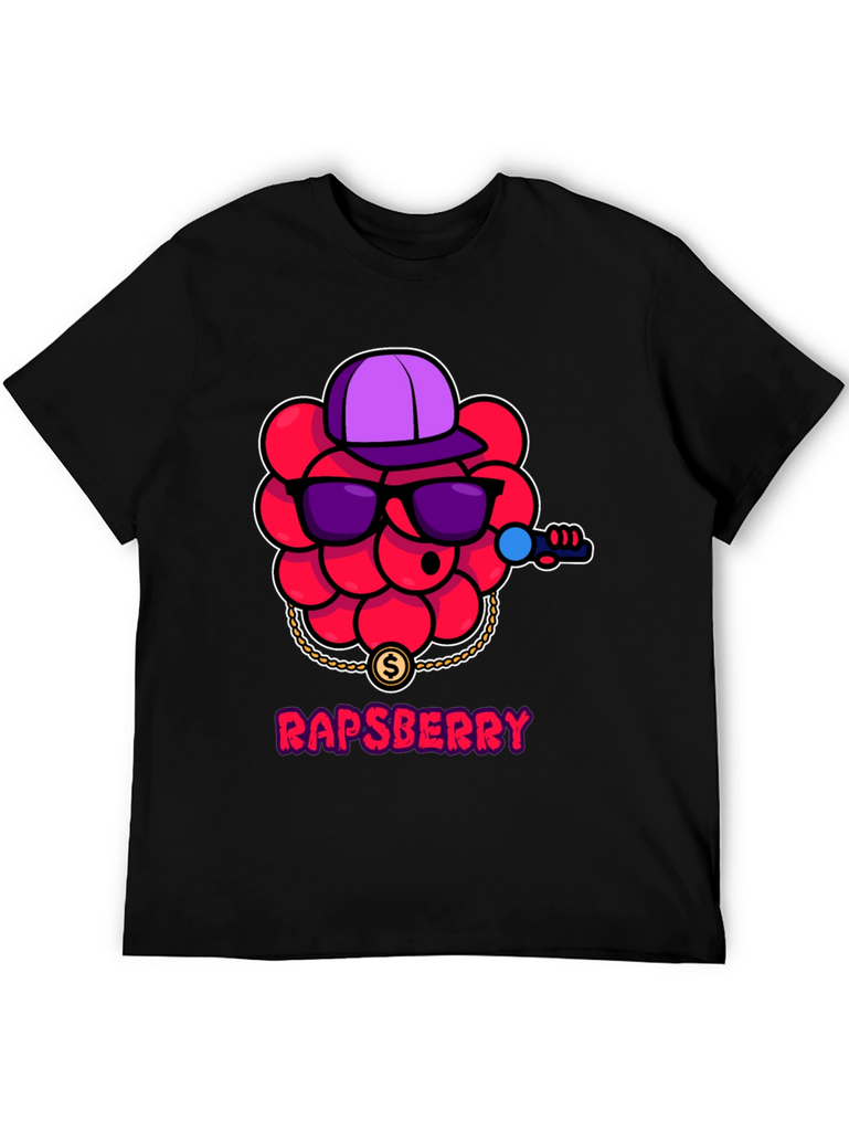 Rock a fresh look with this unique graphic t-shirt! Featuring a cartoon raspberry character sporting sunglasses, a backwards hat, and a microphone, this tee brings a playful hip-hop vibe to your wardrobe. The vibrant design includes a gold chain with a dollar sign pendant, adding a touch of street style. The word 'Rapberry' is emblazoned beneath the character in a bold, eye-catching font. Made from a comfortable, breathable fabric, this t-shirt is perfect for casual outings, music events, or just expressing your fun personality. Stand out from the crowd with this stylish and humorous tee!