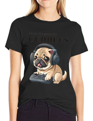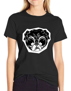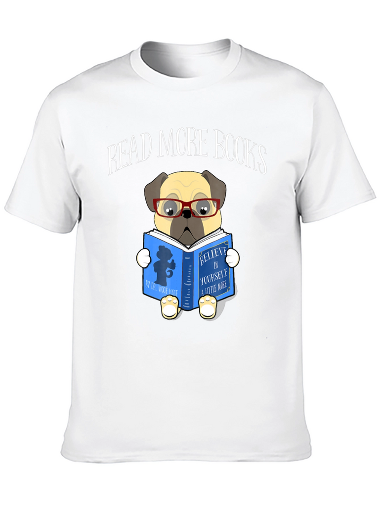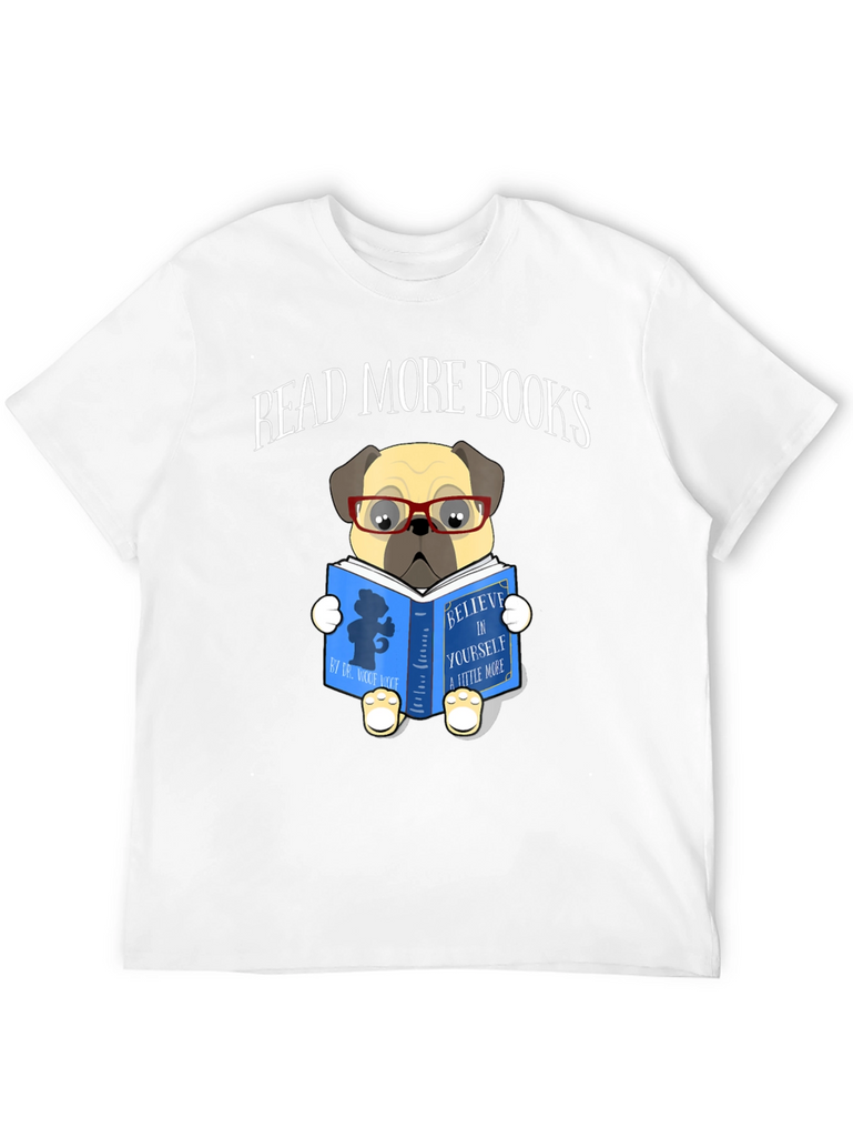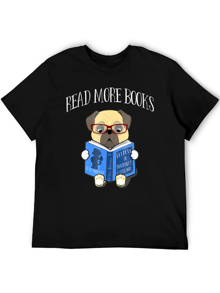 This black t-shirt features a charming graphic print of a pug dog wearing glasses and reading a book. The book cover reads "Believe in Yourself a Little More". Above the pug illustration are the words "Read More Books". The shirt is perfect for book lovers and dog enthusiasts alike. Made from a comfortable-looking fabric, this tee is ideal for casual wear, library visits, or cozying up with a good book at home. The unique design adds a touch of whimsy to any outfit, making it a great conversation starter. Show off your love for reading and adorable pets with this eye-catching t-shirt!
