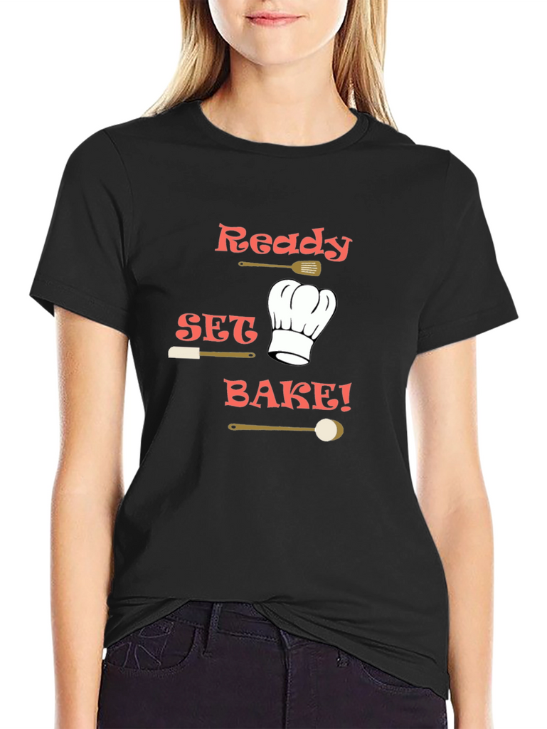 Show off your baking skills with this unique black t-shirt! Featuring a playful 'Ready Set Bake!' graphic, complete with a chef's hat, spatula, whisk and spoon. This tee is perfect for any baking enthusiast, chef or home cook who wants to express their passion in style. Made from soft, comfortable fabric, it's great for everyday wear, baking sessions, or casual outings. Let everyone know you're ready to whip up some delicious treats!