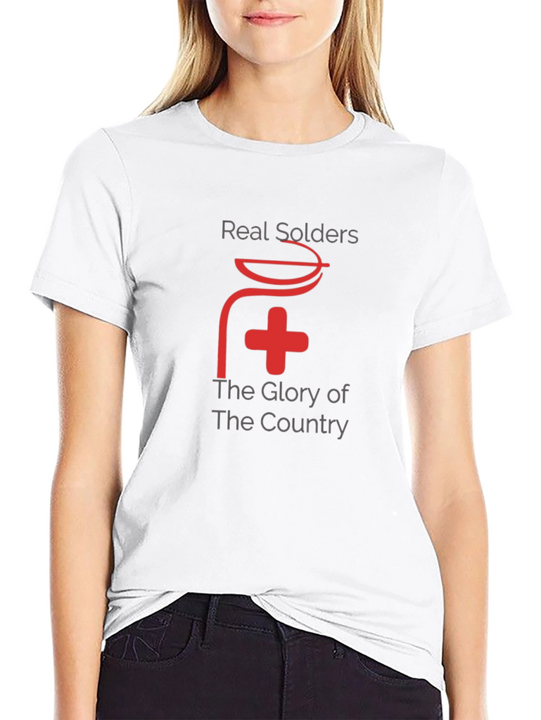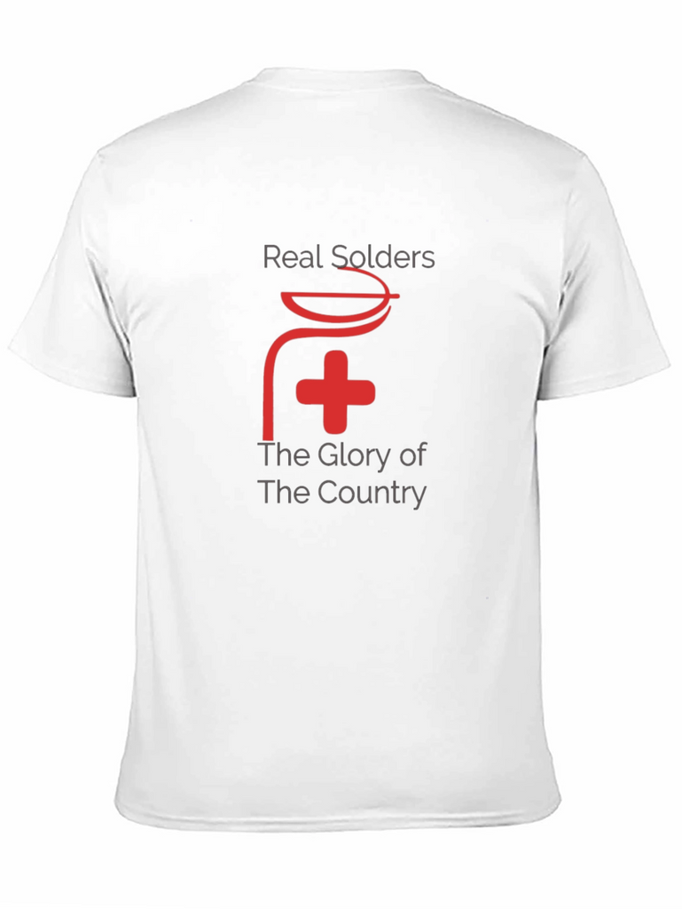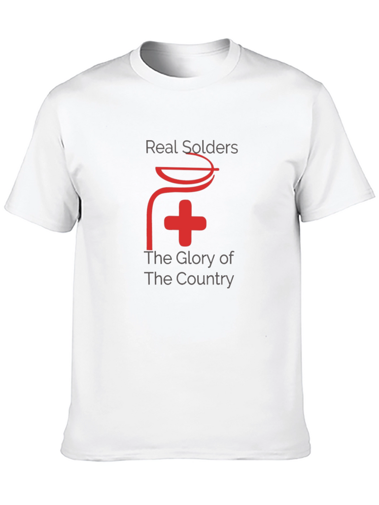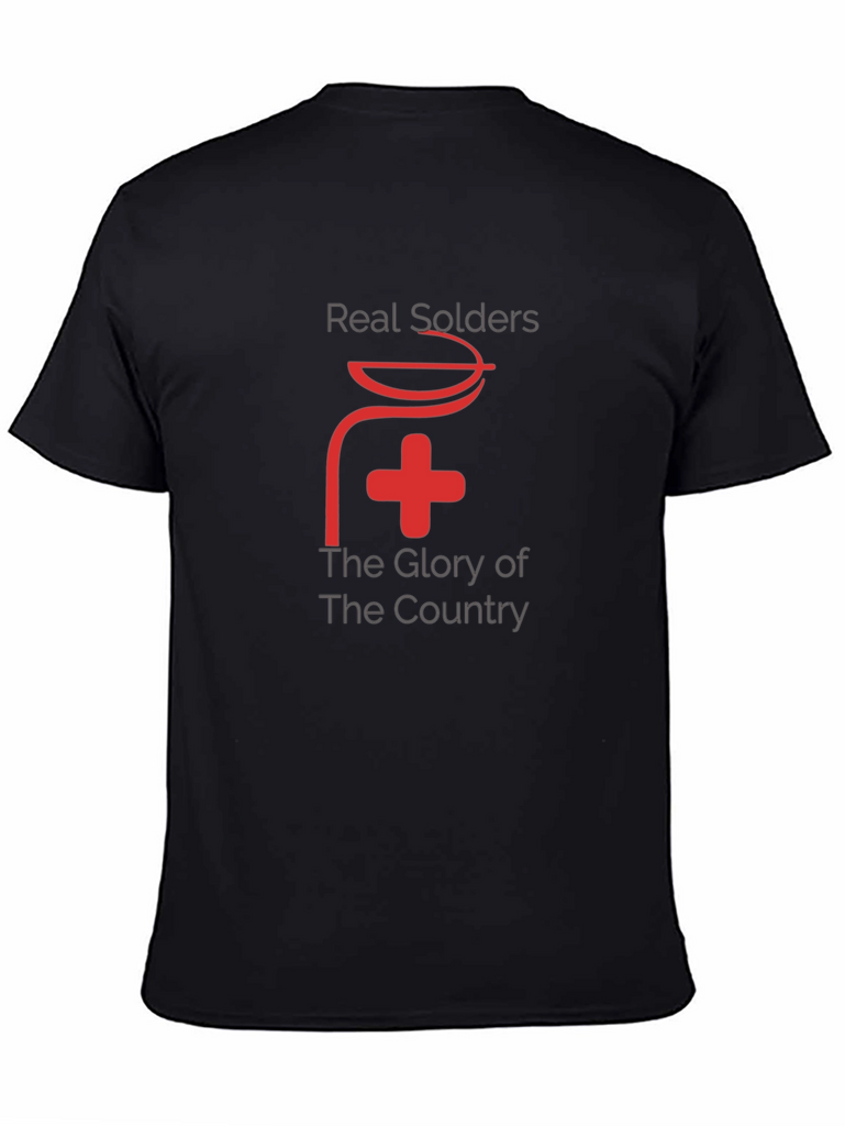 Show your support with this bold black t-shirt featuring a striking red graphic. The design incorporates a stylized symbol and the text "Real Soldiers - The Glory of The Country," ideal for expressing patriotism. Made from comfortable fabric, this tee offers a relaxed fit perfect for everyday wear. Whether you're attending a rally, running errands, or simply want to display your pride, this t-shirt makes a powerful statement. Durable and eye-catching, it's a great addition to any wardrobe.