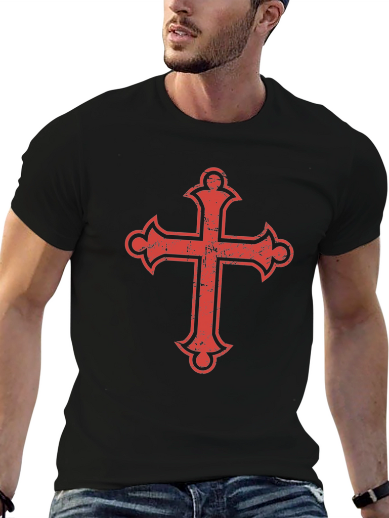 Embrace your faith with this stylish black t-shirt featuring a bold, red distressed cross graphic. Crafted from comfortable, breathable fabric, this tee offers a classic fit suitable for everyday wear. The eye-catching cross design makes a statement, while the distressed finish adds a touch of vintage appeal. Perfect for expressing your beliefs or as a thoughtful gift for someone special. Wear it to church, casual outings, or anywhere you want to showcase your faith with style. This timeless piece will become a staple in your wardrobe.