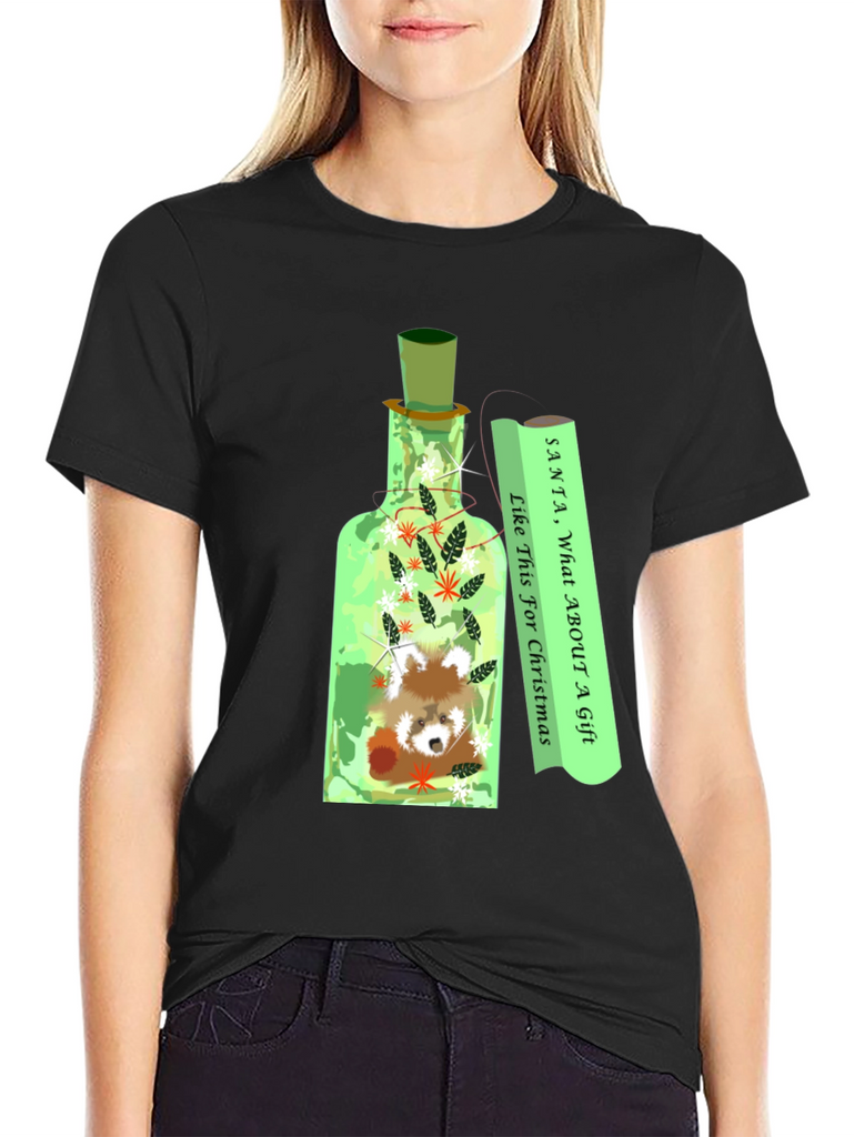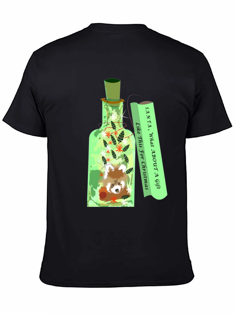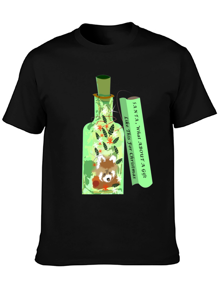Embrace the holiday spirit with this unique graphic t-shirt! The design features an adorable red panda nestled inside a decorative bottle, surrounded by festive foliage. Next to the bottle is a scroll that reads: "Santa, What About A Gift Like This For Christmas". The eye-catching design is perfect for expressing your love for animals and the holiday season. Made from comfortable, breathable fabric, this t-shirt is ideal for casual wear during Christmas festivities, parties, or everyday outings. A great conversation starter and a fun addition to your wardrobe. Get yours today and make a statement!