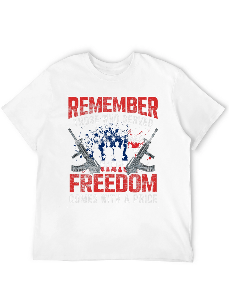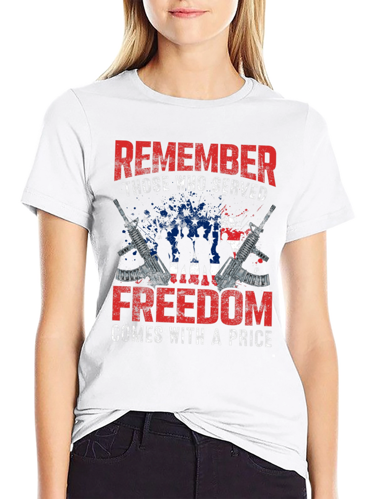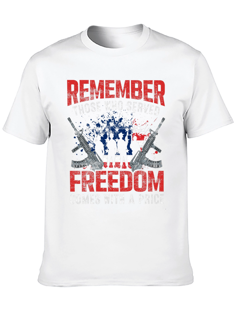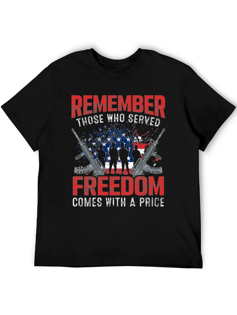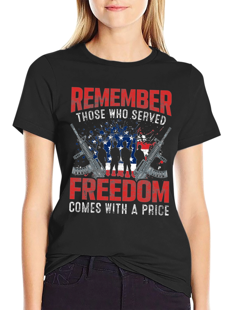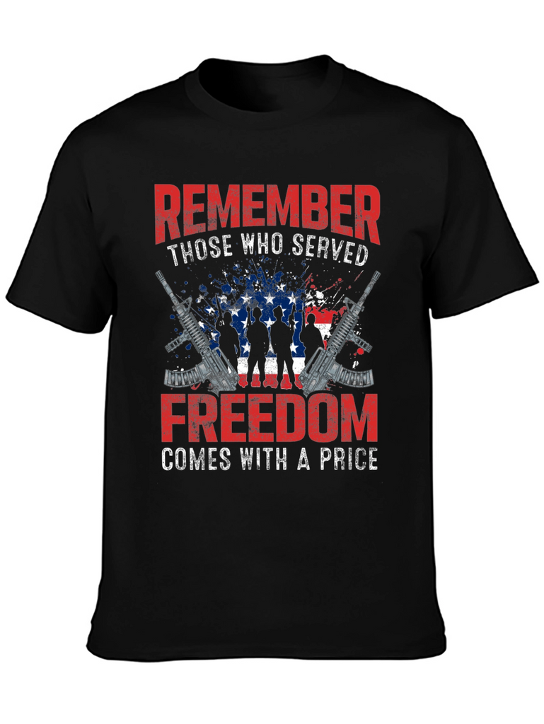 Show your support for our troops with this powerful t-shirt! This black tee features a bold graphic design with the words "Remember Those Who Served" and "Freedom Comes With A Price" in distressed red text. The design also includes silhouettes of soldiers against an American flag backdrop and two rifles. Made from comfortable, breathable fabric, this shirt is perfect for everyday wear, patriotic events, or showing your pride and respect. Let everyone know you honor the sacrifice of our military heroes with this awesome t-shirt!