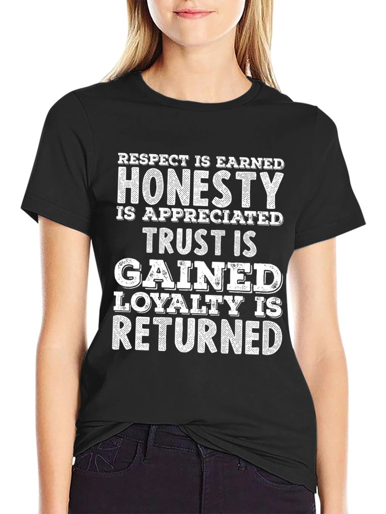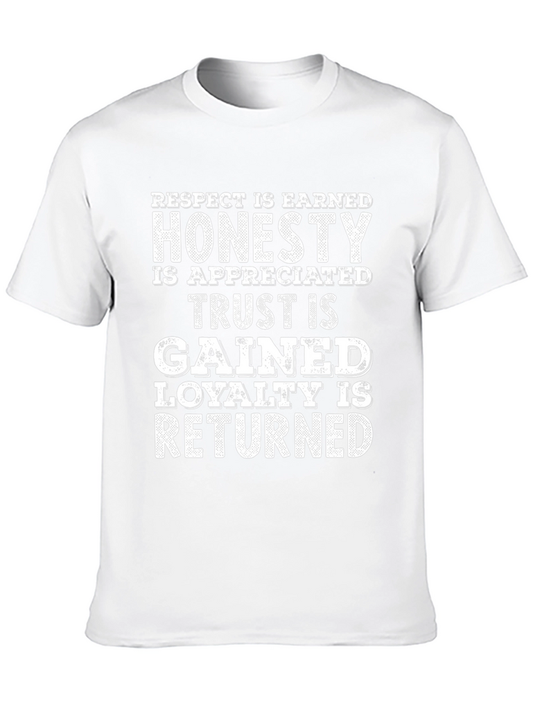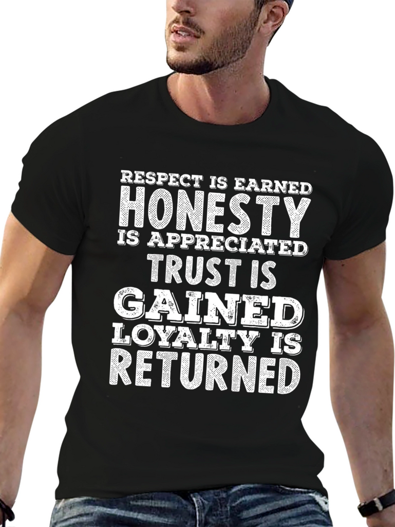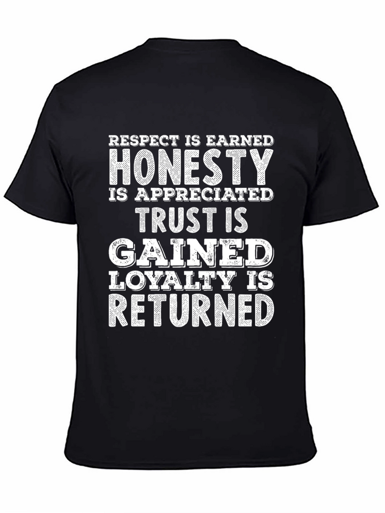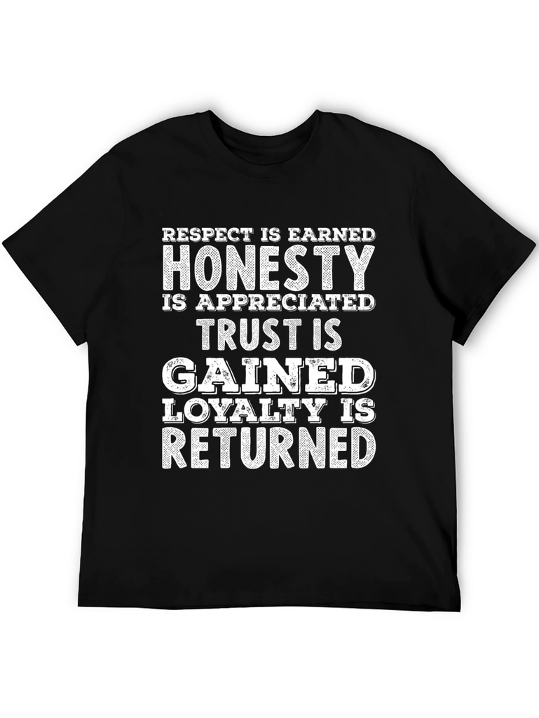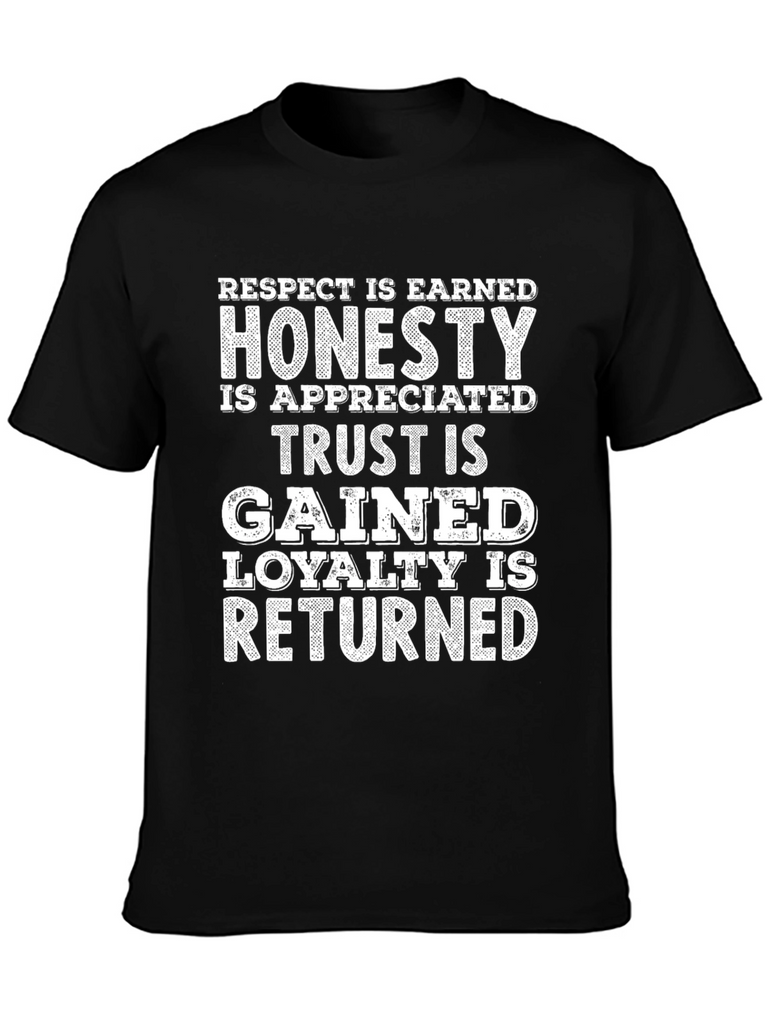 Showcase your values with this bold black t-shirt featuring a striking white graphic print. The design emphasizes the importance of respect, honesty, trust, and loyalty, making it a statement piece that reflects your personal philosophy. Crafted from comfortable, breathable fabric, this tee is perfect for everyday wear. Pair it with jeans or shorts for a casual, confident look. Let your shirt do the talking and inspire those around you to embrace these timeless principles. A must-have for anyone who values integrity and strong character.