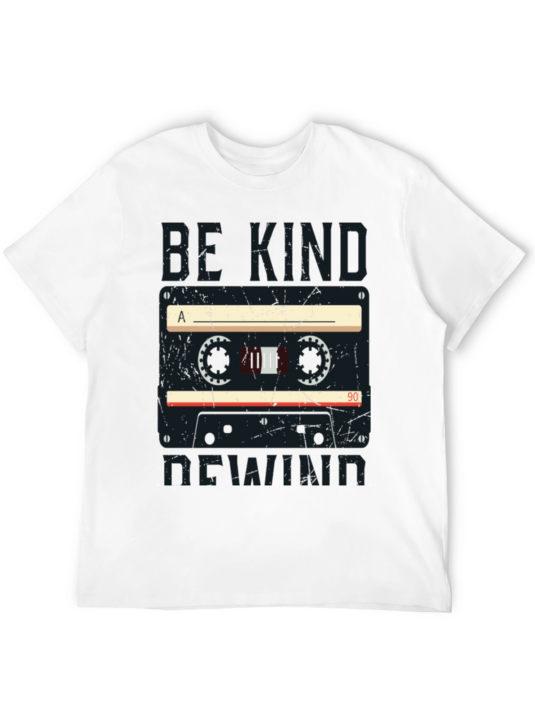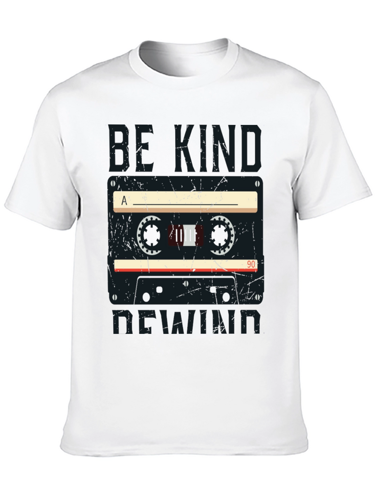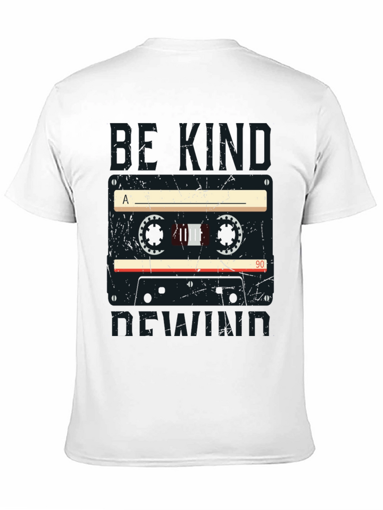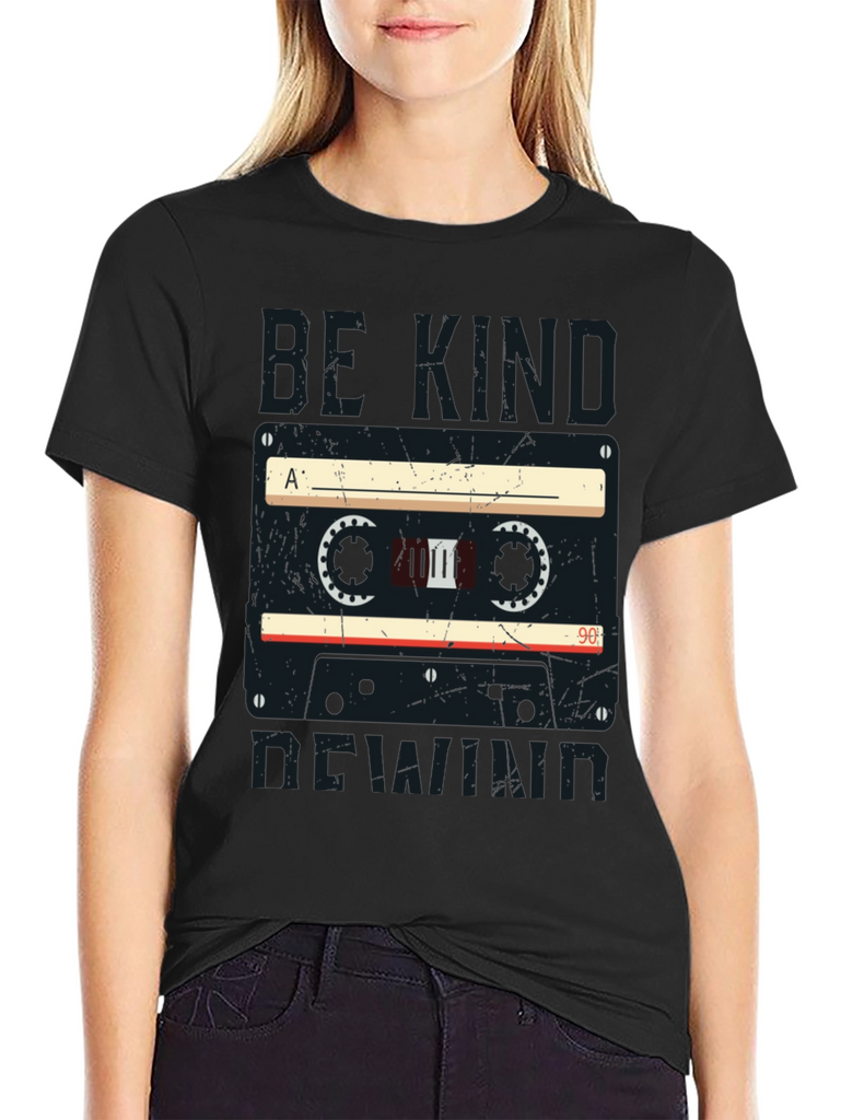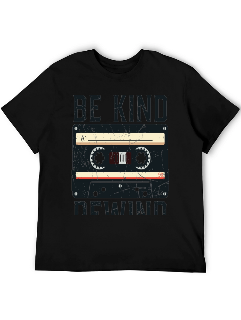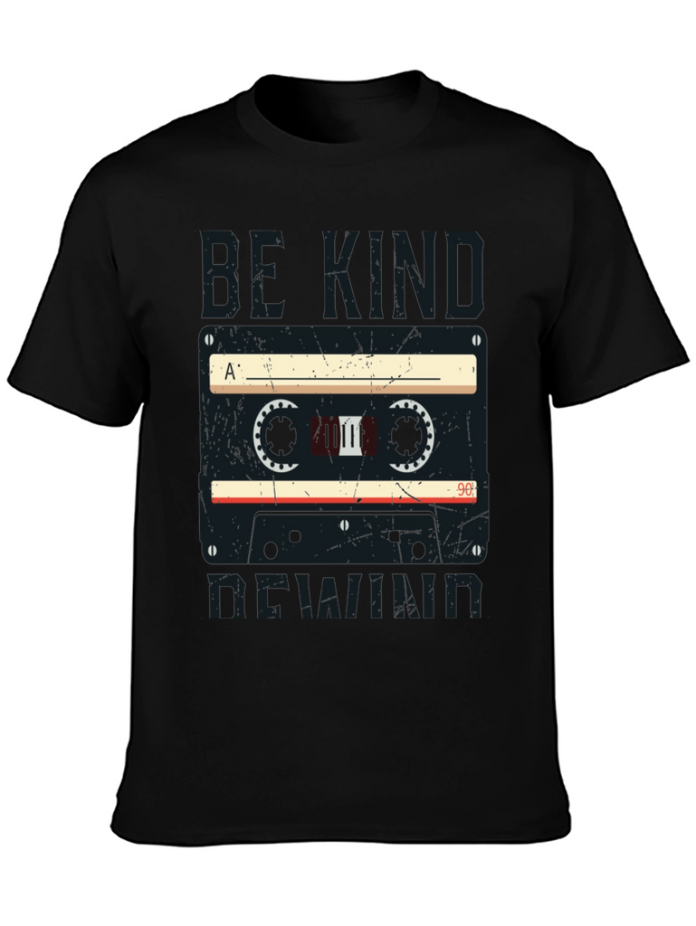Show off your love for vintage vibes with this eye-catching black t-shirt! Featuring a bold graphic of a classic audio cassette tape, complete with the phrase "Be Kind Rewind," it's a playful nod to the past. This comfortable, stylish tee is perfect for casual outings, music lovers, or anyone who appreciates retro aesthetics. Made from a soft, breathable fabric, it's designed for all-day comfort. Pair it with jeans or shorts for a relaxed, cool look. Make a statement and spread positivity with this unique and nostalgic graphic tee.
