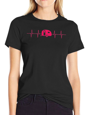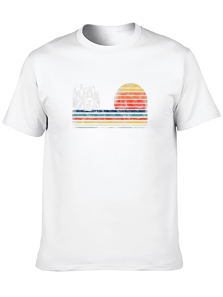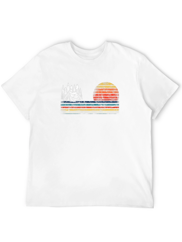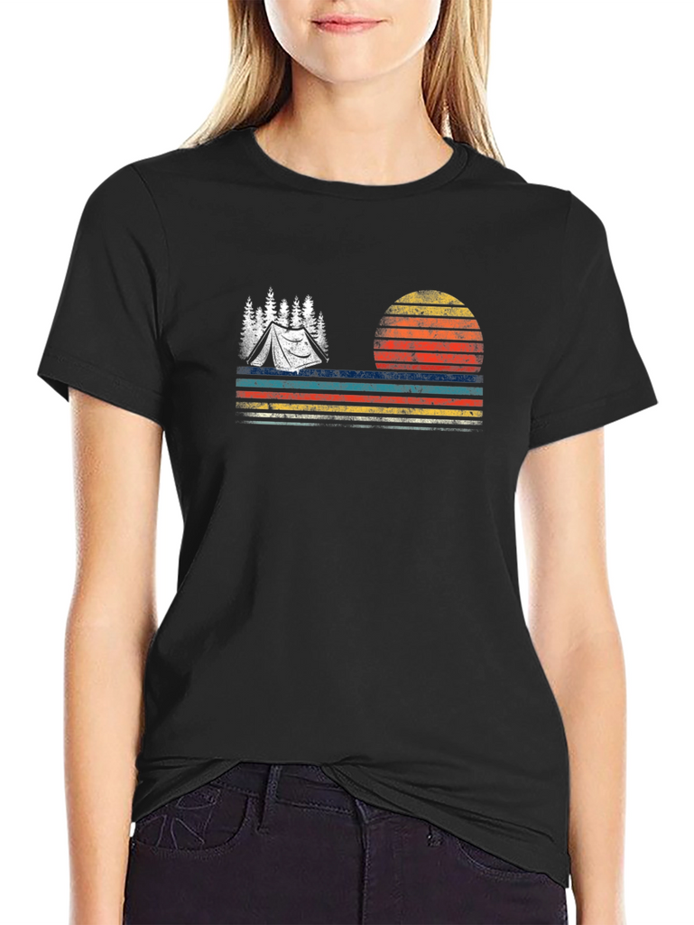 Embrace the outdoors with this vintage-inspired black t-shirt. The design features a stylized tent nestled amongst trees, set against a striking sunset backdrop with horizontal stripes. The retro color palette adds a touch of nostalgia, making it perfect for camping enthusiasts and nature lovers. This tee is ideal for casual wear, outdoor adventures, or as a unique gift. Made from comfortable materials, it's sure to become a wardrobe favorite. Show off your love for camping in style!