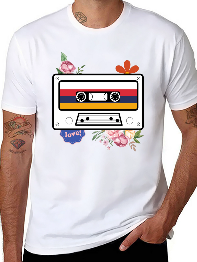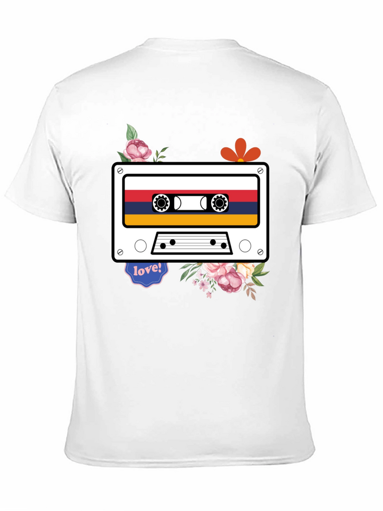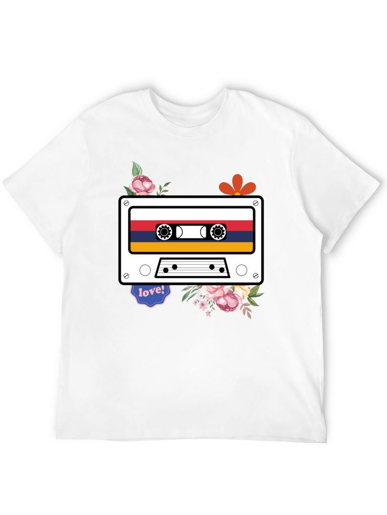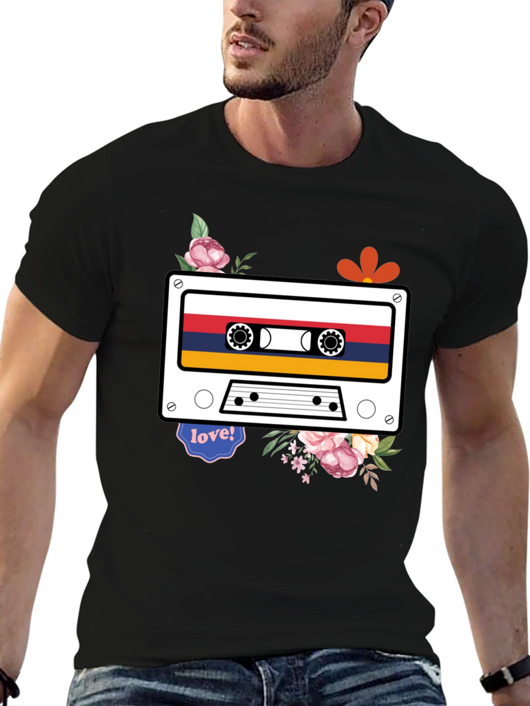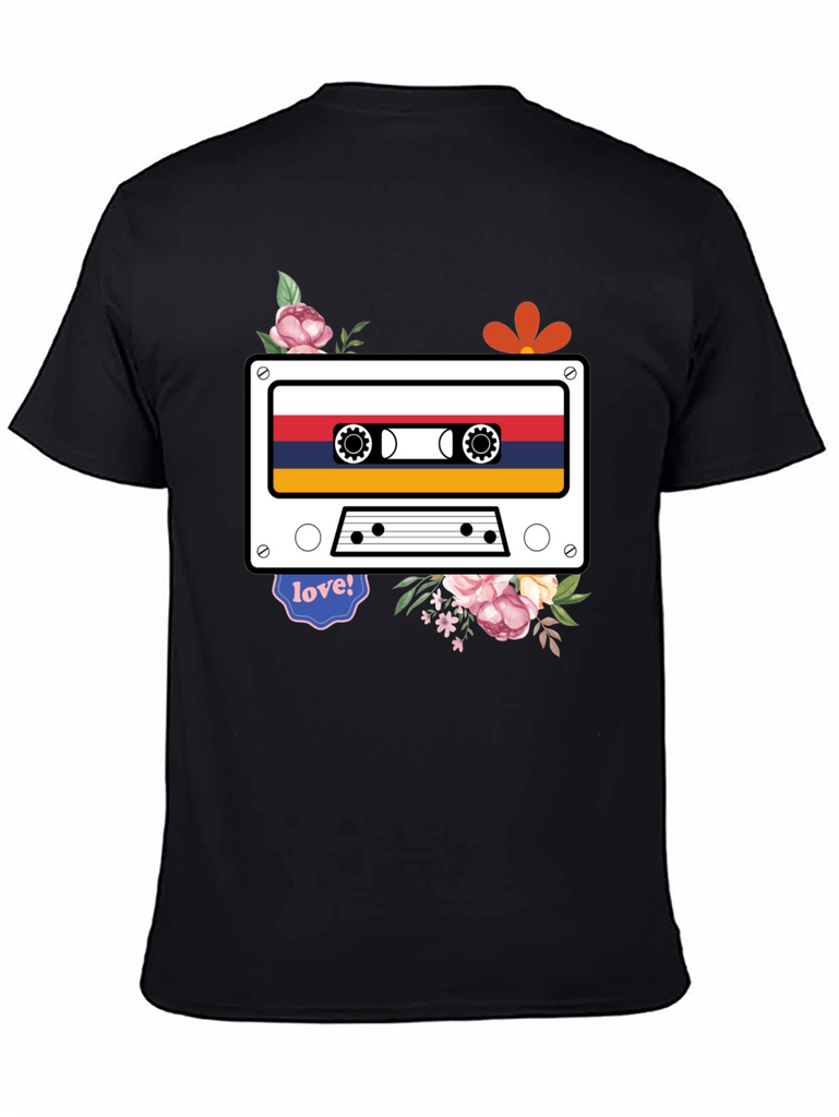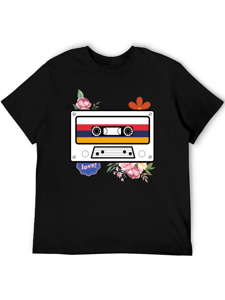 Show off your love for vintage vibes with this unique graphic tee. The black t-shirt features a prominent design of a cassette tape with a vibrant tricolor band. Accents of colorful flowers and a retro 'love!' badge surround the cassette, adding a touch of whimsy. The soft-looking fabric suggests a comfortable wear, making it perfect for casual outings, music lovers, or anyone with a passion for retro style. Dress up your wardrobe and spark conversation with this eye-catching tee!