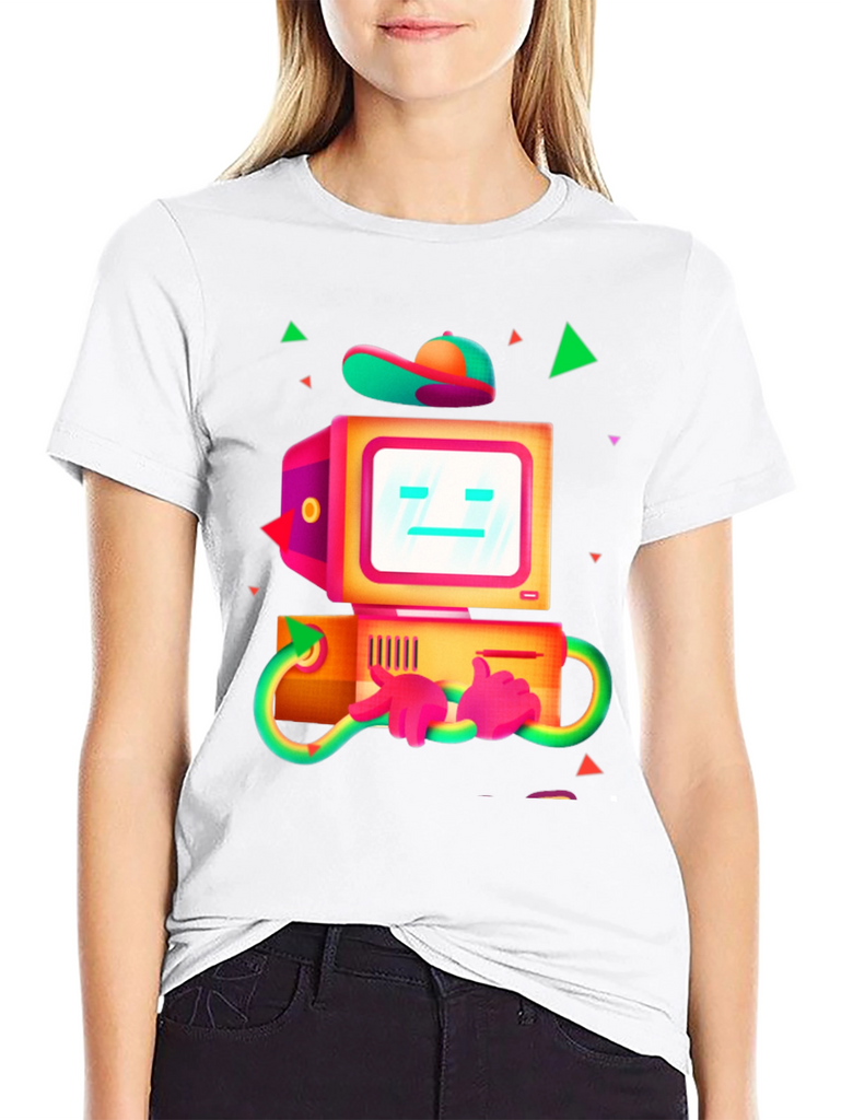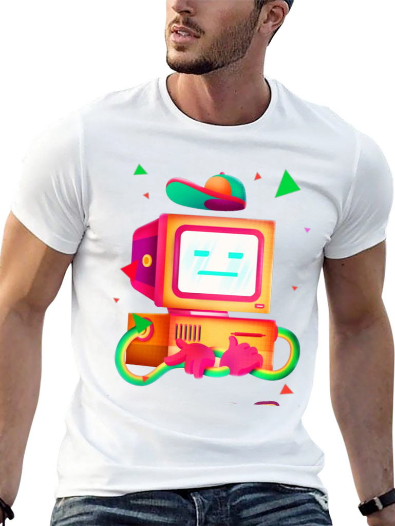 Show off your techy side with this unique graphic t-shirt! The black tee features a vibrant, cartoon-style illustration of a vintage computer robot. The design includes a boxy monitor with a simple face, a matching PC tower with hands and a baseball cap on top, and neon green accents. Perfect for casual wear, gaming events, or anyone who loves retro technology with a playful twist. Made from comfortable, breathable fabric for all-day wear, this eye-catching shirt is sure to spark conversations and turn heads.