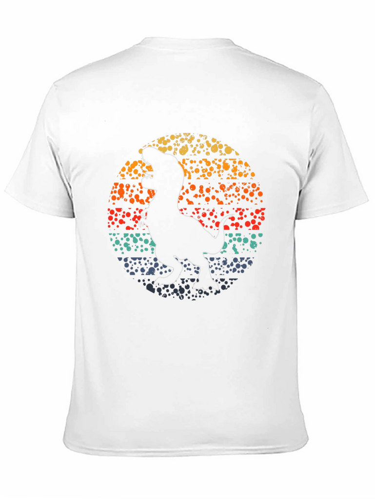 Roar into style with this eye-catching black t-shirt. Featuring a bold, retro-inspired design, this tee showcases a silhouette of a dinosaur set against a vibrant, dotted circle backdrop. The design incorporates a vintage color palette of yellow, orange, red, and teal for a trendy, worn-in look. Made from soft, comfortable cotton, this shirt is perfect for casual wear. Pair it with jeans or shorts for an effortlessly cool outfit. Ideal for dinosaur enthusiasts, vintage lovers, or anyone looking to add a unique piece to their wardrobe. Upgrade your style with this must-have graphic tee!